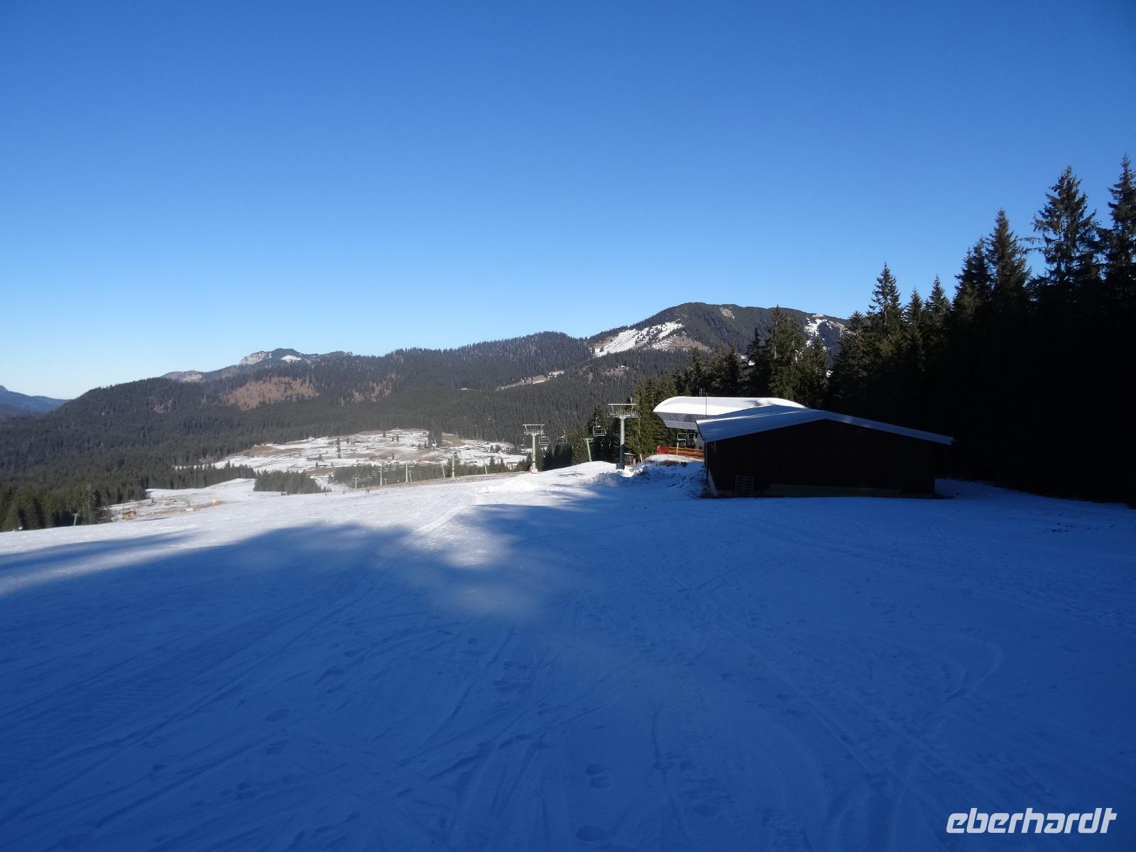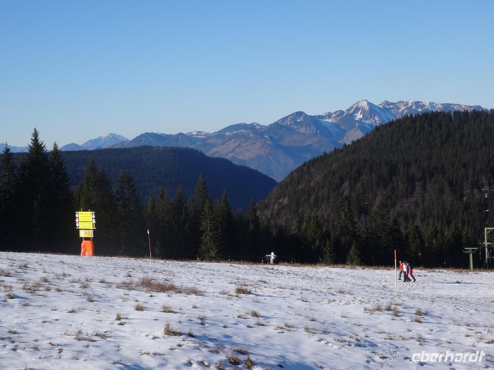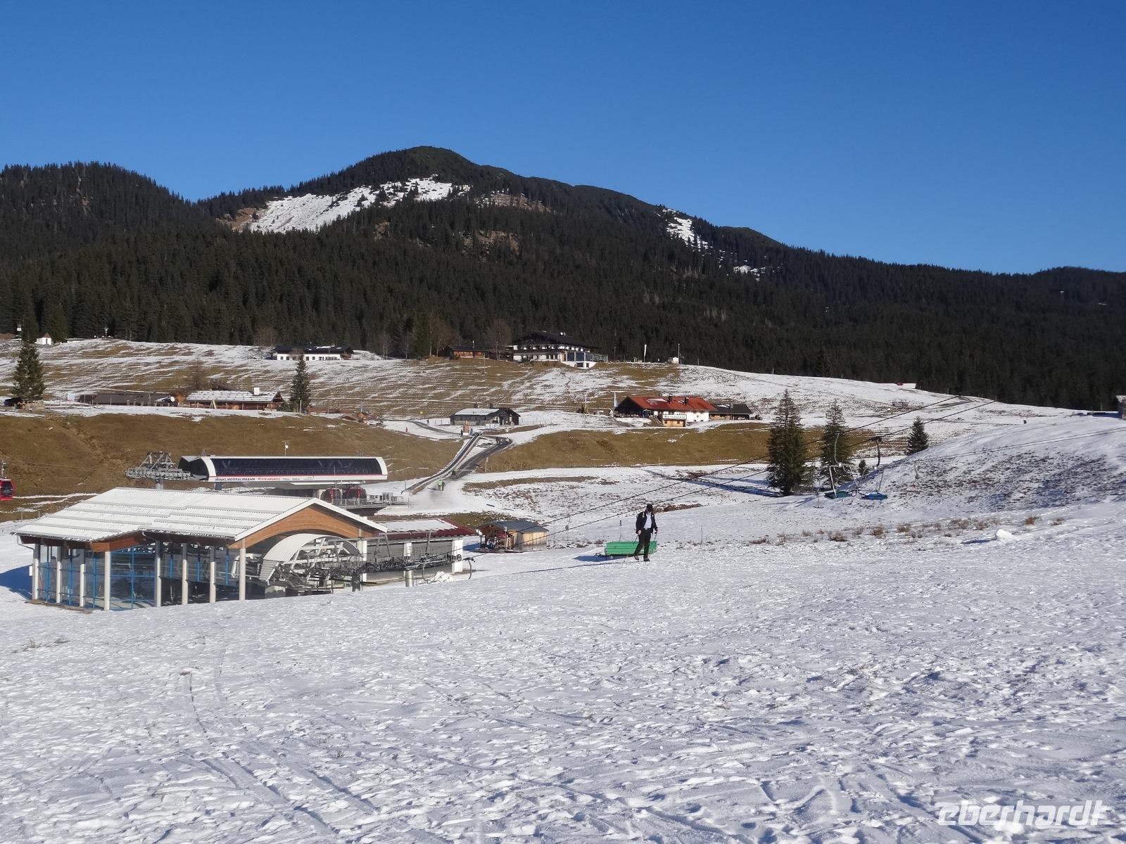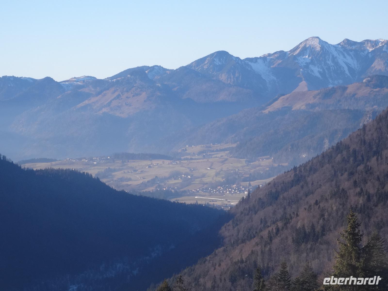 Nach einem Katerfrühstück starteten Sie mit dem Reisebus nach Traunstein, bereits auf der Reise war aller bestes Winter-Wetter, Raureif und leichter Schneegriesel, die Berge des Chiemgaus, des Berchtesgadener Landes oder weit nach Österreich zu den Loferer Steinbergen zeigten sich am Horizont. Über Siegsdorf und Ruhpolding, vorbei am Biathlontrainingszentrum und den Skischanzen erreichten Sie das Schwarzlofertal mit dem Parkplatz am Seegatterl zur Auffahrt mit der Kabinenbahn zur Winkelmoosalm.