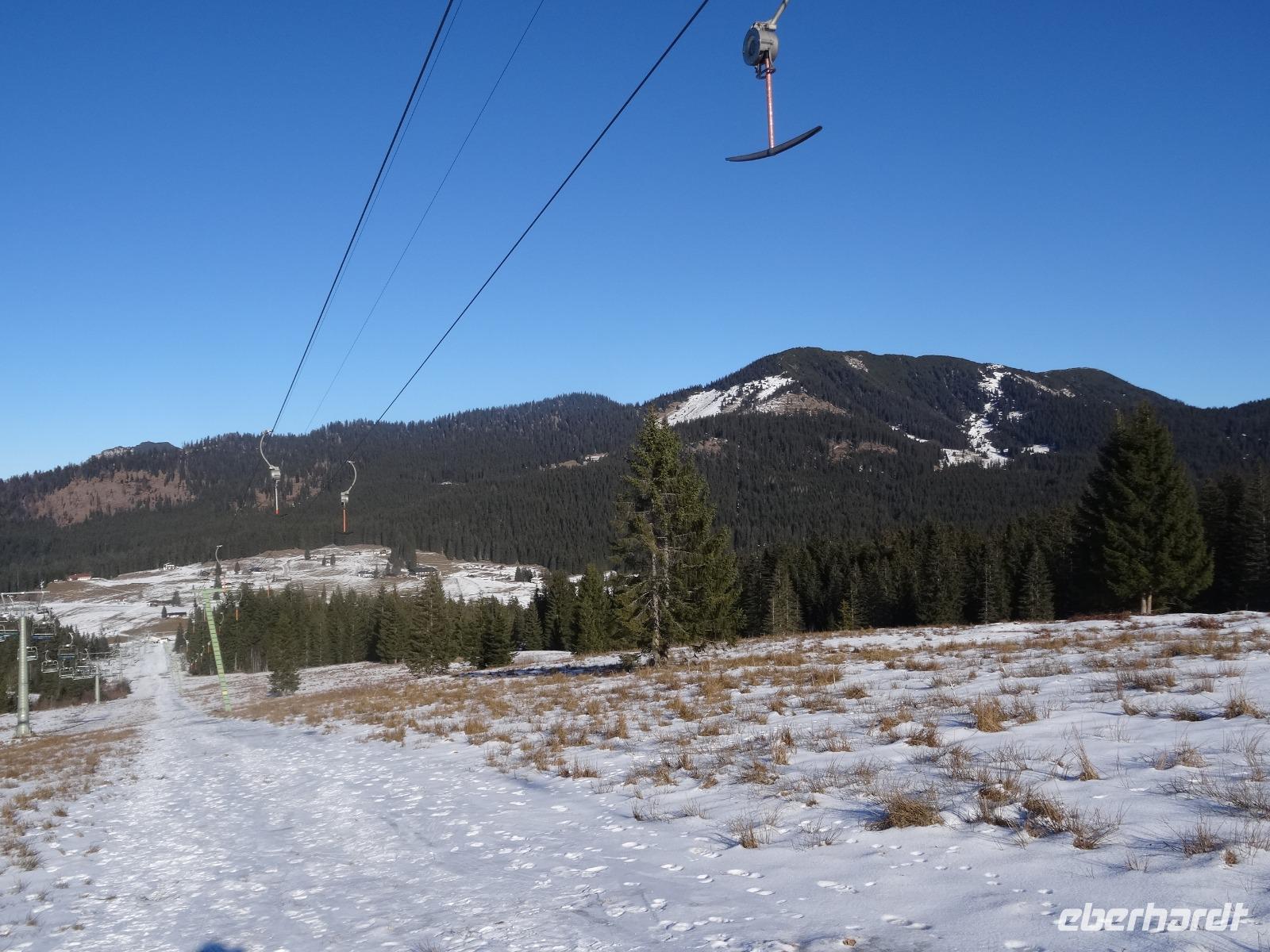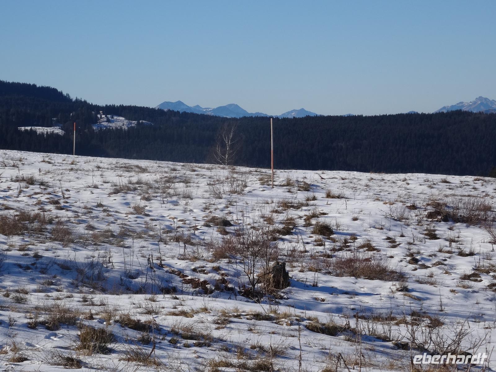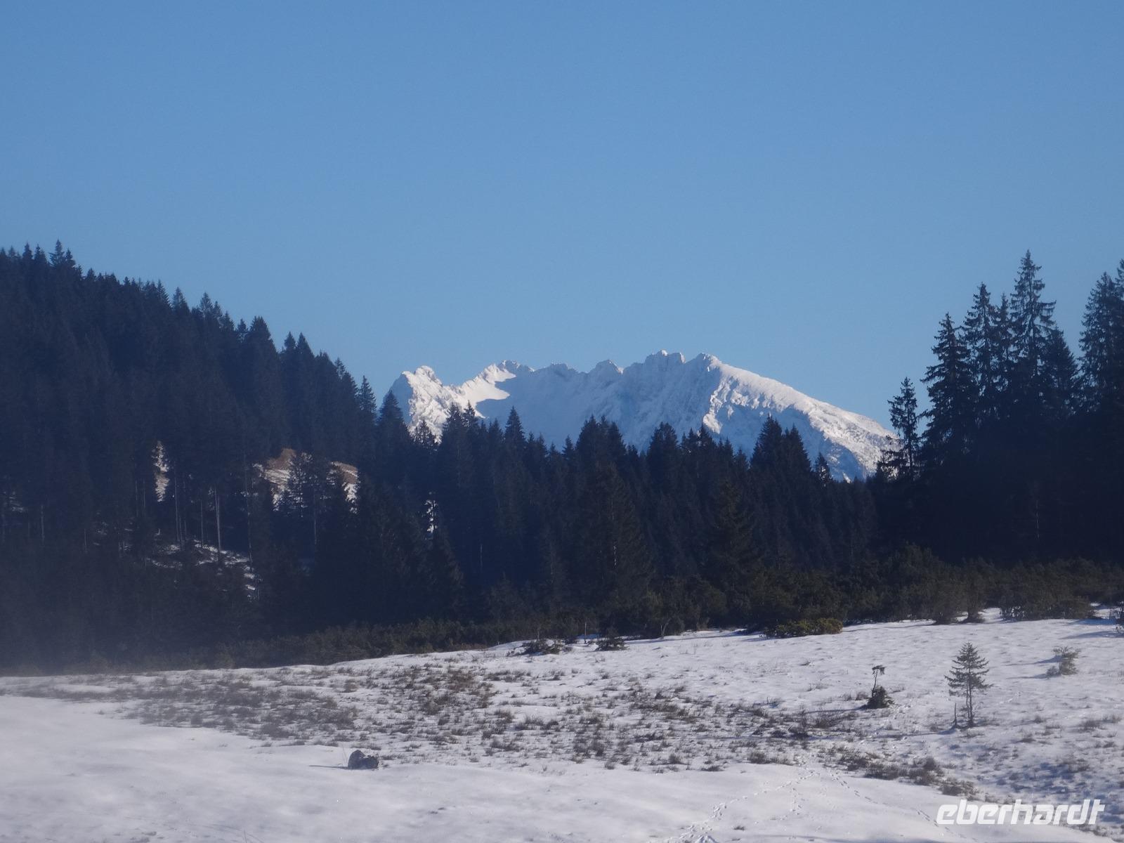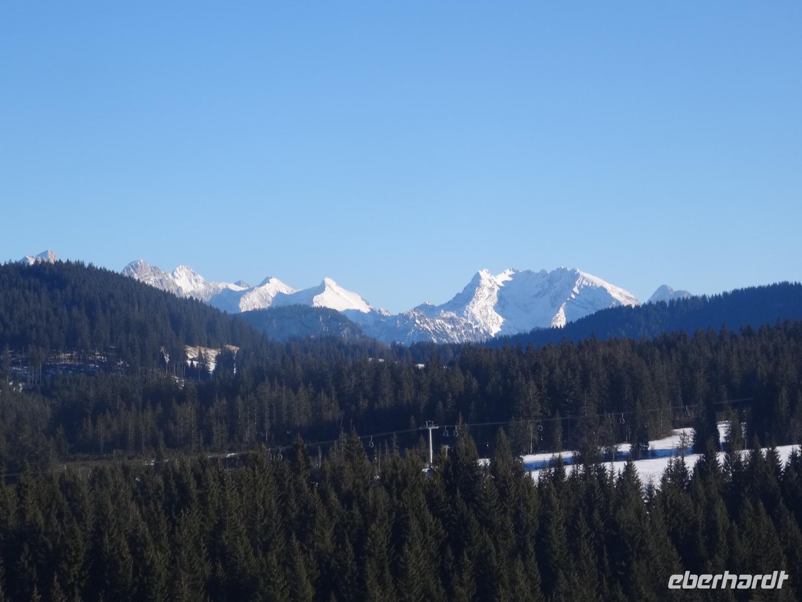 Nach einem Katerfrühstück starteten Sie mit dem Reisebus nach Traunstein, bereits auf der Reise war aller bestes Winter-Wetter, Raureif und leichter Schneegriesel, die Berge des Chiemgaus, des Berchtesgadener Landes oder weit nach Österreich zu den Loferer Steinbergen zeigten sich am Horizont. Über Siegsdorf und Ruhpolding, vorbei am Biathlontrainingszentrum und den Skischanzen erreichten Sie das Schwarzlofertal mit dem Parkplatz am Seegatterl zur Auffahrt mit der Kabinenbahn zur Winkelmoosalm.