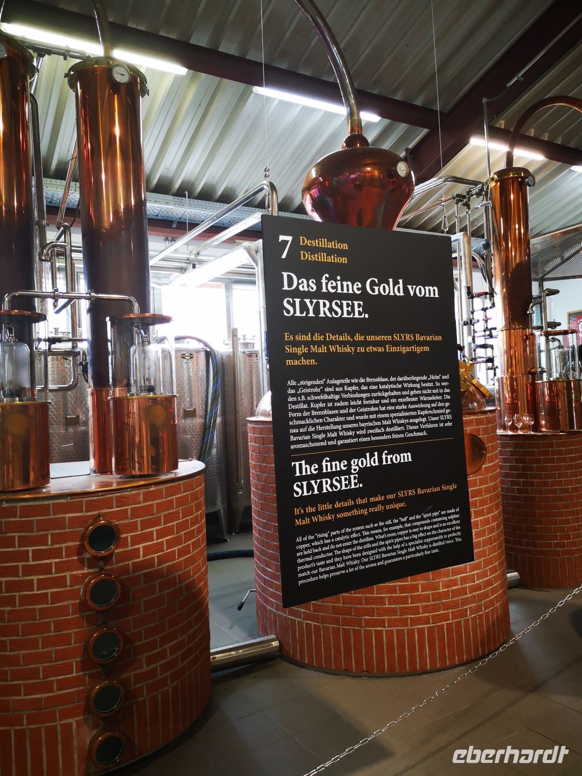 Unsere nächste Station war die Führung in der SLYRS Whisky Destillerie in Schliersee, die zu den bekanntesten Whiskybrennereien in Deutschland gehört, der erste Whisky floß bereits 1999 aus den dortigen Brennblasen . Inzwischen wurde dort eine hochmoderne Anlage und ein komplexes Whiskylager geschaffen, wir staunten nicht schlecht, als wir erfuhren, dass bestimmte Whiskyarten 12 Jahre lagern müssen, um die gewünschte Qualität zu erreichen. Die anschliessende Verkostung nahmen wir dankbar und mit Respekt entgegen.