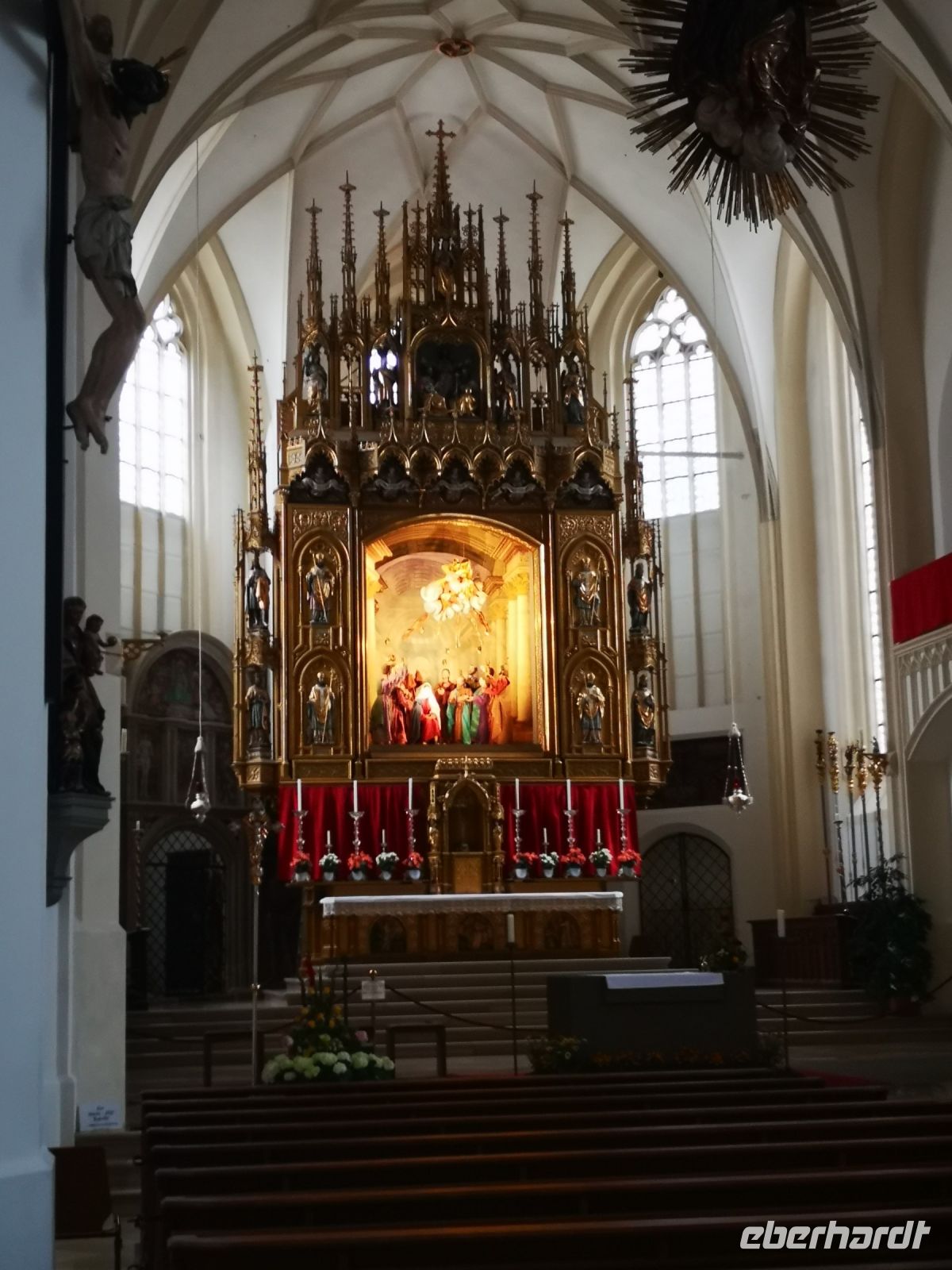 Um etwas trocken zu stehen, gingen wir nach oben auf den Gries in die katholische Pfarrkirche Maria Himmelfahrt, die auch als Dom des Isarwinkels bezeichnet wird. Sie ist das älteste Bauwerk des Isarwinkels .Sie war bei einem Brand 1453 völlig zerstört worden, im Jahre 1466 erfolgte der Wiederaufbau.