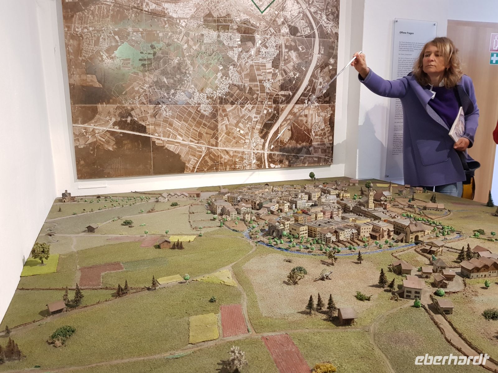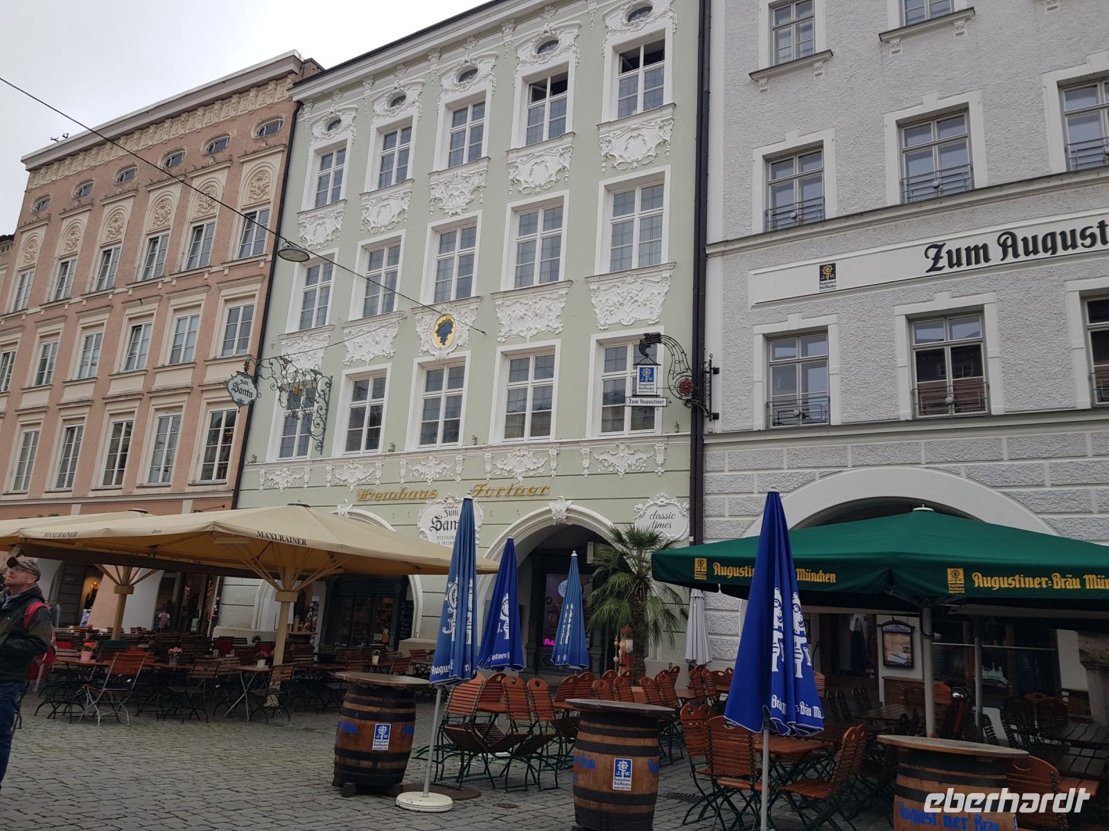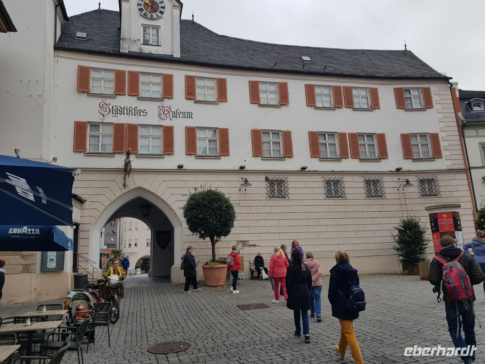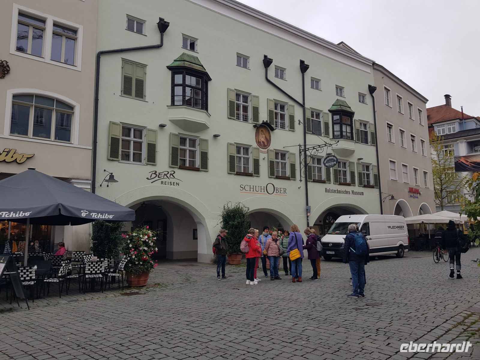 Heute starten wir nach dem Frühstück bei + 2 Grad nach Rosenheim und spüren den Temperaturunterschied zum Vortag hautnah. Die Gästeführerin in Rosenheim empfängt uns unmittelbar am Plakat zum "Aushänger" der Stadt - die Serie "Rosenheim Cops". Und natürlich spielt das zu Beginn unserer Führung eine Rolle, vor allen für die Gäste, die sich mehr oder weniger als Fans der Serie outen. Und da sind wir direkt vor Ort, am ehemaligen Lokschuppen, gegenüber befindet sich der ehemalige Bahnhof - jetzt das Rathaus - welches in der Serie das Polizeipräsidium darstellt. Wir verlassen die "Rosenheim Cops" und wenden uns der Geschichte und anderen Sehenswürdigkeiten zu. "Wenn Sie mir bitte folgen wollen" , so heisst es immer wieder beim Spaziergang durch die Altstadt. Da ist doch etwas hängengeblieben von der Serie, das ist nämlich Michis Spruch am Ende der Folge. Zunächst gehen wir mit der Stadtführerin durch den RIEDERGARTEN, der 1729 aus dem Heilkräutergarten des Stadtapothekers entstand und heute als eine grüne Oase mitten im Stadtzentrum sehr beliebt ist. Weiter geht es zum Max-Josefs-Platz mitten im Herz der Stadt. Schöne restaurierte alte Bürgerhäuser laden zum Verweilen ein. Von den alten Stadttoren der Stadt ROSENHEIM ist als einziges das MITTERTOR erhalten. Dort befindet sich heute das Städtische Museum, in dem wir noch einen Blick auf das Stadtmodell werfen können.