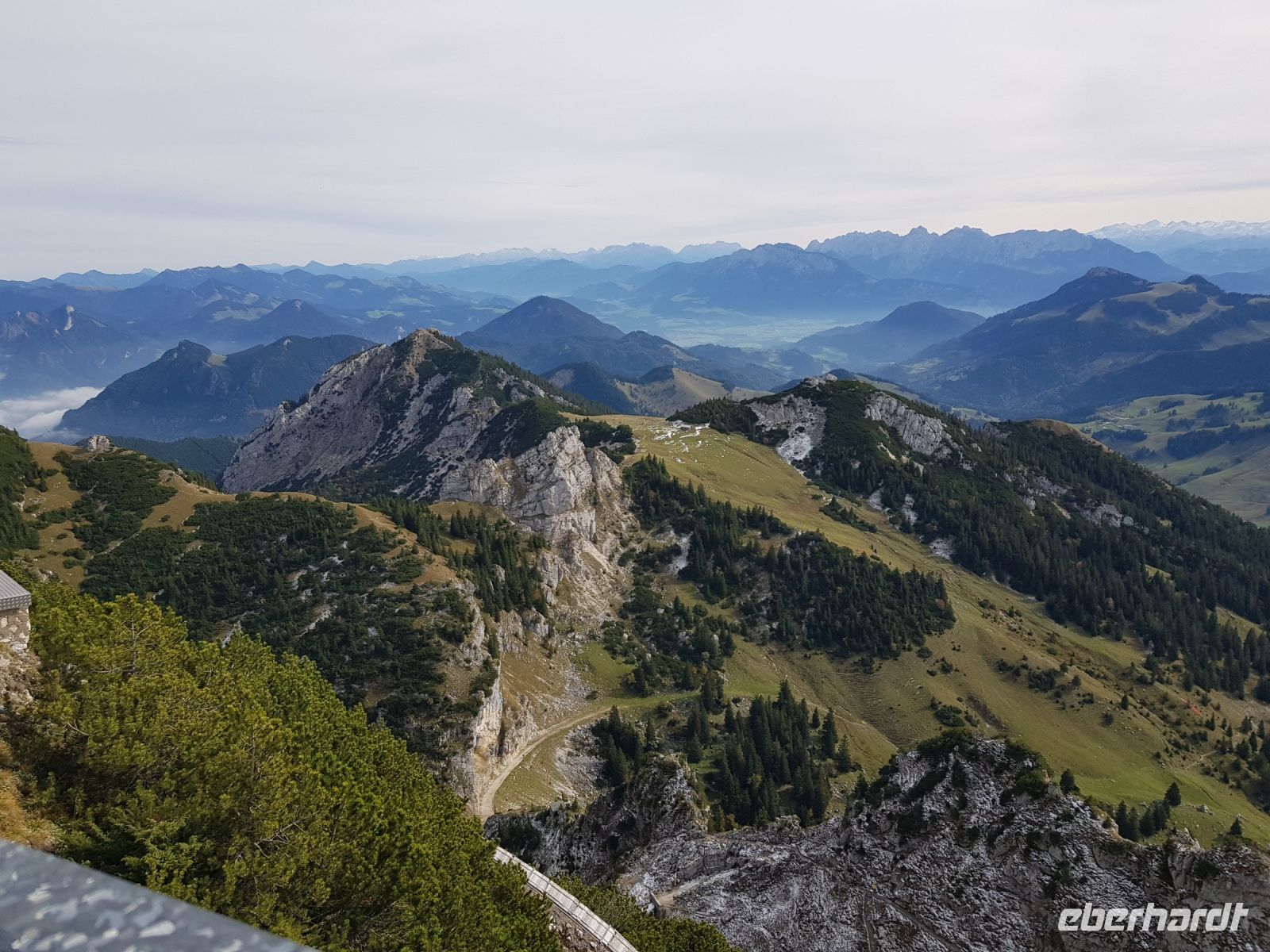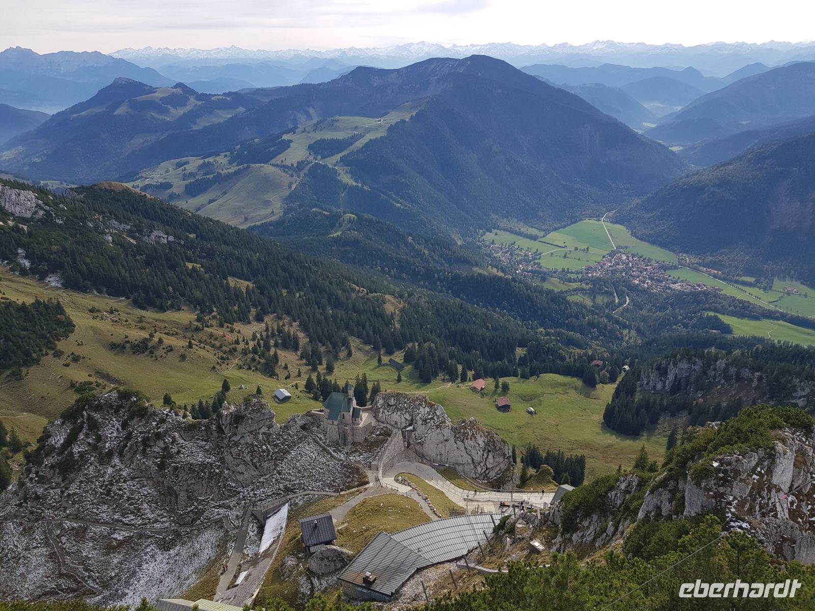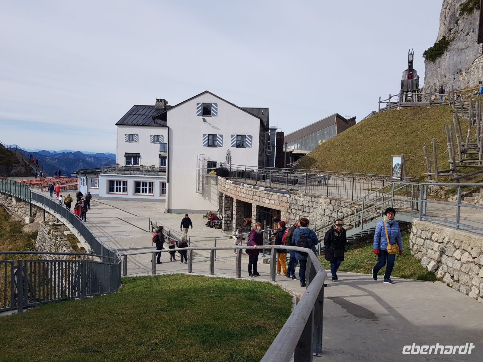 Weiter fahren wir mit unserem Bus nach Brannenburg. Inzwischen ist es wärmer geworden und die Sonne scheint auch. 12 Uhr steigen wir in die Zahnradbahn, die uns in einer halben Stunde auf den Wendelstein bringt. Oben angekommen, haben wir reichlich Zeit, um das Gelände ringsherum zu erkunden, einen Blick in die Kirche zu werfen und auf verschiedenen Aussichtsplattformen das Alpenpanorama zu bewundern. Einige Gäste machen sich gleich auf den Weg zum Gipfel.