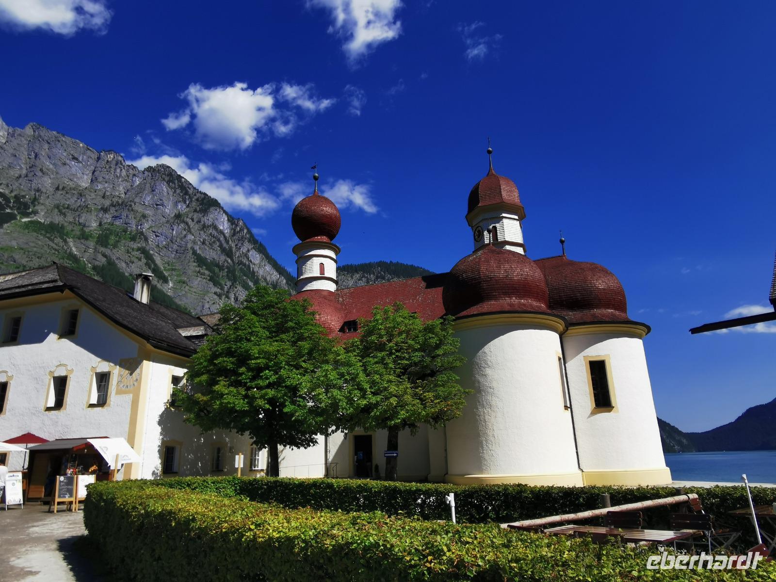 Das beliebteste Ziel des Sees, welches man nur vom Wasser aus erreichen kann, ist die Kirche St. Bartholomä mit ihren charakteristischen runden roten Türmchen. Im Jahre 1134 wurde die "Basilica Chunigese" zu Ehren der Heiligen Dreifaltigkeit und der Jungfrau und Muttergottes Maria geweiht. Anfang des 16. Jahrhunderts taucht dann der neue Kirchenname "St. Bartholomäus" auf, und der barocke blattförmige Dreikonchenbau von heute entstand schließlich Ende des 17. Jahrhunderts.