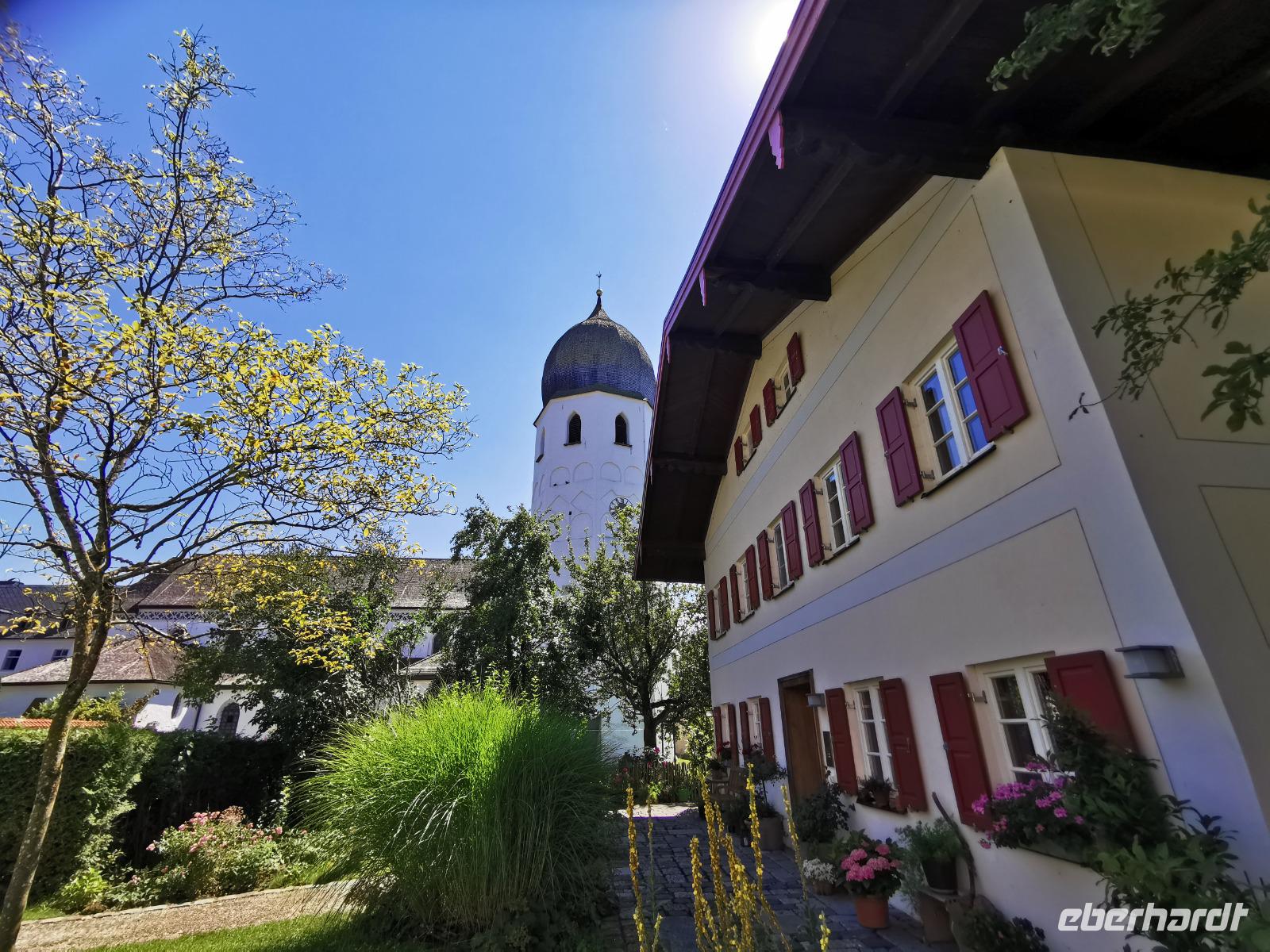 Am Nachmittag fahren wir weiter zur kleinen Fraueninsel. Hier ließ Tassilo III. von Bayern 782 das Kloster Frauenwörth errichten, welches der Insel ihren Namen gab. Auf 15 Hektar leben heute etwa 300 Einwohner, Auto- und Radverkehr sind nicht erlaubt und so schlendern die Gäste ungestört auf dem Inselrundweg, die kleinen Läden locken mit Töpferwaren und handgefertigten Souvenirs und die meisten gönnen sich geräucherten Fisch und suchen ein schattiges Plätzchen zur Entspannung.
