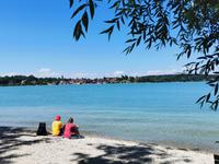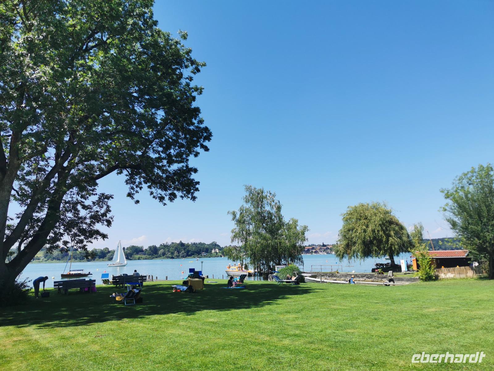 Bei hochsommerlichen 32 Grad im Schatten zog es einige Gäste magisch ins glasklare Wasser zur Erfrischung und andere machten einen Spaziergang entlang des Ufers.