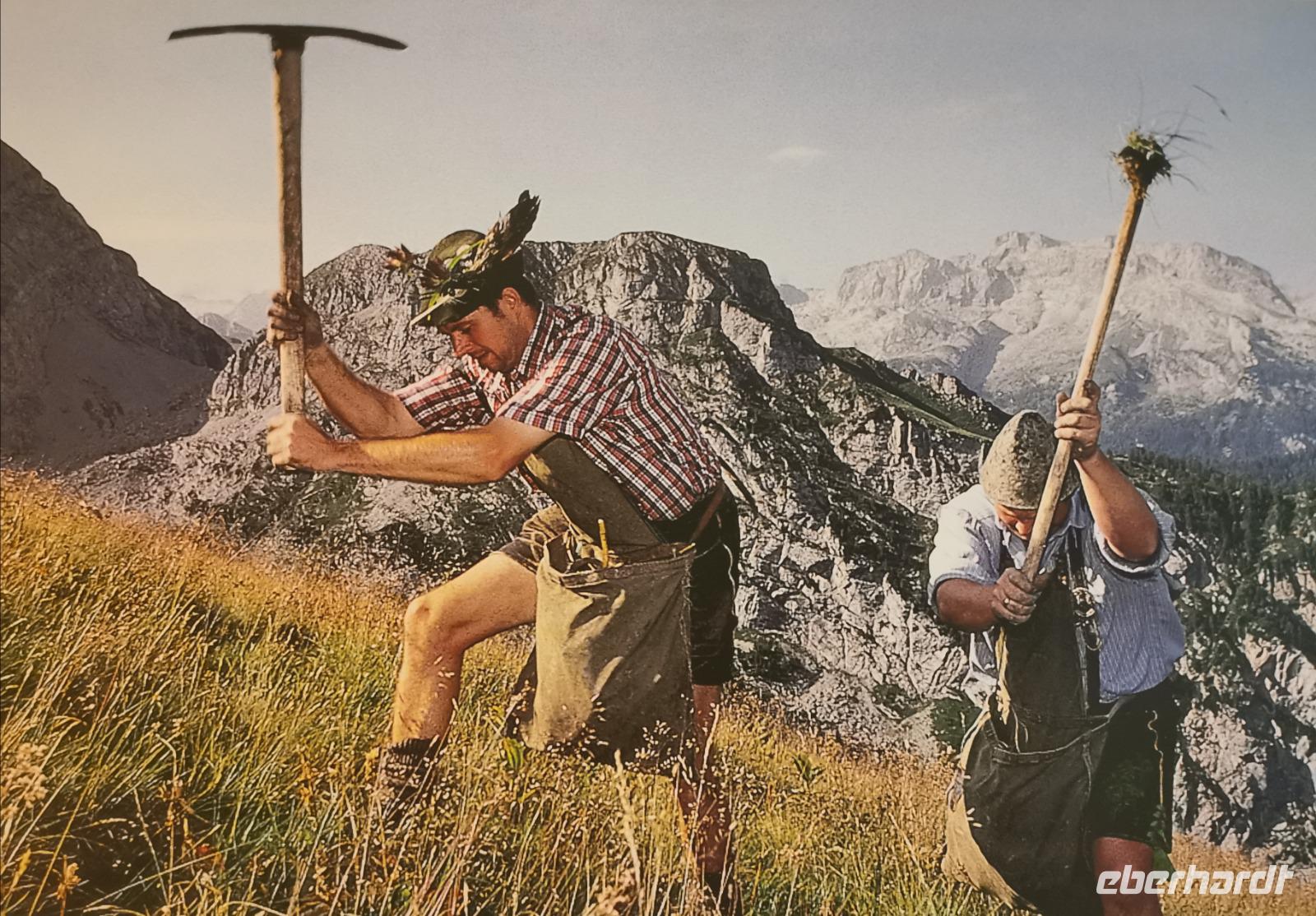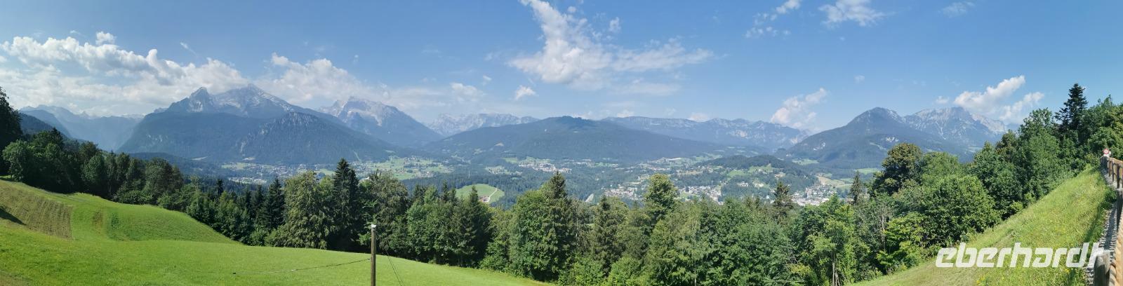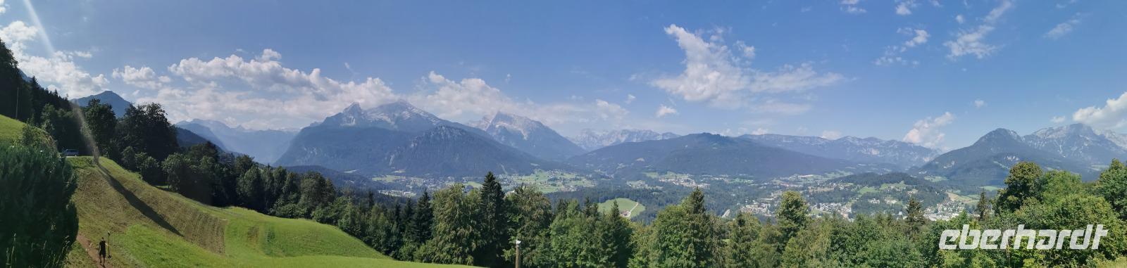 Danach fahren wir bei tropischen Temperaturen auf den Obersalzberg, wo Adolf Hitlers einstiges Führersperrgebiet war. Außer dem Kehlsteinhaus, seiner Teestube, ist von der Nazivergangenheit hier nichts mehr geblieben. Wir kehren in einer zünftig bayerischen Bergklause ein, bekommen traditionelle Pfannkuchensuppe und eine deftige Brotzeit. Alles wird gekrönt von einem bezaubernden Ausblick auf den Watzmann und die Berchtesgadener Alpen.