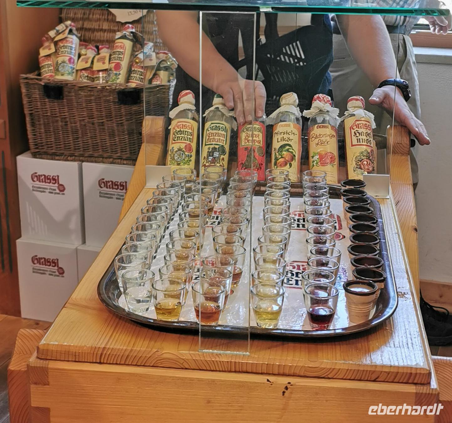 Den heutigen Morgen beginnen wir ganz zünftig mit einer Schnapsverkostung bei der ältesten Enzianbrennerei Deutschlands, Familie Grassl in Berchtesgaden. Hier erfähren wir, wie dieses verschiedenen Brände in mühevoller Handarbeit gewonnen werden und im Souvenirshop dürfen wir probieren und natürlich auch ein Andenken mitnehmen.