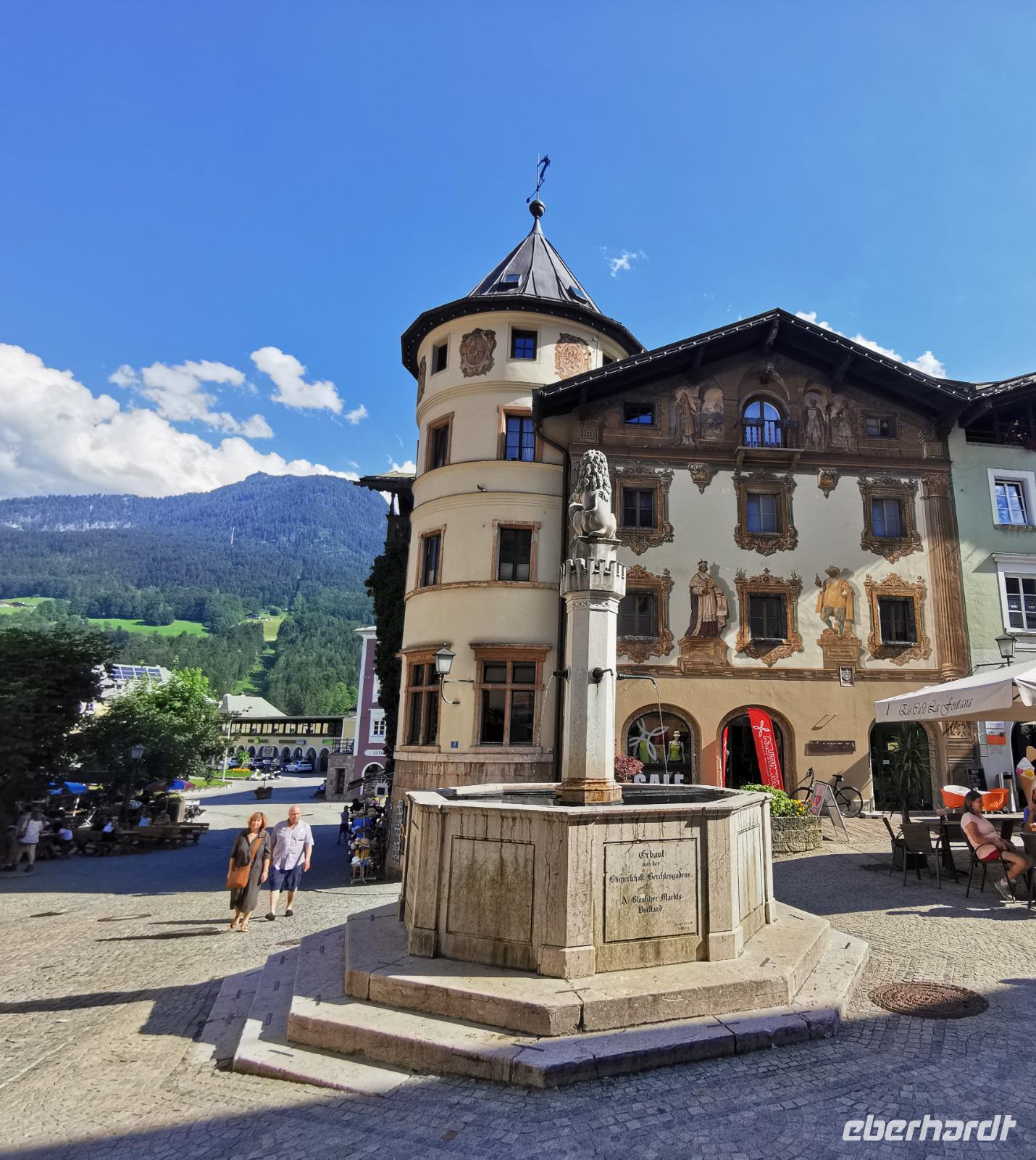 Als wir wieder ans Tageslicht kommen, erschlagen uns die draußen herrschenden 32 Grad förmlich. Trotzdem bummeln wir noch durch die romantische Altstadt von Berchtesgaden, am Markt vorbei zum Schloß, welches 1102 als Chorherrenstift von den Augustinern gegründet wurde. Im Verlauf der nächsten Jahrhunderte wurde das Stift durch den Salzbergbau wohlhabend und erlangte die Reichsfreiheit. Jedoch, wie alle bayrischen Klöster, wurde auch dieses im Zuge der Säkularisation aufgehoben. Vom einstigen Glanz zeugt heute noch das Gebäudeensemble mit der Stiftkirche St. Peter und Johannes der Täufer und ihren zwei 53 Meter hohen Türmen. Heute gehört es zum Eigentum des Wittelsbacher Ausgleichsfonds.