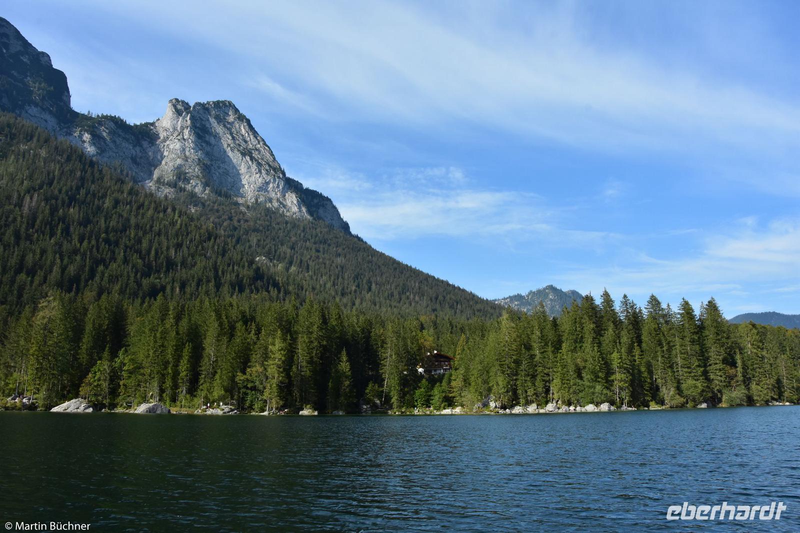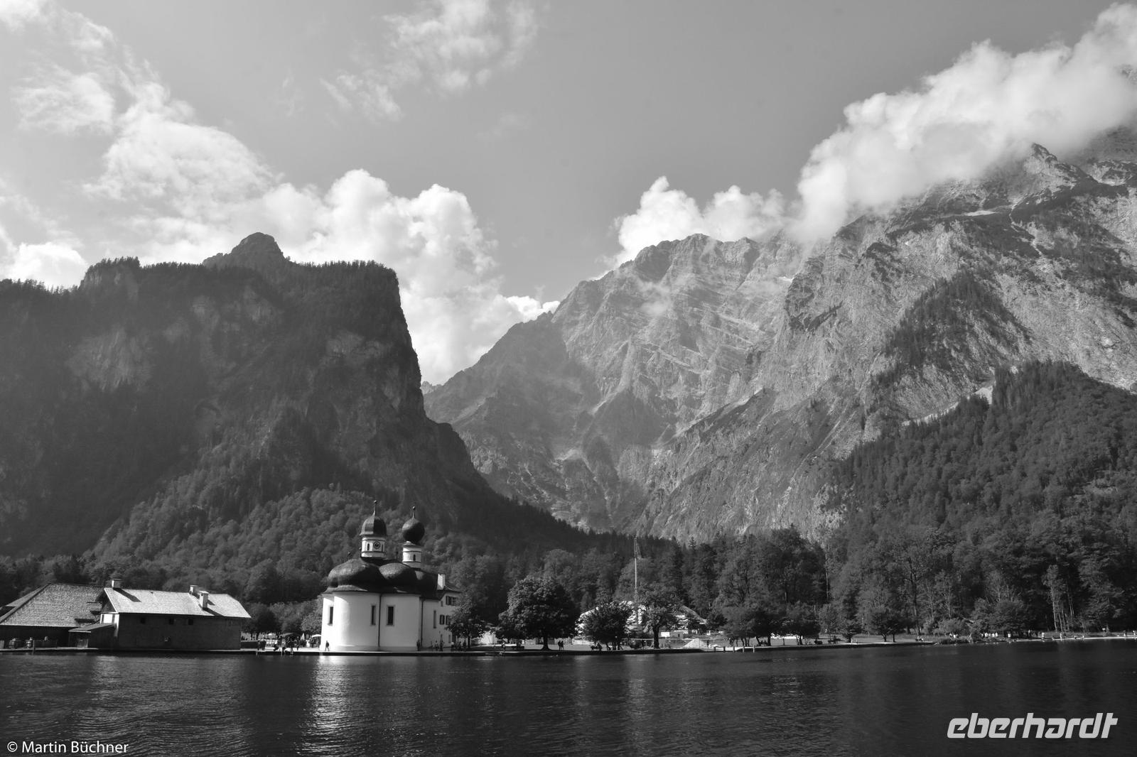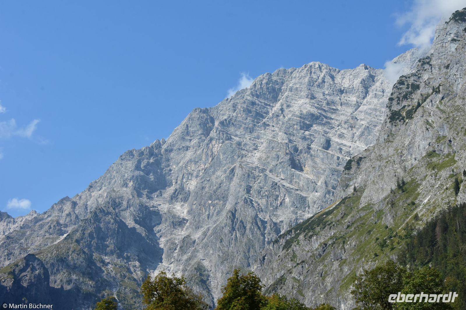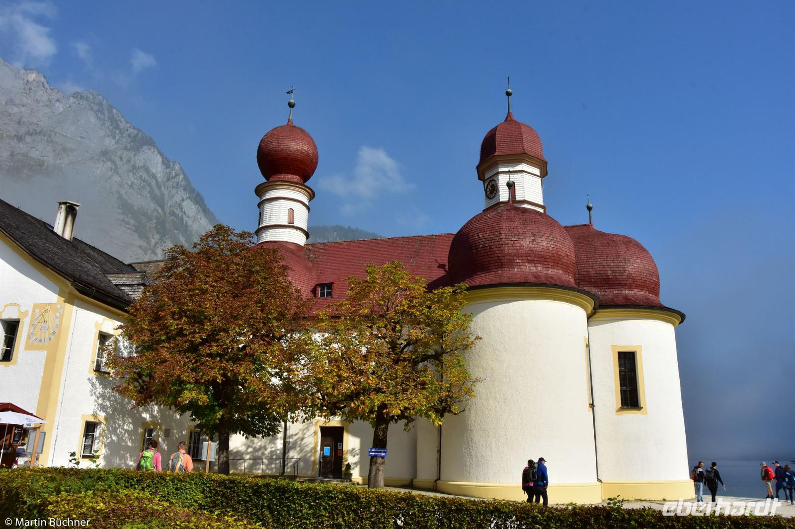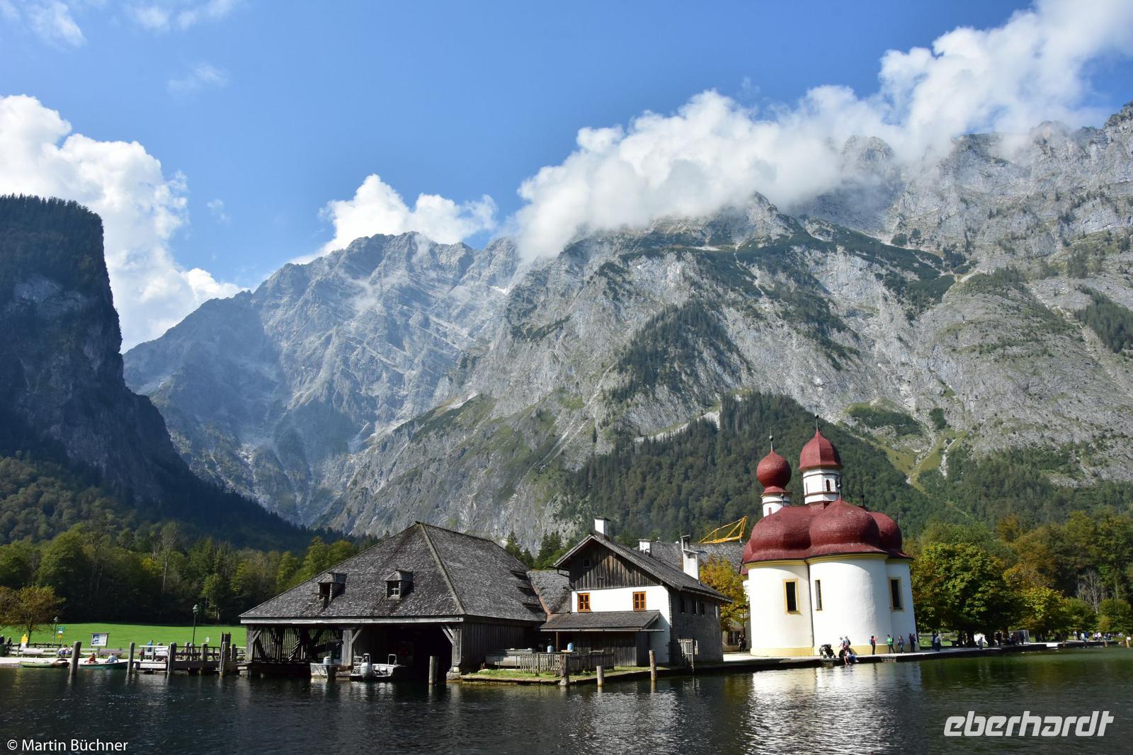Wir erreichen St. Bartholomä, es zählt ganz sicher zu den schönsten Fotomotiven Deutschlands. Bei einem gemütlichen Spaziergang erkunden wir die fantastische Gegend. Der Nebel hebt sich erst und löst sich dann komplett auf und gibt den Blick frei auf die gewaltige Watzmannostwand, die höchste senkrechte Felswand in den Ostalpen. Mit ihren über 1.800 Meter Fels zählt sie ohne Weiteres in die Top10 der spektakulärsten und höchsten Felswände der Alpen. Höhendifferenzen von 2.000 m zwischen Talsohle und Bergspitzen sind in den Deutschen Alpen und im gesamten Ostalpenraum sehr selten, man findet sie in der Regel nur an den 4.000er Gipfeln der Schweizer und Französischen Westalpen.