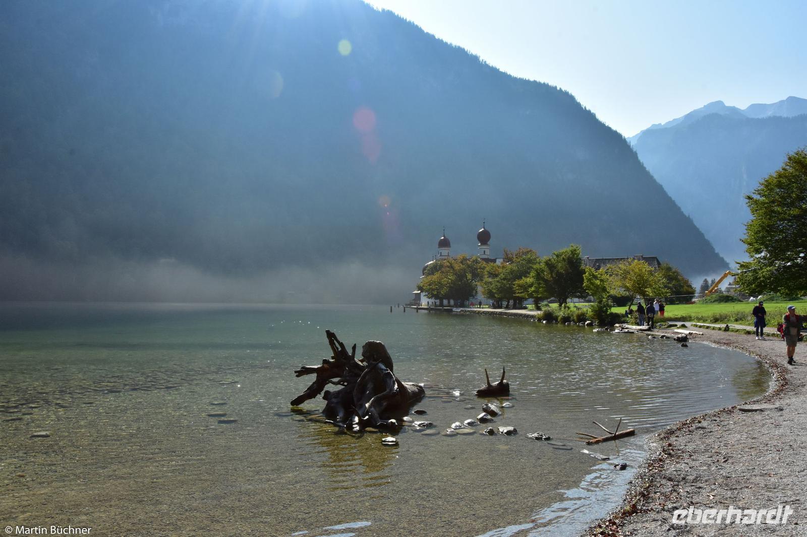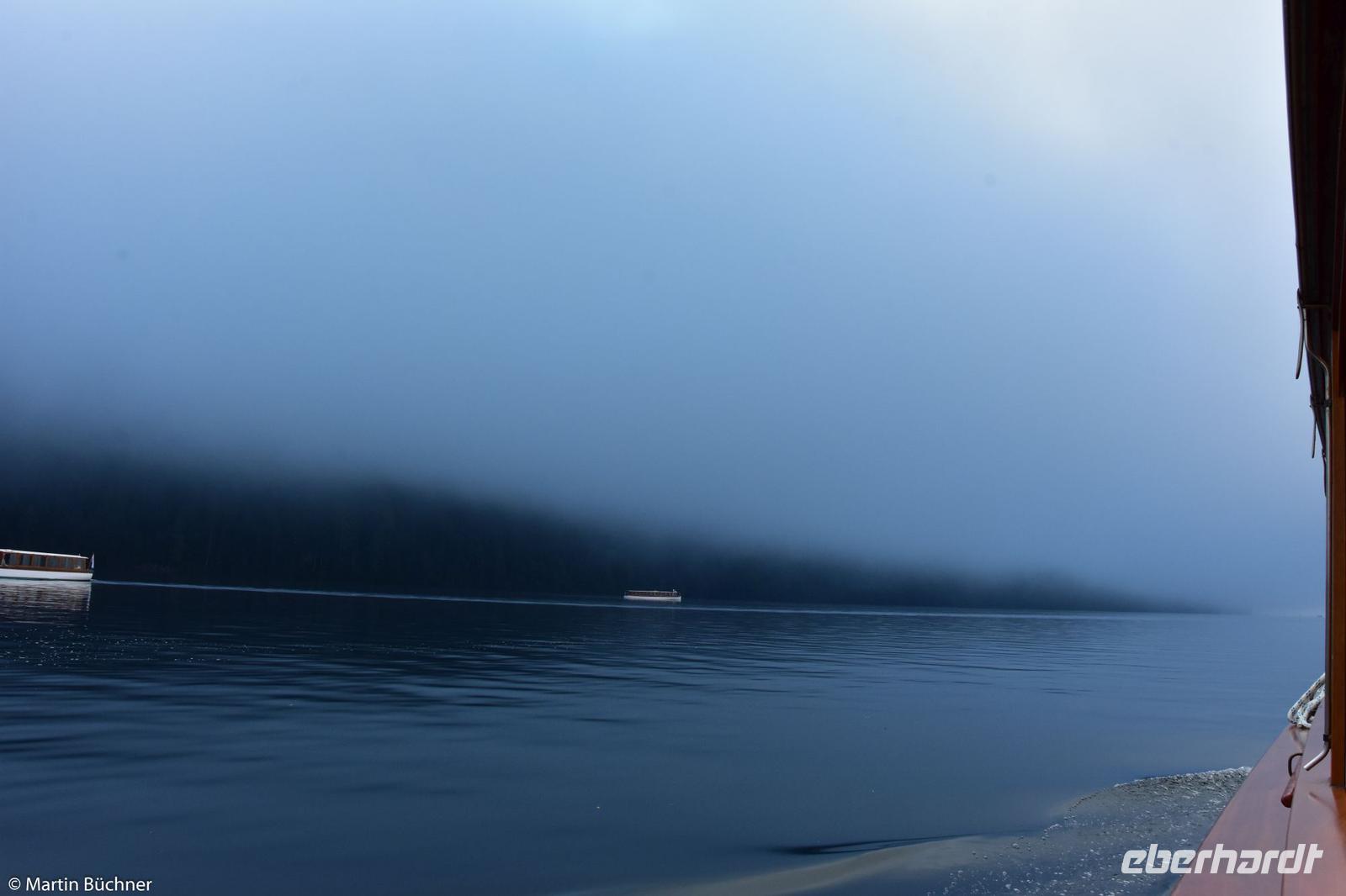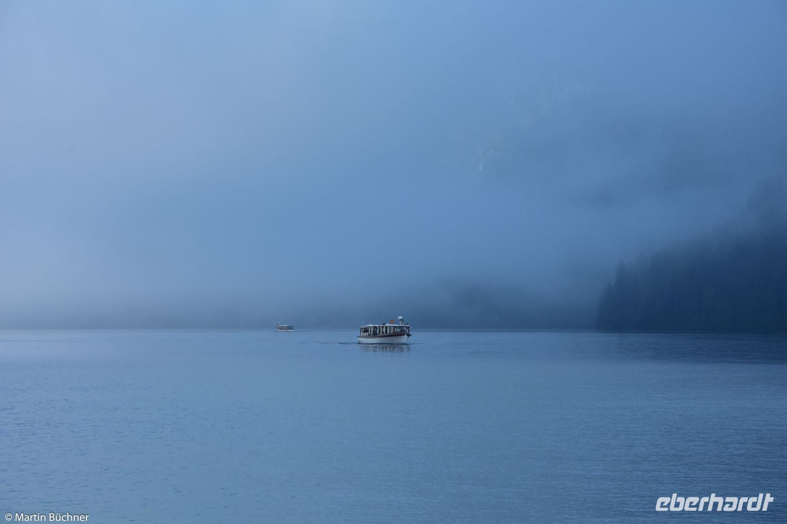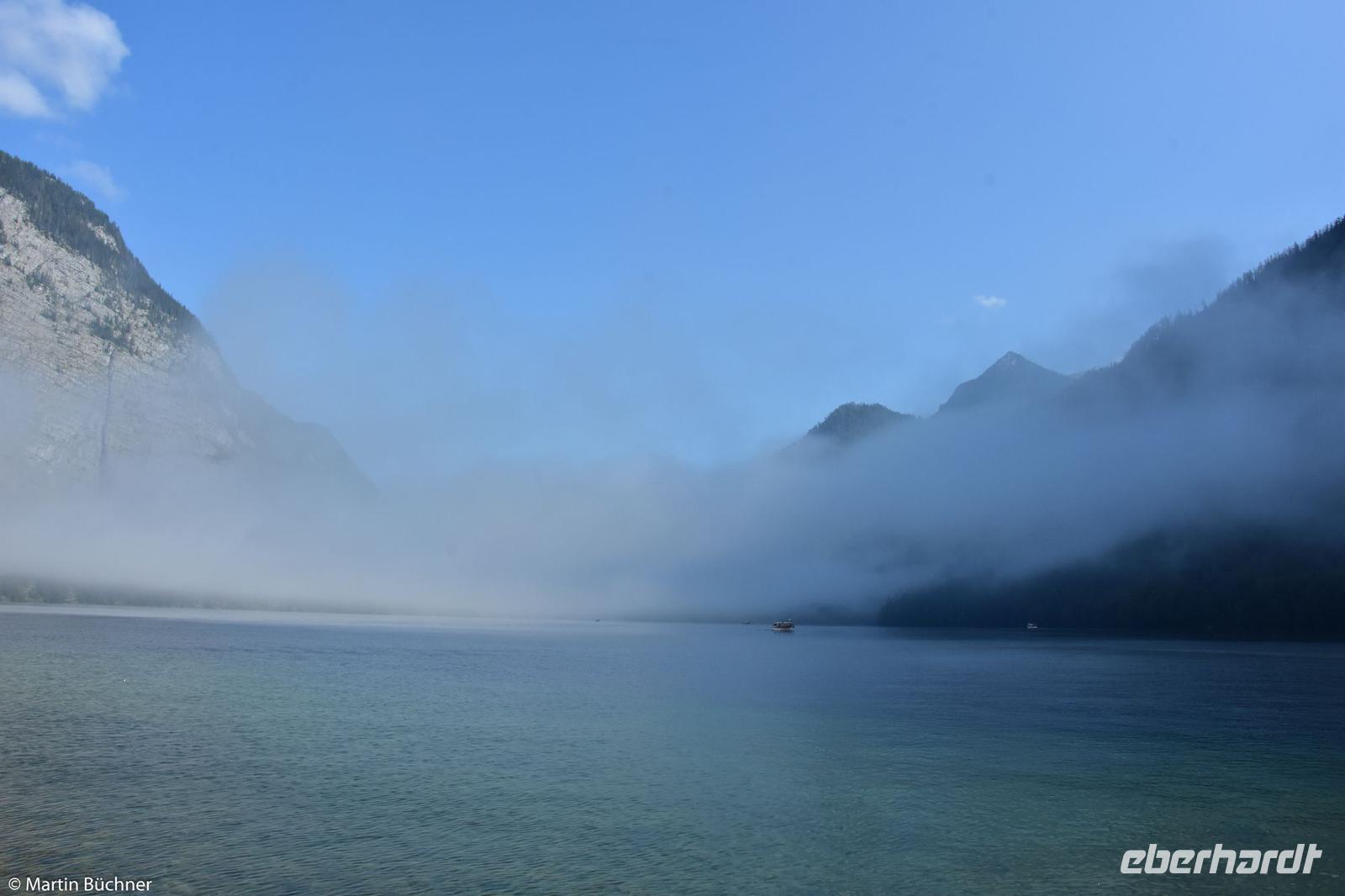 Wir starten heute über die Landstraße nach Berchtesgaden zum weltberühmten Königssee, über Übrigen wird der See mit einem Dehnungs „s" geschrieben, folglich verdoppelt sich dieser Buchstabe. Wir erreichen den See am frühen Morgen, es ist noch wenig los. In mystischem Nebel ist der Königssee und die Familie Watzmann getaucht. Meter um Meter verschwindet der Nebel. An der Echowand schmettert der Trompeter gegen die Felswand, doch diese wirft es zurück!?