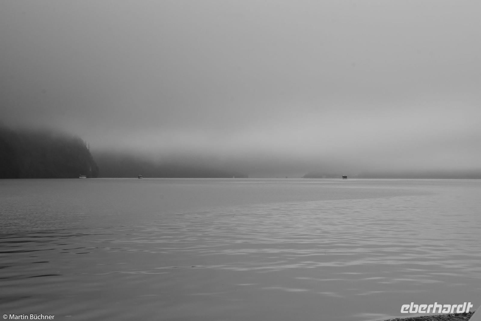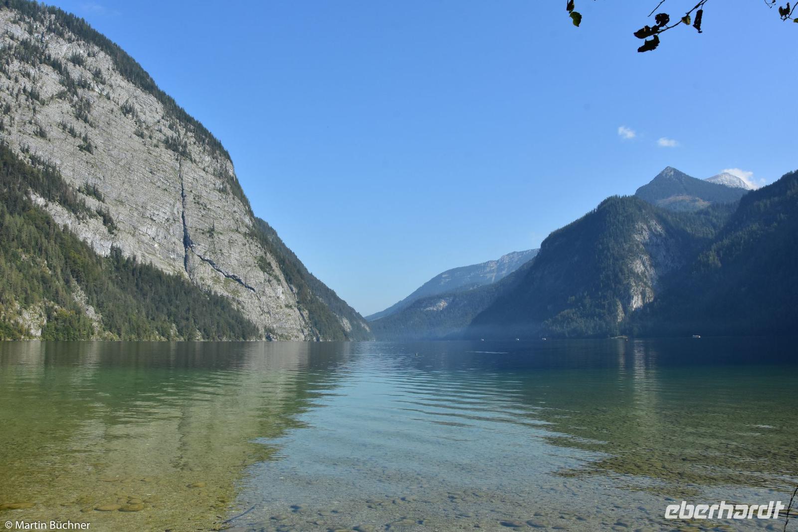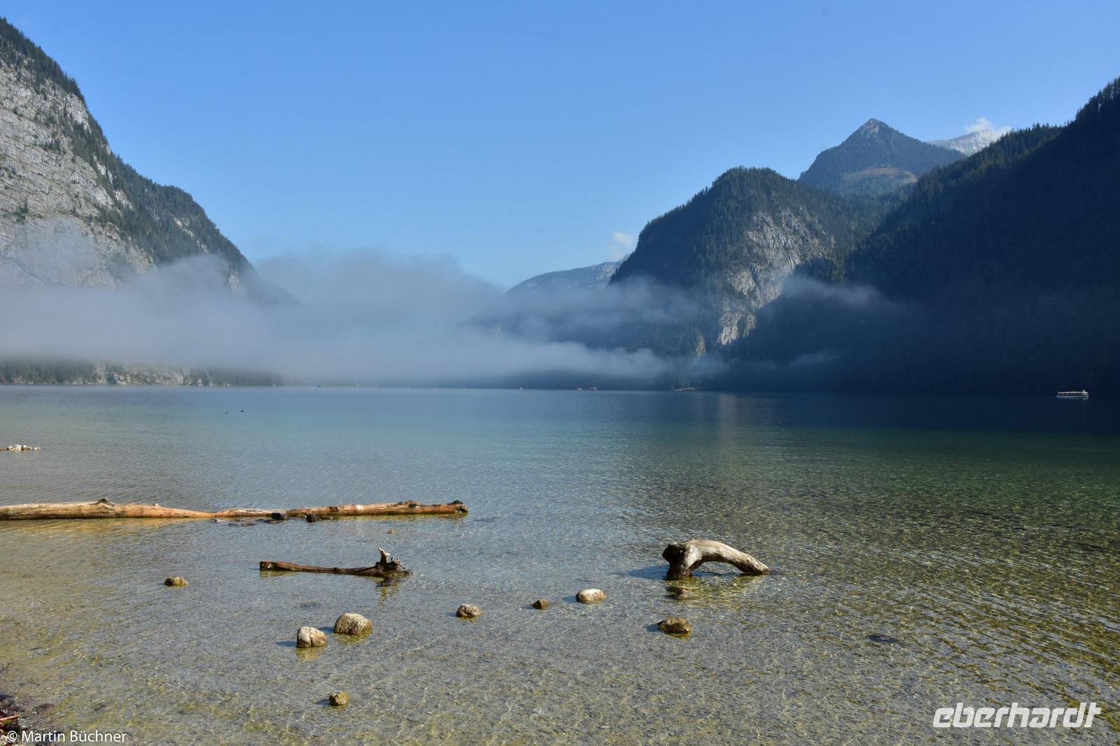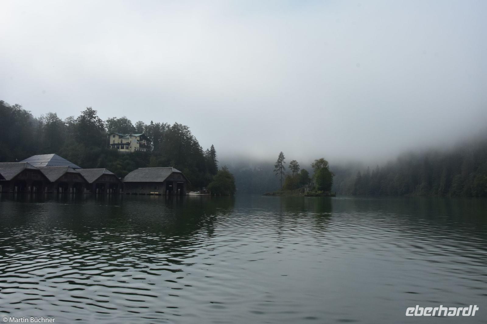 Wir starten heute über die Landstraße nach Berchtesgaden zum weltberühmten Königssee, über Übrigen wird der See mit einem Dehnungs „s" geschrieben, folglich verdoppelt sich dieser Buchstabe. Wir erreichen den See am frühen Morgen, es ist noch wenig los. In mystischem Nebel ist der Königssee und die Familie Watzmann getaucht. Meter um Meter verschwindet der Nebel. An der Echowand schmettert der Trompeter gegen die Felswand, doch diese wirft es zurück!?