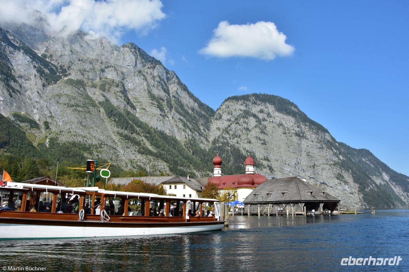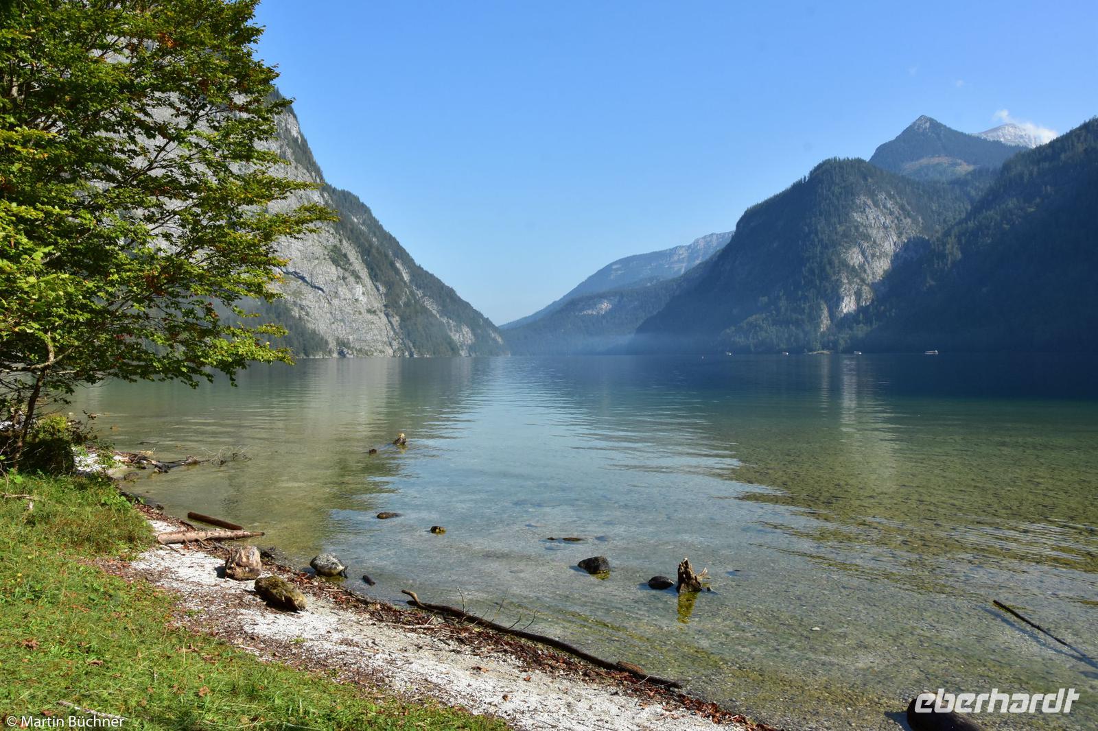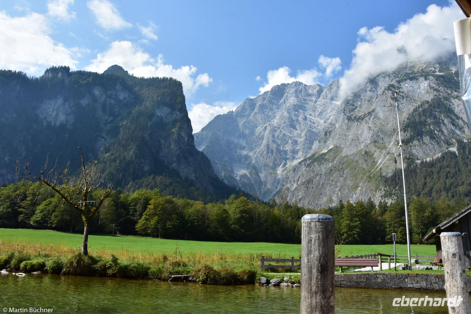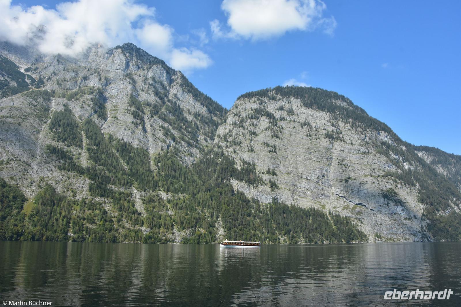 Wir starten heute über die Landstraße nach Berchtesgaden zum weltberühmten Königssee, über Übrigen wird der See mit einem Dehnungs „s" geschrieben, folglich verdoppelt sich dieser Buchstabe. Wir erreichen den See am frühen Morgen, es ist noch wenig los. In mystischem Nebel ist der Königssee und die Familie Watzmann getaucht. Meter um Meter verschwindet der Nebel. An der Echowand schmettert der Trompeter gegen die Felswand, doch diese wirft es zurück!?