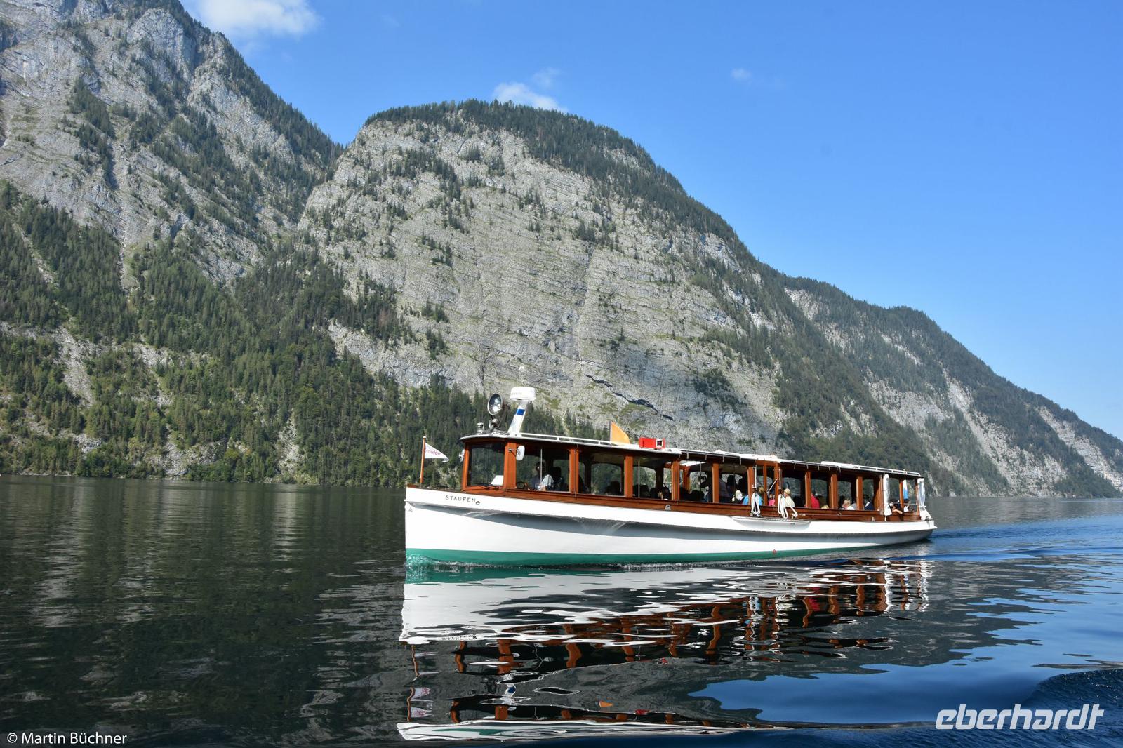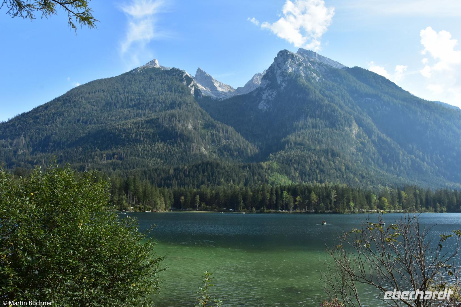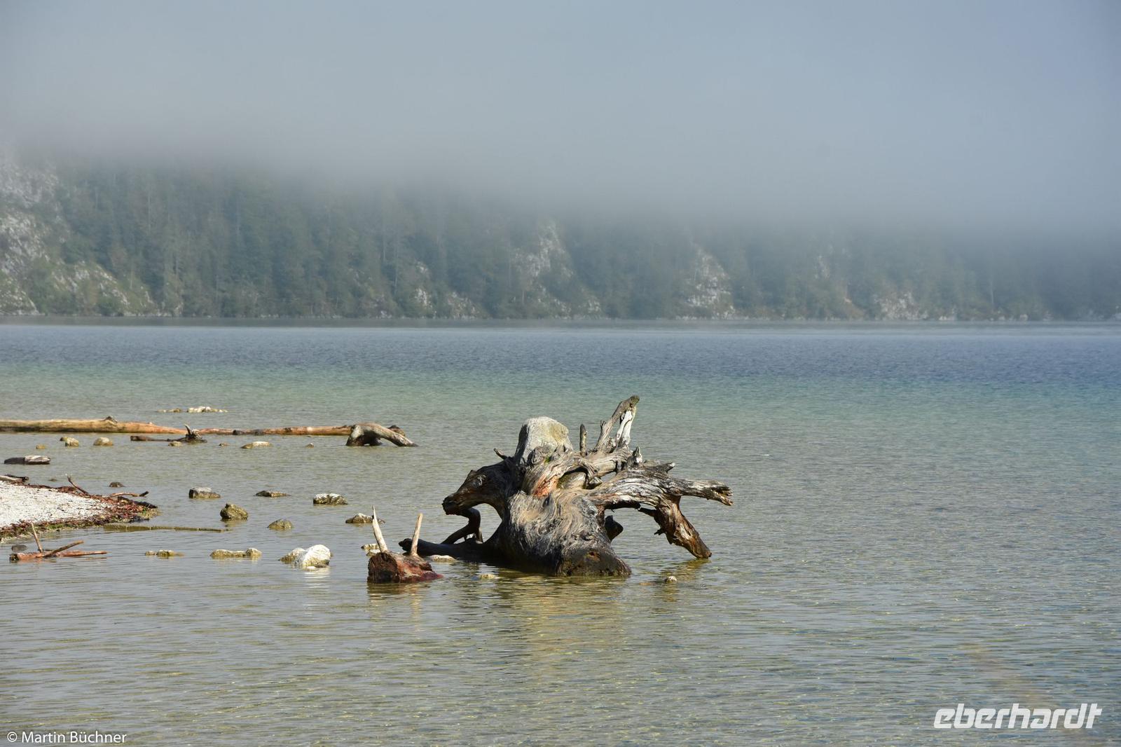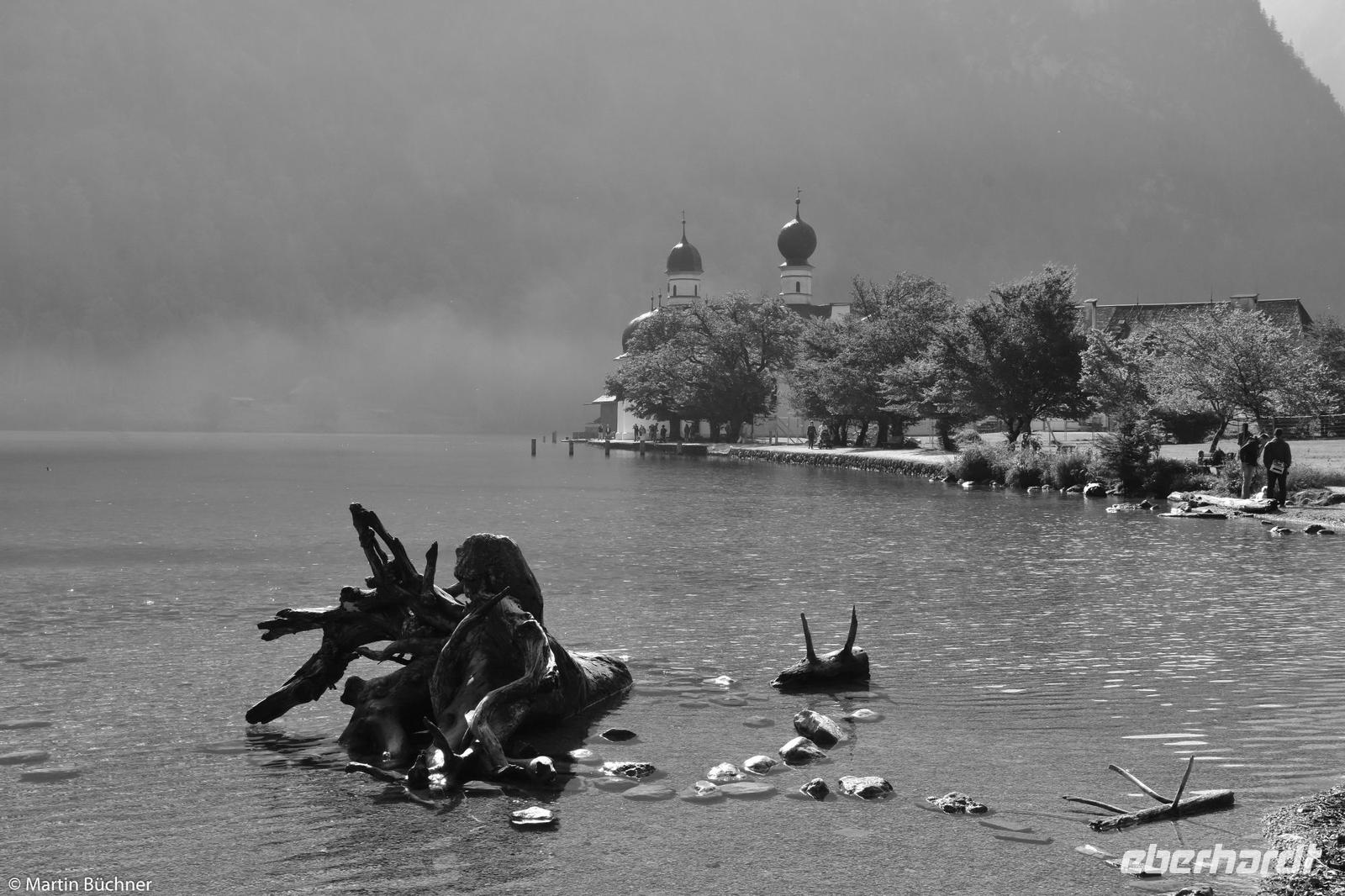 Wir starten heute über die Landstraße nach Berchtesgaden zum weltberühmten Königssee, über Übrigen wird der See mit einem Dehnungs „s" geschrieben, folglich verdoppelt sich dieser Buchstabe. Wir erreichen den See am frühen Morgen, es ist noch wenig los. In mystischem Nebel ist der Königssee und die Familie Watzmann getaucht. Meter um Meter verschwindet der Nebel. An der Echowand schmettert der Trompeter gegen die Felswand, doch diese wirft es zurück!?