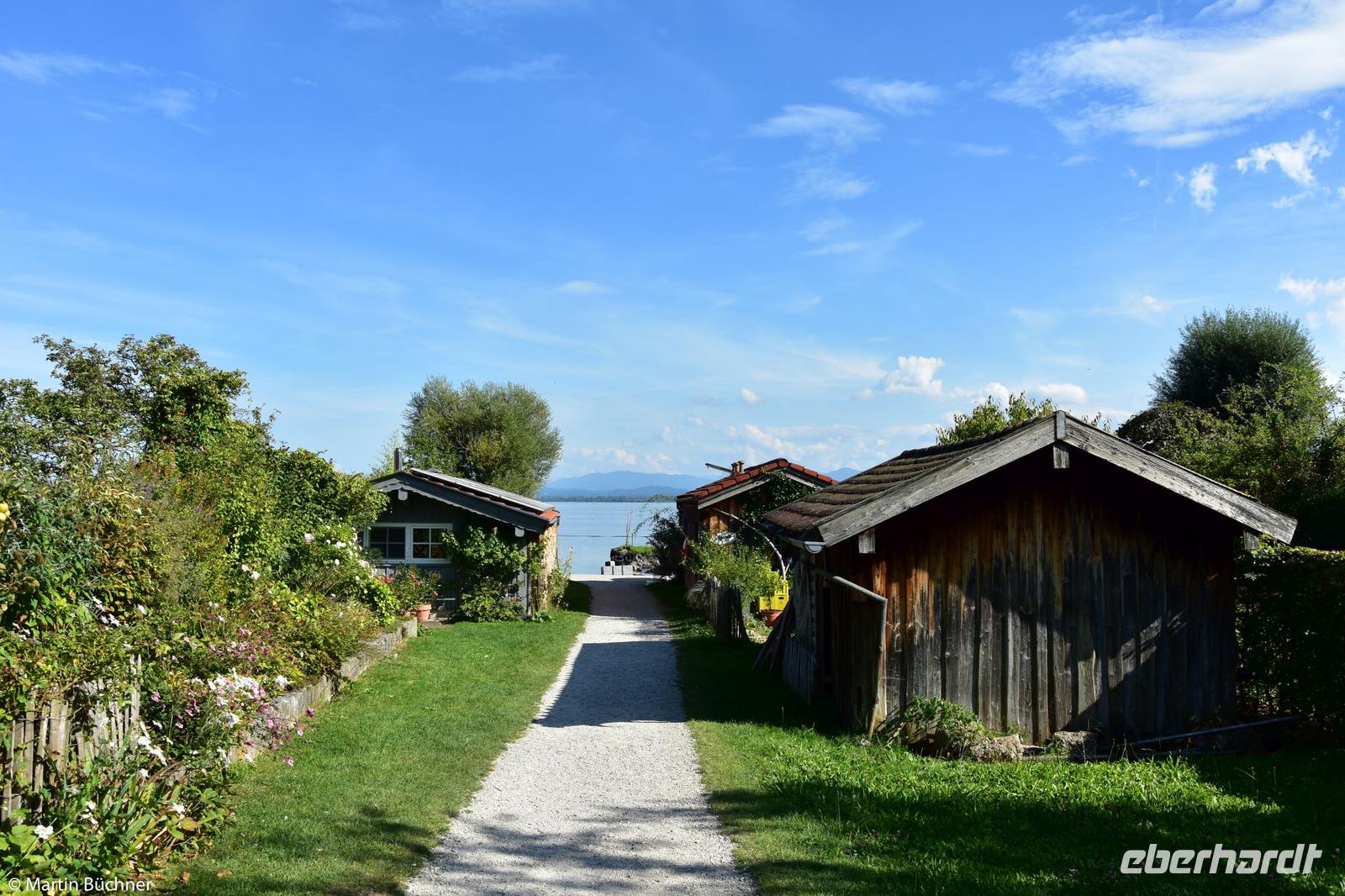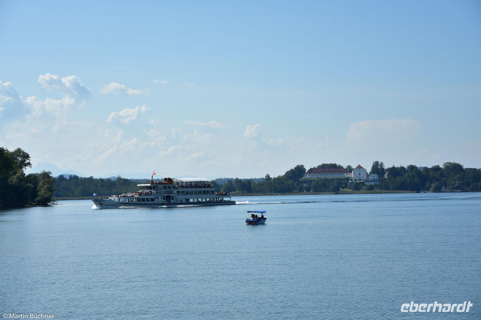 Ein weiteres Schiff bringt von der Herreninsel (Herrenchiemsee) vorbei an der kleinen naturbelassenen Krautinsel zur Fraueninsel.