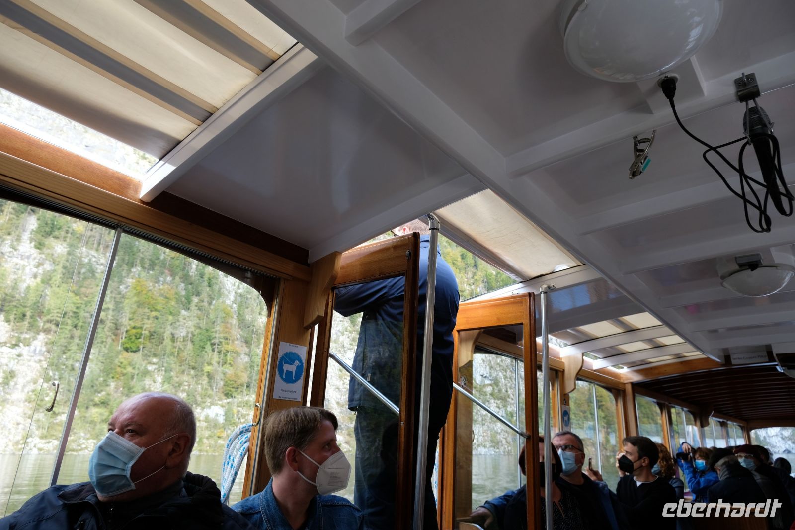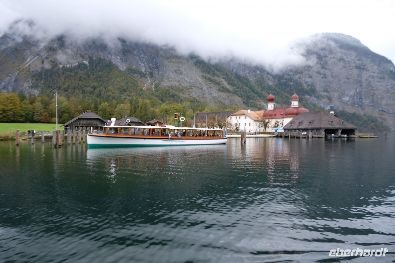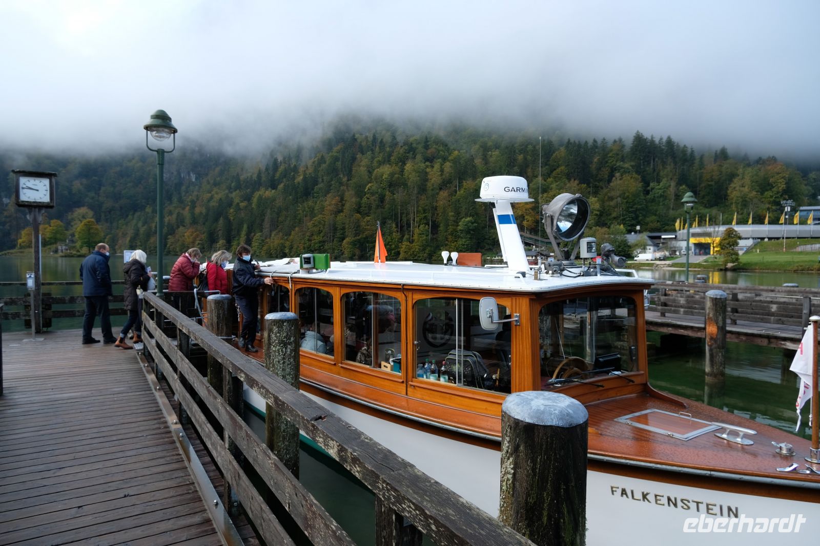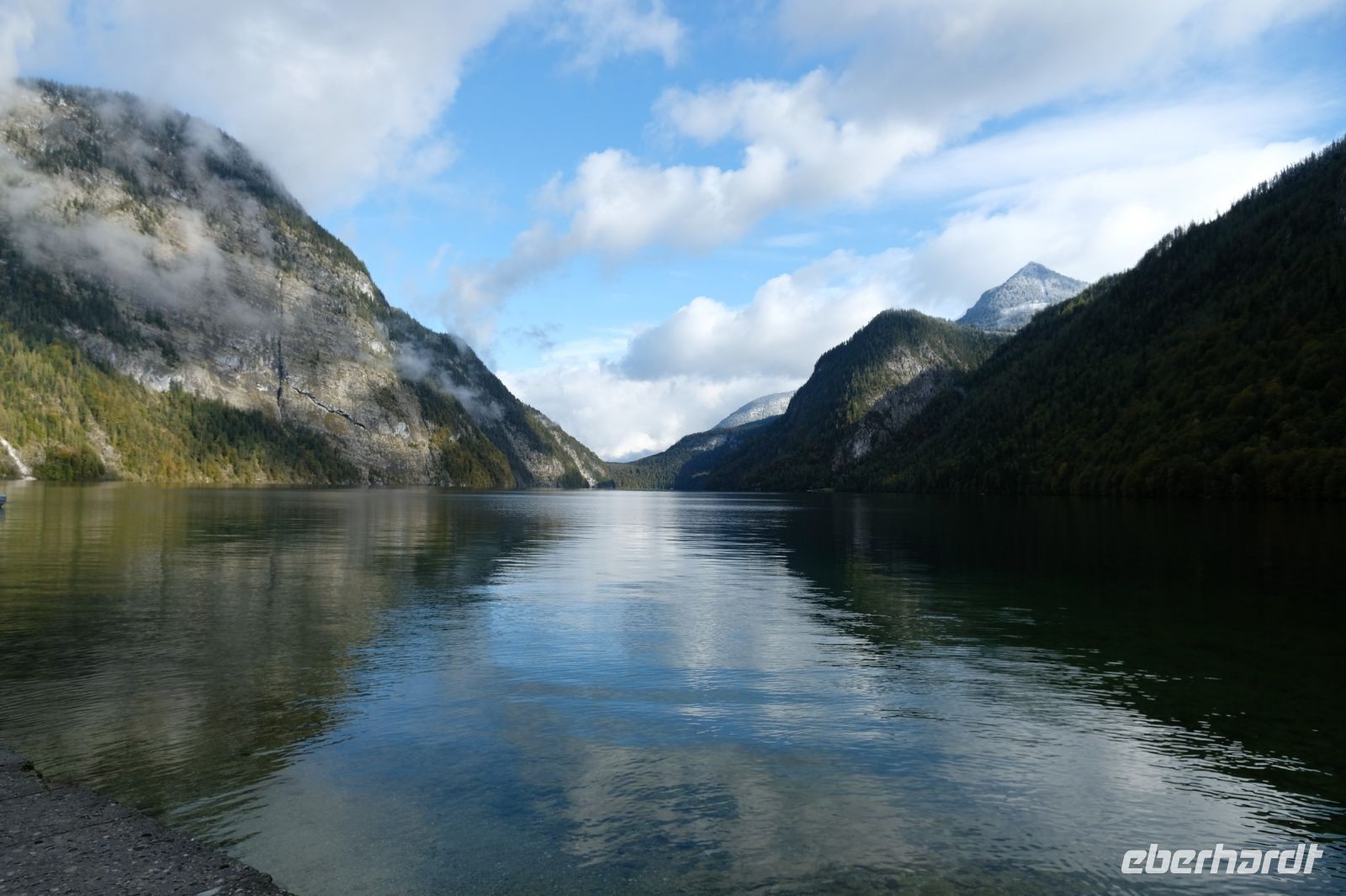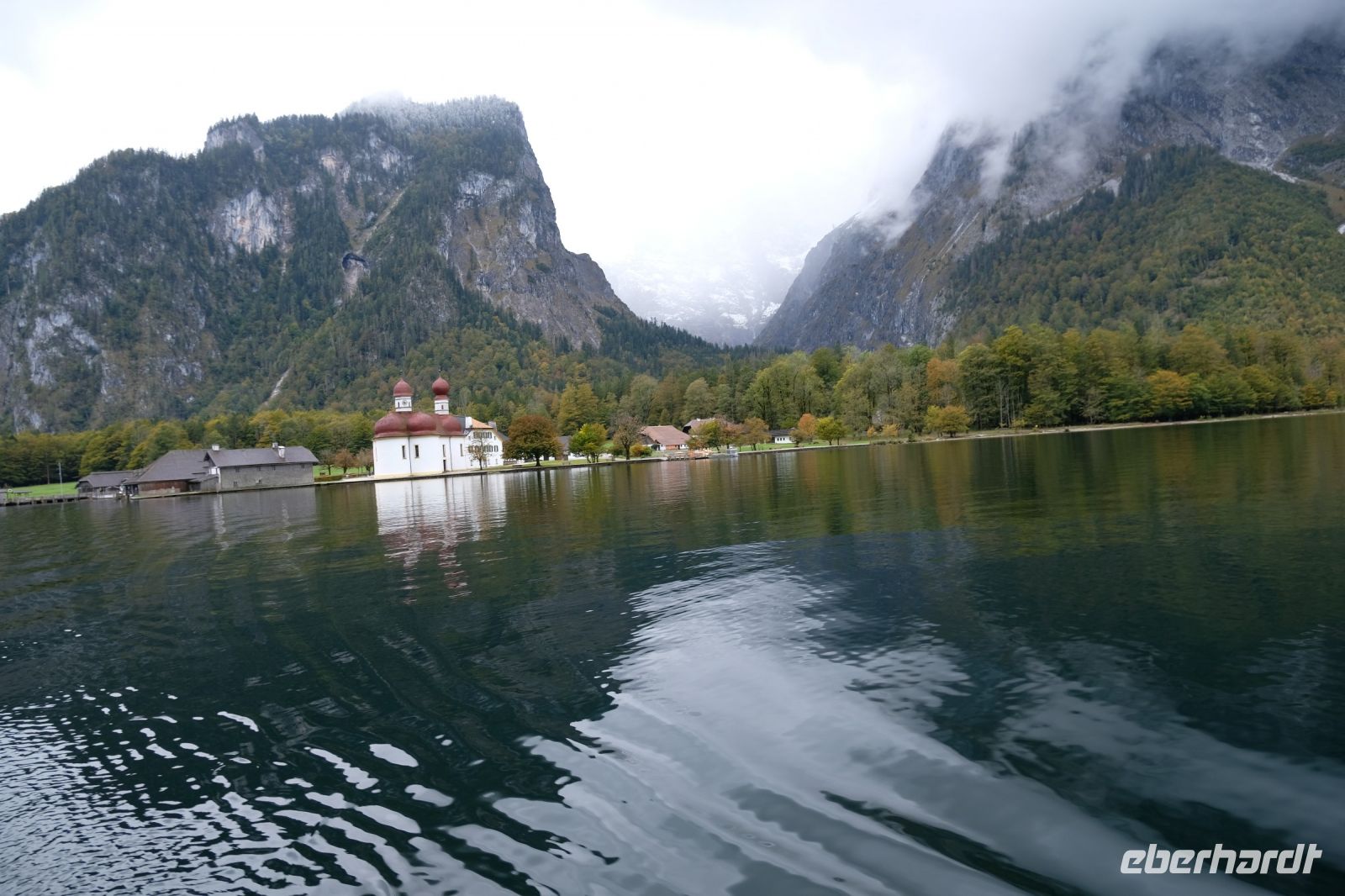 Der Königssee wird vom steil herabfallenden Watzmann, vom Steinernen Meer und vom Hagengebirge umschlossen, er hat eine Länge von ca. 8 Kilometern und erreicht seine tiefste Stelle bei 198 Metern. Auf unserer 30 minütigen Fahrt erreichen wir auch die legendäre Echowand. Ein Bootsmann schmettert mit seiner Trompeter einige Töne gegen die Felswand, und diese wirft sie zurück, so entsteht das berühmte Echo.