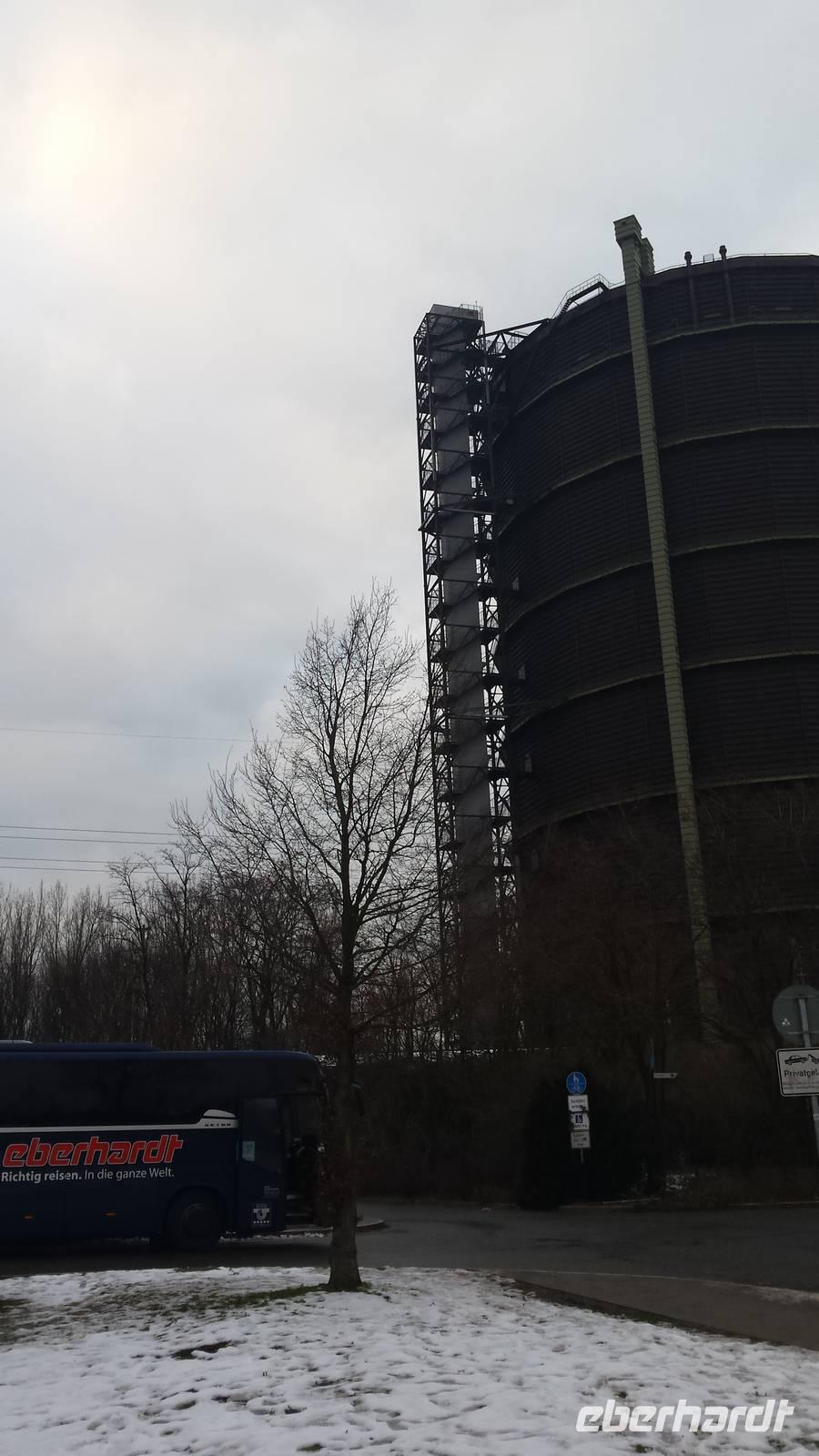 Nach mehreren Zustiegen und der Frühstückspause ging es dann von Eisenach über die A4, die A7 und die A 44 durch den Knüllwald, vorbei an Kassel mit dem Herkules, der sich leider im Nebel versteckte, und durch das Brüder-Grimm-Land in Richtung Ruhrgebiet.Unser erstes Ziel war der Gasometer in Oberhausen.