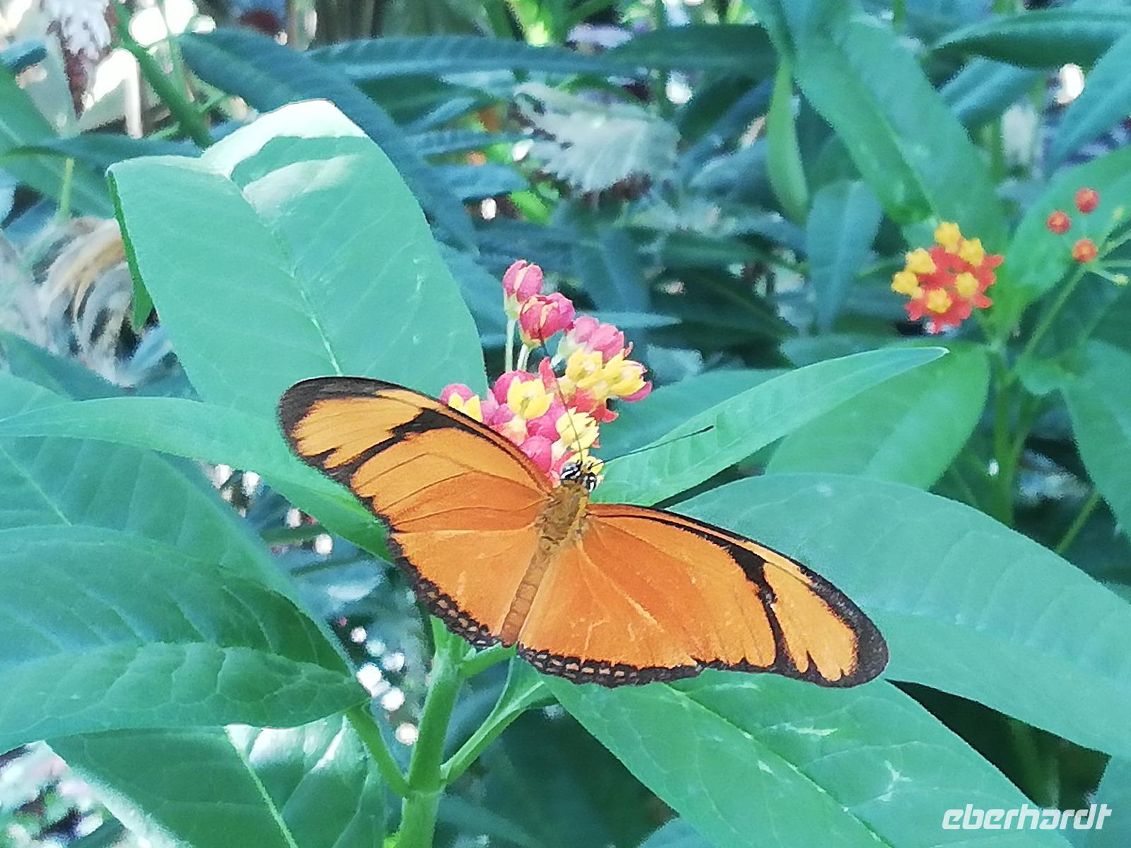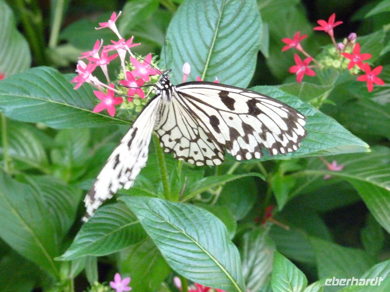 Im ganzjährig geöffneten Schmetterlingshaus, mit etwa 1000 Quadratmeter das zweitgrößte seiner Art in Deutschland, spazierten wir bei 26 Grad und 80 bis 90 Prozent Luftfeuchtigkeit durch eine tropisch anmutende Umgebung mit rauschenden Wasserfällen und exotischen Gewächsen und Blumen. Je nach Saison fliegen 700 bis 1000 bunte Falter bis zu 80 verschiedener Schmetterlingsarten, vor allem südamerikanischer Herkunft, frei zwischen den Besuchern durch die Tropenlandschaft.