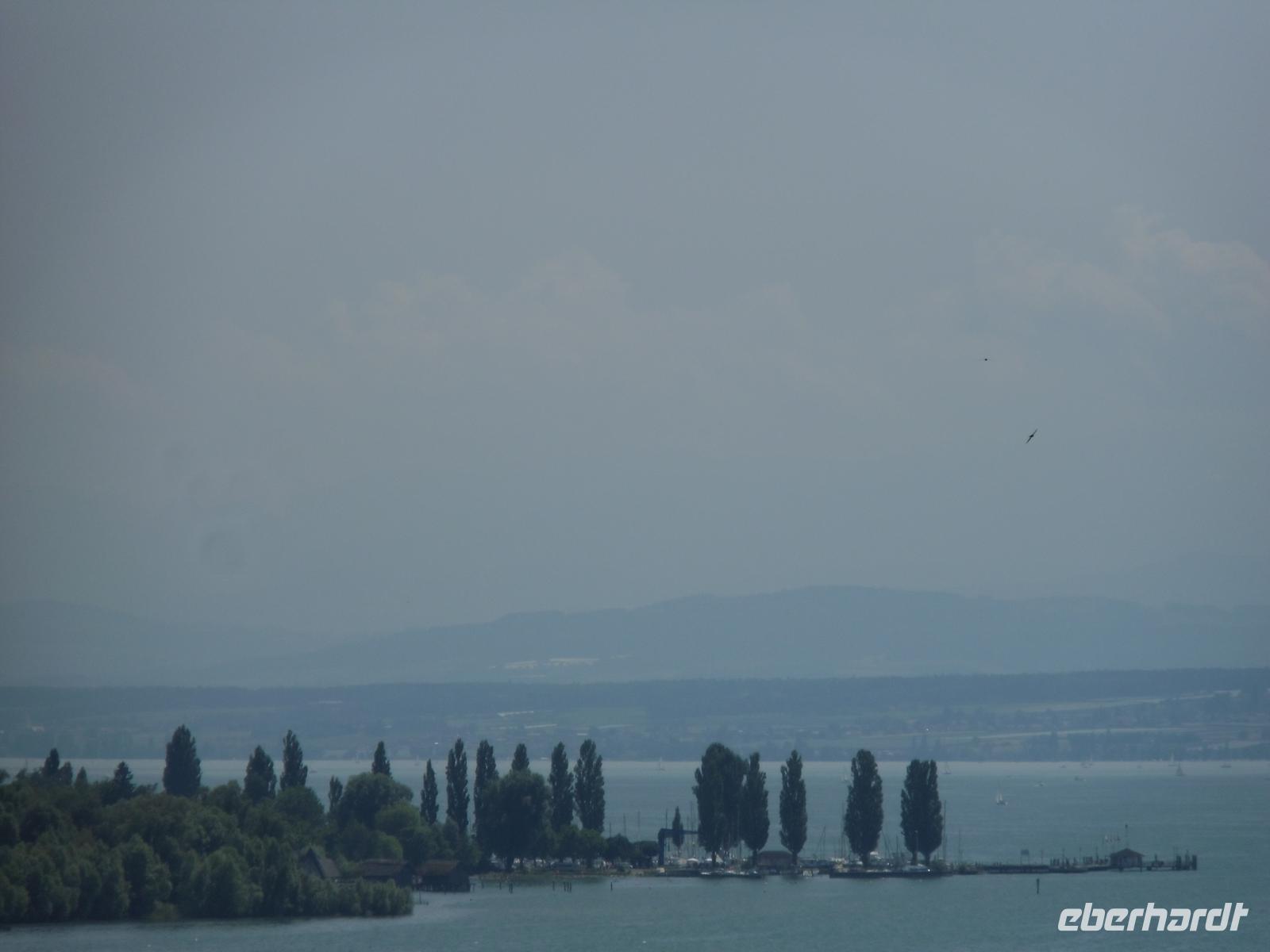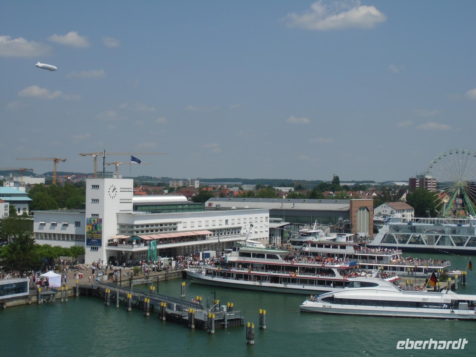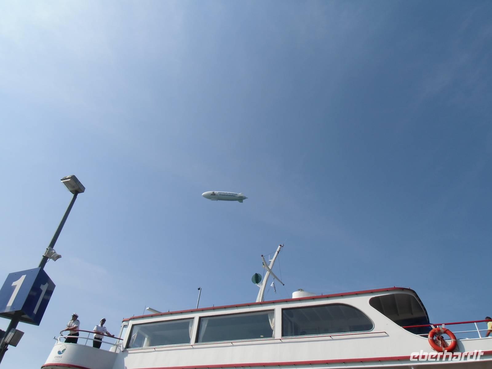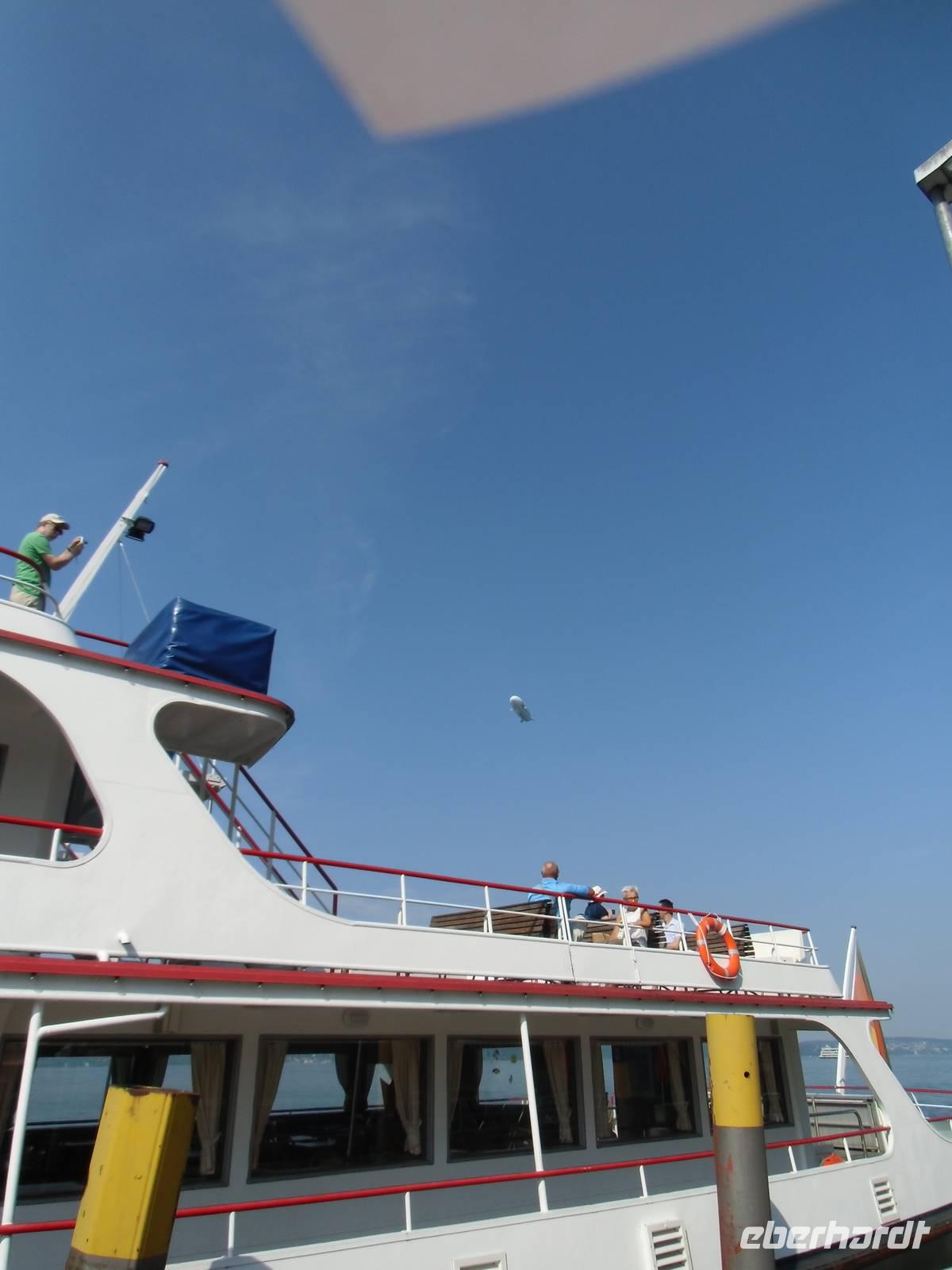 Nun blieb noch, das Nordufer des Bodensees zu erkunden. In Lindau stiegen wir auf der Insel aus dem Bus und spazierten durch die Gassen am Rathaus vorbei zum Hafen. Vom Personenschiff aus ließen sich die einzelnen Orte bis Friedrichshafen ganz entspannt betrachten. Über eine Stunde lang glitten wir so bei herrlichstem Sonnenwetter von der bayerischen zu der baden-württembergischen Kreisstadt über das Wasser. In Friedrichshafen wollte es der Zufall, dass gerade das "Seehasenfest" stattfand. Also: auf ins Gewühl! Einige Gäste nutzten auch die Gelegenheit, das Zeppelinmuseum zu besuchen. Beeindruckend auch die Aufstellung mehrerer Fanfarenzüge auf den Decks der im Hafen liegenden Personenschiffe, die von dort aus abwechselnd "um die Wette" spielten. Am Nachmittag besuchten wir die barocke Wallfahrtskirche Birnau mit dem fantastischen Bodensee-Blick von der Terrasse davor aus und fuhren weiter nach Salem. Der Großteil der Gäste entschied sich für eine Besichtigung der weiträumigen Schlossanlage, wobei es gelang, für einen günstigen Preis noch eine einstündige Führung zu erhalten. Andere Gäste streiften in dieser Zeit über den Affenberg, die dortigen Berber-Affen und die Störche bewundernd. Diesmal weiträumig Friedrichshafen umfahrend, kamen wir ohne Stau zurück zum Hotel.
