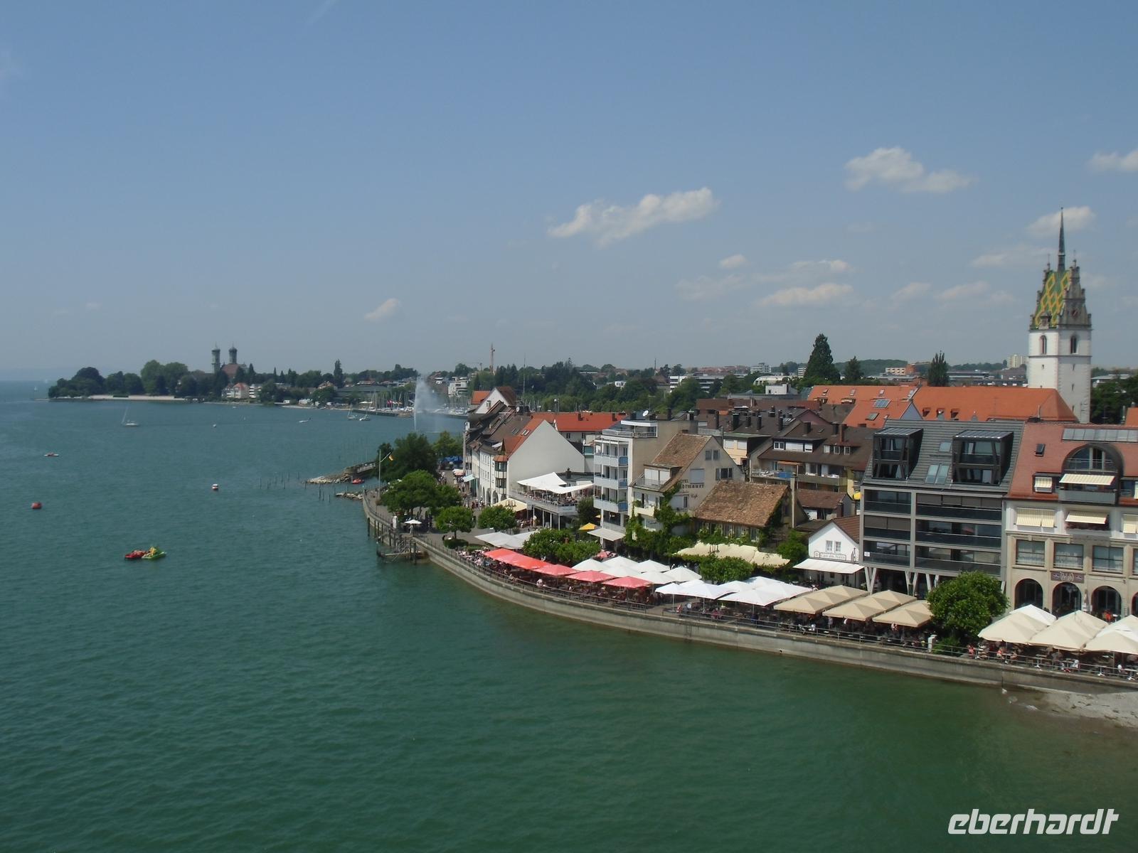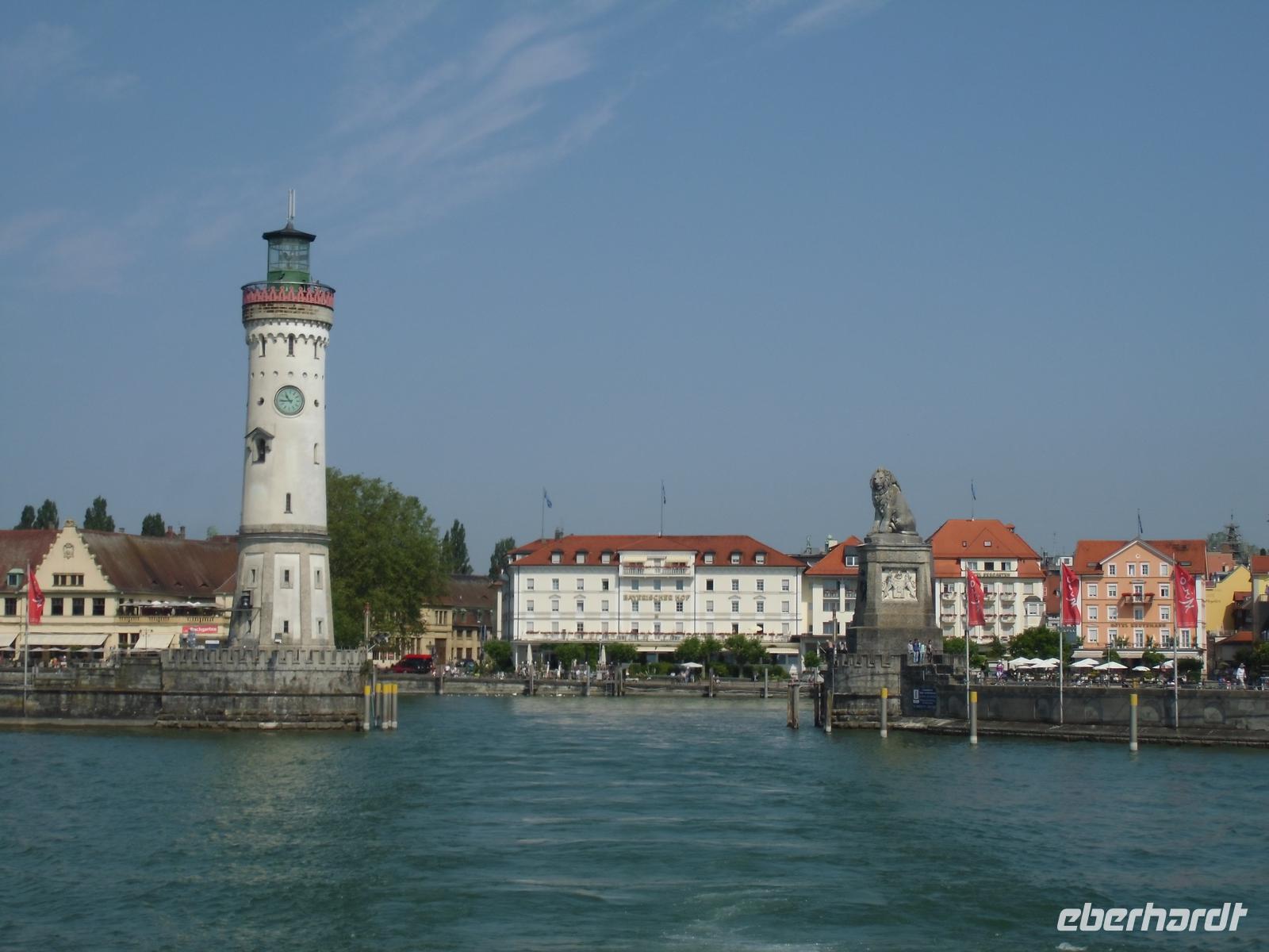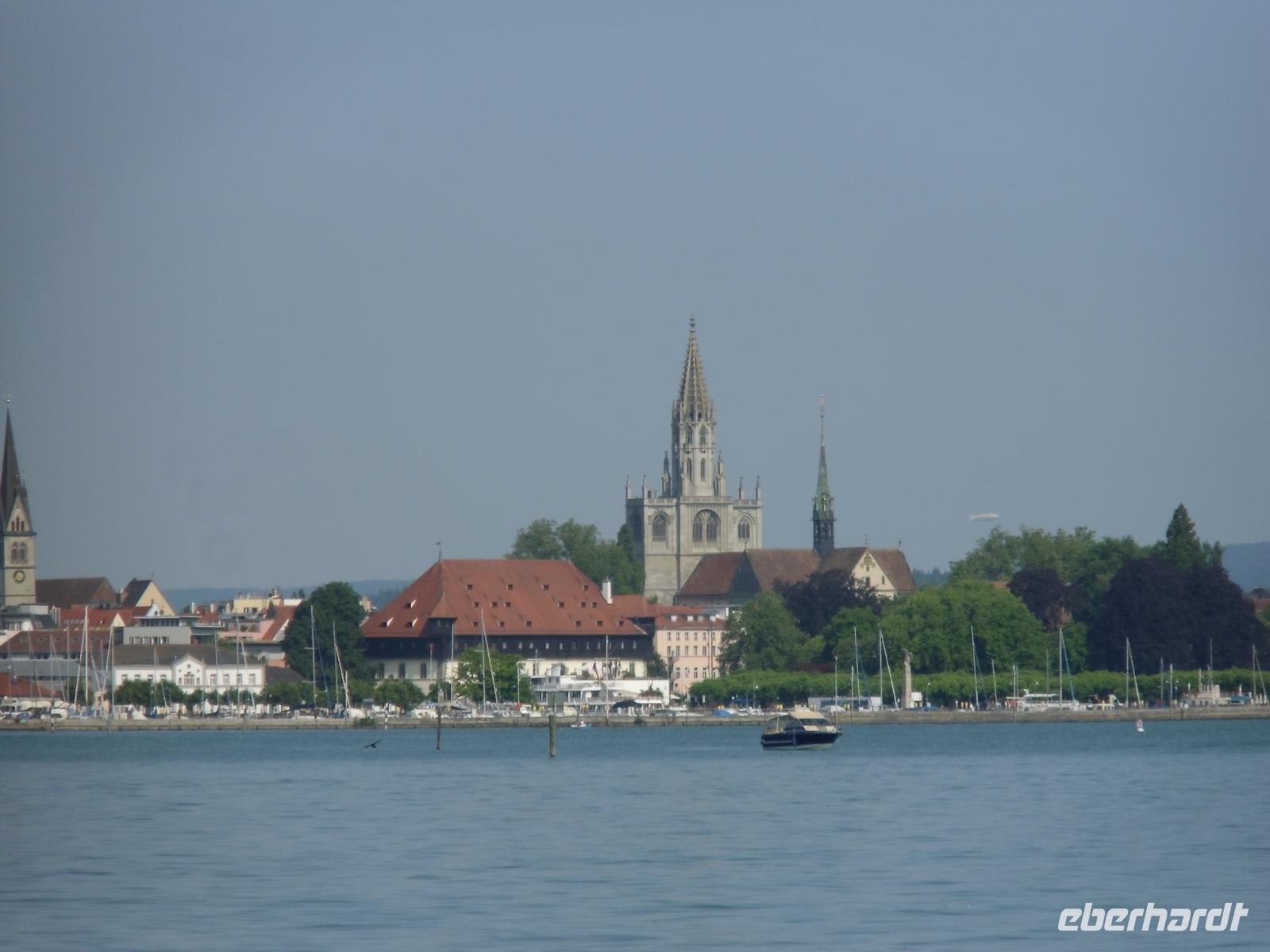 Nun blieb noch, das Nordufer des Bodensees zu erkunden. In Lindau stiegen wir auf der Insel aus dem Bus und spazierten durch die Gassen am Rathaus vorbei zum Hafen. Vom Personenschiff aus ließen sich die einzelnen Orte bis Friedrichshafen ganz entspannt betrachten. Über eine Stunde lang glitten wir so bei herrlichstem Sonnenwetter von der bayerischen zu der baden-württembergischen Kreisstadt über das Wasser. In Friedrichshafen wollte es der Zufall, dass gerade das "Seehasenfest" stattfand. Also: auf ins Gewühl! Einige Gäste nutzten auch die Gelegenheit, das Zeppelinmuseum zu besuchen. Beeindruckend auch die Aufstellung mehrerer Fanfarenzüge auf den Decks der im Hafen liegenden Personenschiffe, die von dort aus abwechselnd "um die Wette" spielten. Am Nachmittag besuchten wir die barocke Wallfahrtskirche Birnau mit dem fantastischen Bodensee-Blick von der Terrasse davor aus und fuhren weiter nach Salem. Der Großteil der Gäste entschied sich für eine Besichtigung der weiträumigen Schlossanlage, wobei es gelang, für einen günstigen Preis noch eine einstündige Führung zu erhalten. Andere Gäste streiften in dieser Zeit über den Affenberg, die dortigen Berber-Affen und die Störche bewundernd. Diesmal weiträumig Friedrichshafen umfahrend, kamen wir ohne Stau zurück zum Hotel.
