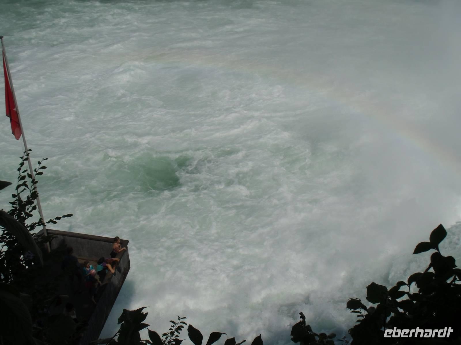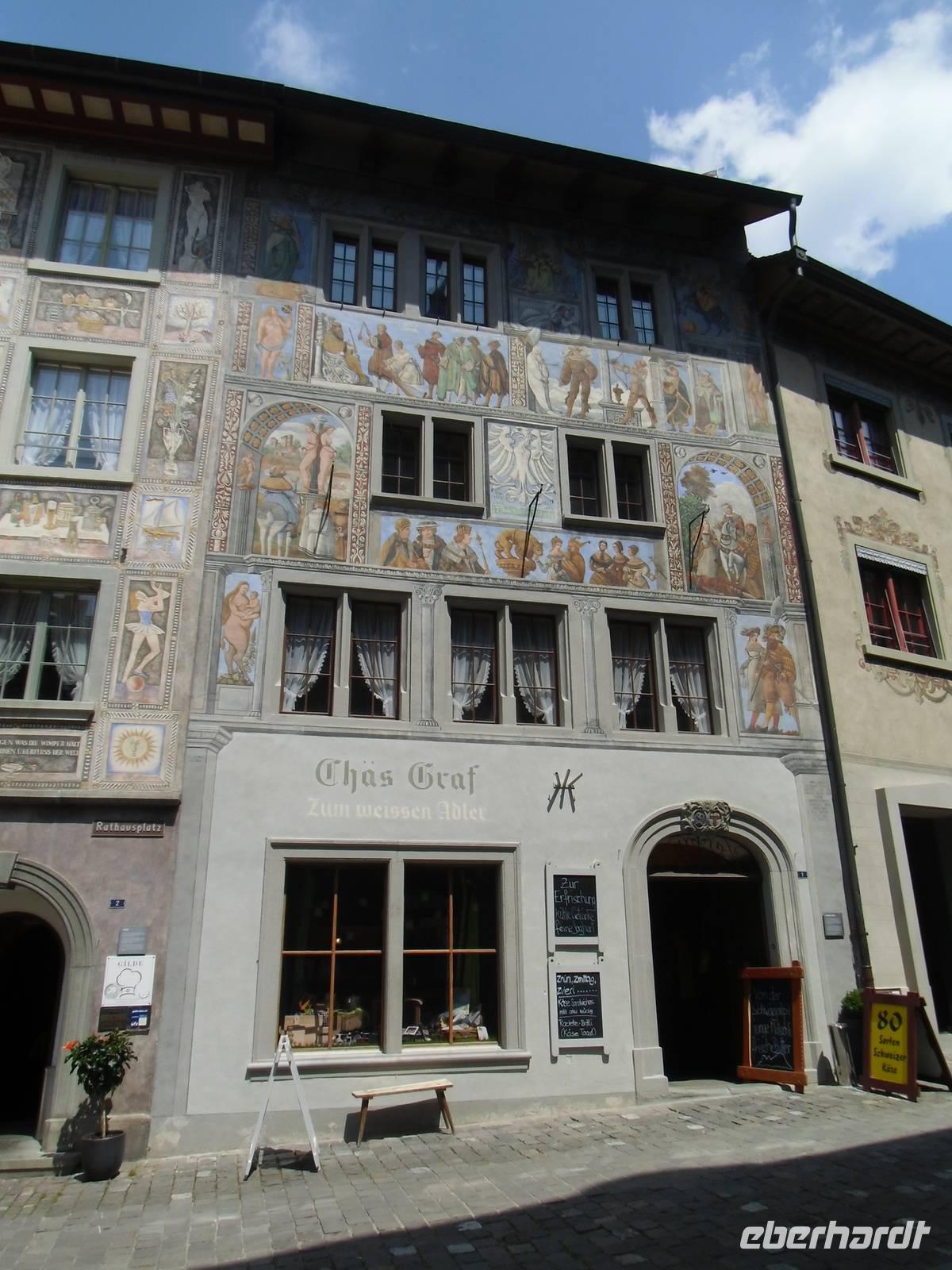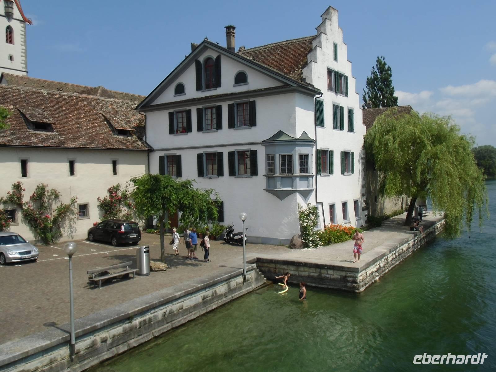 Heute ging es in die Schweiz. Zunächst war der Himmel noch bedeckt, aber noch vor Mittag strahlte die Sonne erneut vom wolkenlosen Himmel. In St. Gallen, zehn Kilometer vom Bodensee entfernt, beeindruckte uns der Dom, eine der spätesten barocken Kirchenbauten, von außen wie von innen, obwohl ein Teil wegen Bauarbeiten nicht zugänglich war. Durch die Straßen der Altstadt, vorbei an malerischen Häusern mit holzgeschnitzten Erkern, gelangten wir zum Bus zurück und mit diesem zum Rheinfall. Der größte Wasserfall Europas begrüßte uns schon von fern hörbar mit seinem Tosen: auf Grund des nassen Frühjahrs war ungewöhnlich viel Wasser im Fluss, dass sich in mächtigen Kaskaden die Felsklippen herabstürzte. Ein einzigartiges Erlebnis - schaurig-schön! Und weiter drehten wir eine Runde um die Altstadt von Schaffhausen, um anschließend nach Stein am Rhein zu fahren. Die Idylle dieses Städtchens mit seinem Rathaus und den prächtigen Bürgerhäusern aus dem 16. Jahrhundert ist wohl kaum noch zu übertreffen. Als wäre die Zeit stehen geblieben in Stein am Rhein. Auf der Rückfahrt zum Hotel sahen wir das Schloss Arenenberg (in dem der französische Kaiser Napoleon III. seine Jugend verbracht hat) am Hang liegen und blieb uns in Rohrschach noch Zeit für einen Abstecher, um die Hundertwasser-Markthalle in Augenschein zu nehmen.