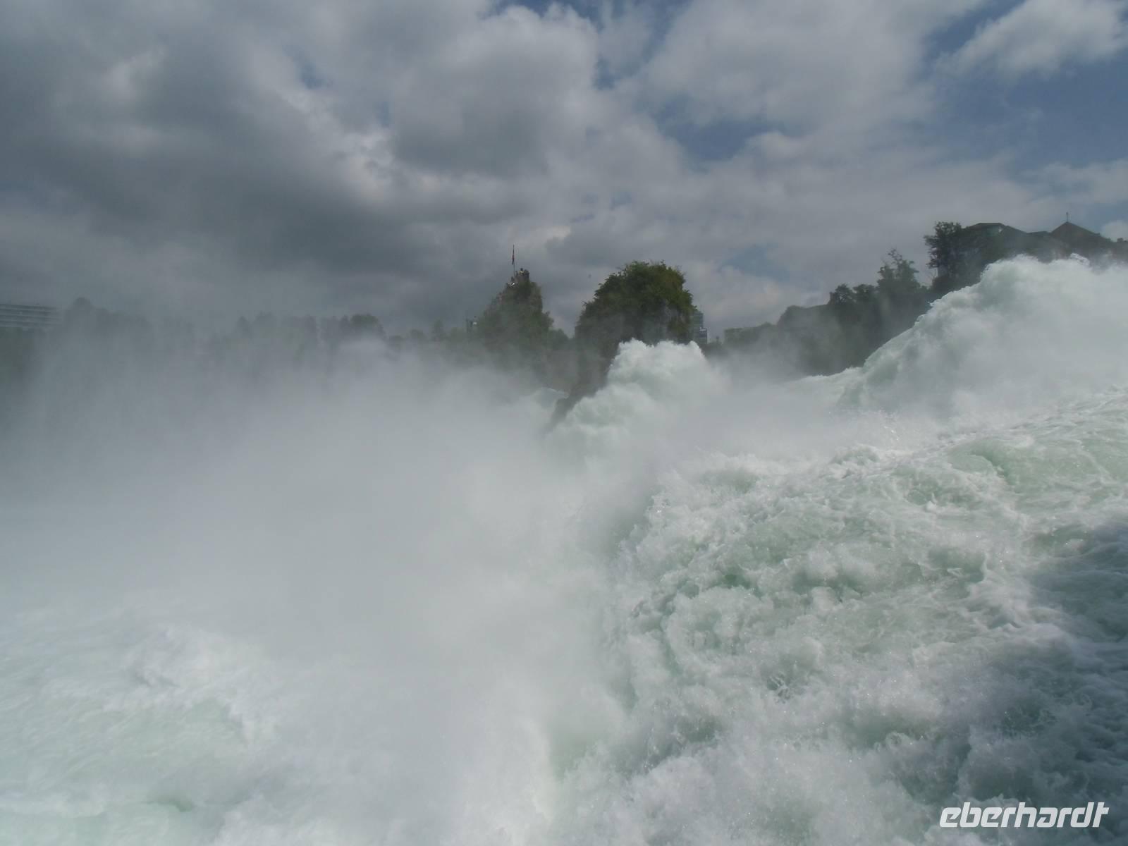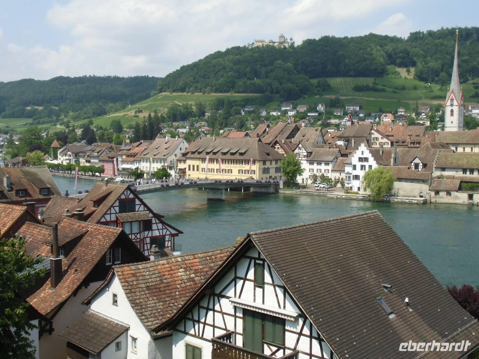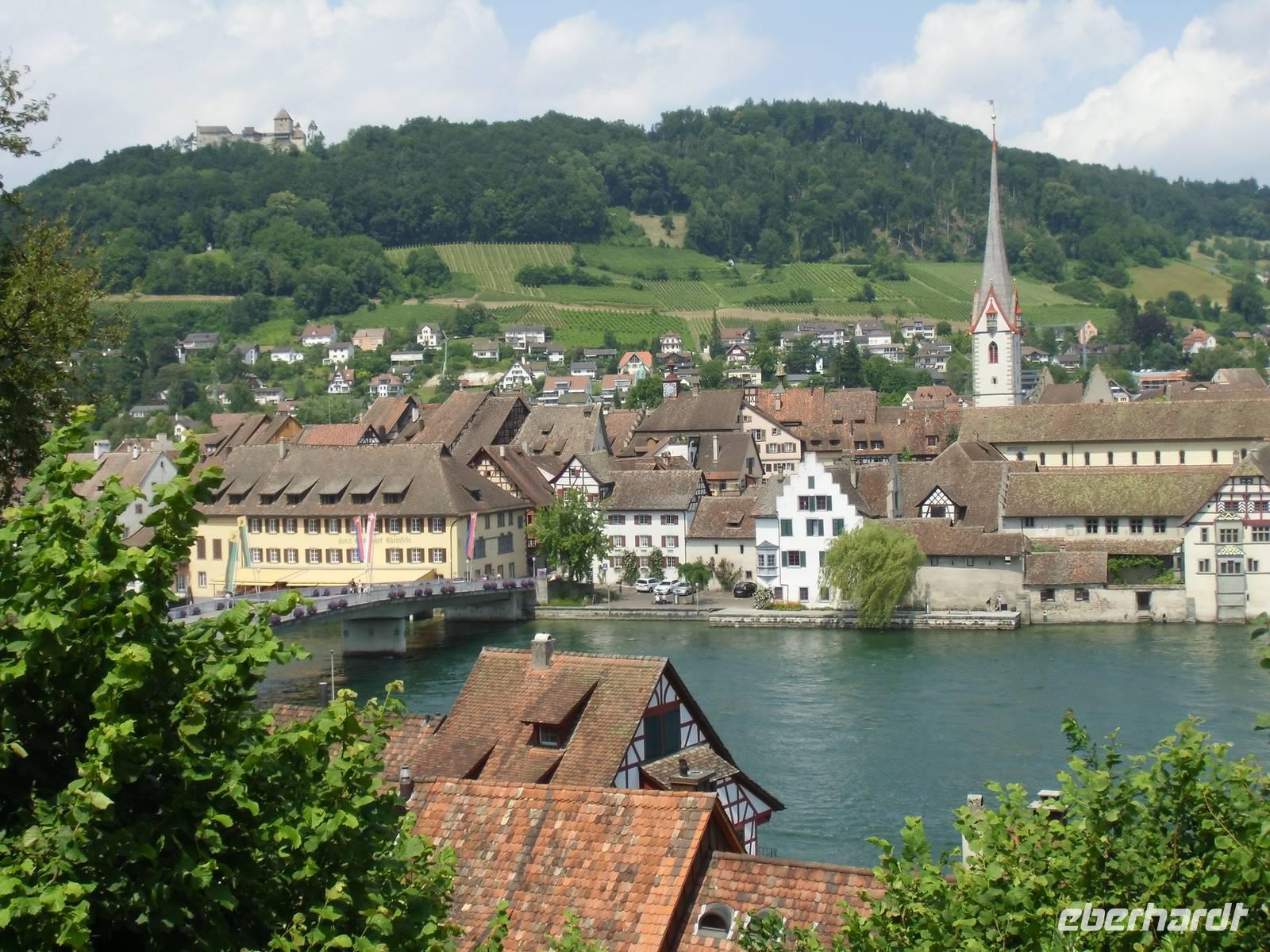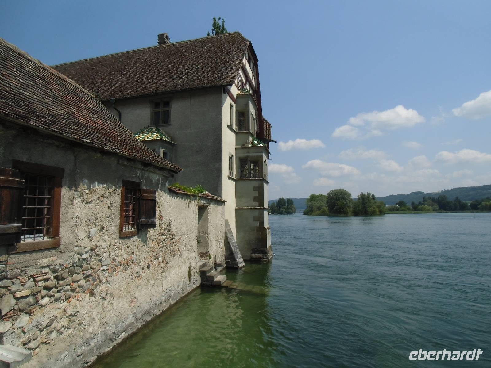 Heute ging es in die Schweiz. Zunächst war der Himmel noch bedeckt, aber noch vor Mittag strahlte die Sonne erneut vom wolkenlosen Himmel. In St. Gallen, zehn Kilometer vom Bodensee entfernt, beeindruckte uns der Dom, eine der spätesten barocken Kirchenbauten, von außen wie von innen, obwohl ein Teil wegen Bauarbeiten nicht zugänglich war. Durch die Straßen der Altstadt, vorbei an malerischen Häusern mit holzgeschnitzten Erkern, gelangten wir zum Bus zurück und mit diesem zum Rheinfall. Der größte Wasserfall Europas begrüßte uns schon von fern hörbar mit seinem Tosen: auf Grund des nassen Frühjahrs war ungewöhnlich viel Wasser im Fluss, dass sich in mächtigen Kaskaden die Felsklippen herabstürzte. Ein einzigartiges Erlebnis - schaurig-schön! Und weiter drehten wir eine Runde um die Altstadt von Schaffhausen, um anschließend nach Stein am Rhein zu fahren. Die Idylle dieses Städtchens mit seinem Rathaus und den prächtigen Bürgerhäusern aus dem 16. Jahrhundert ist wohl kaum noch zu übertreffen. Als wäre die Zeit stehen geblieben in Stein am Rhein. Auf der Rückfahrt zum Hotel sahen wir das Schloss Arenenberg (in dem der französische Kaiser Napoleon III. seine Jugend verbracht hat) am Hang liegen und blieb uns in Rohrschach noch Zeit für einen Abstecher, um die Hundertwasser-Markthalle in Augenschein zu nehmen.