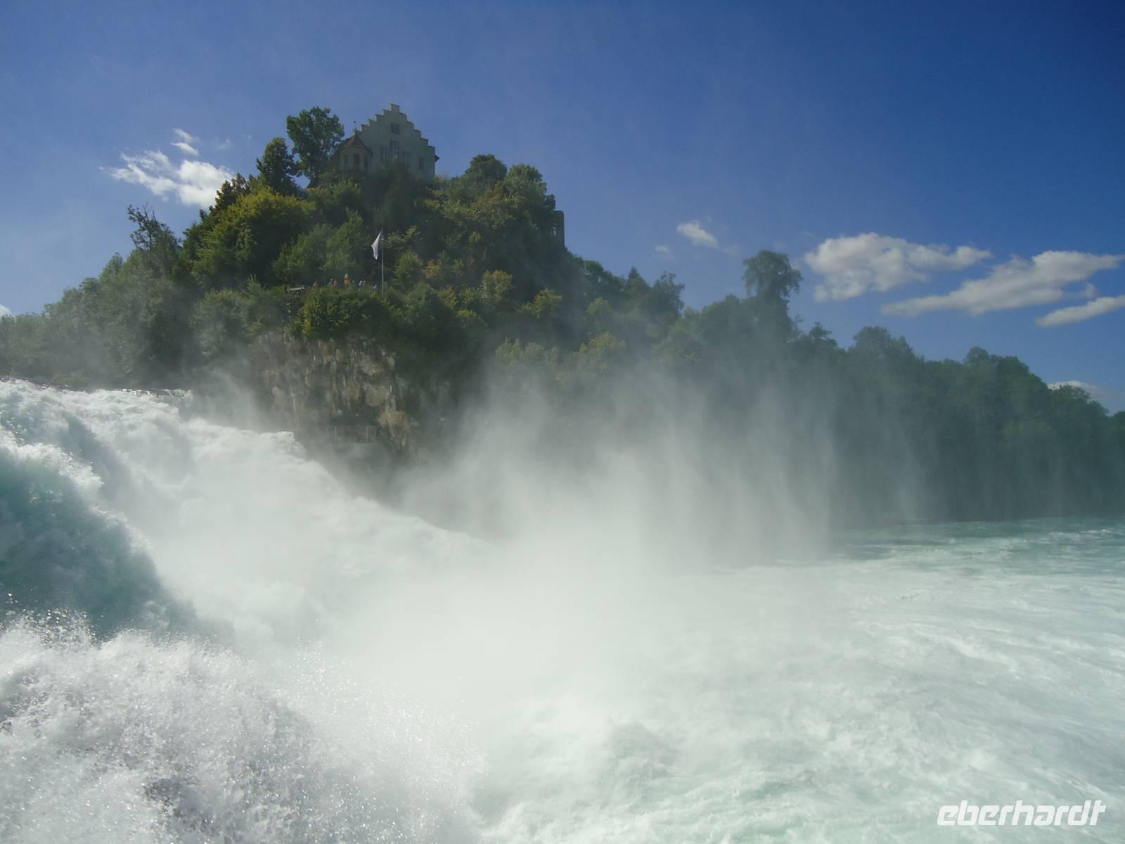 Nach dem Frühstück fahren wir streckenweise durch die Kantone St. Gallen, Thurgau und erreichen dann unser Ziel, den kleinsten Kanton der Schweiz, den Kanton Schaffhausen und damit auch den Rheinfall, der sich zum Glück aber nicht als „Reinfall" entpuppt sondern als ein Naturschauspiel par exellence. Mit einem ohrenbetäubenden Getöse stürzen hier die Wassermassen auf einer Breite von 150 Metern ca 24 Meter in die Tiefe. - einfach gigantisch!