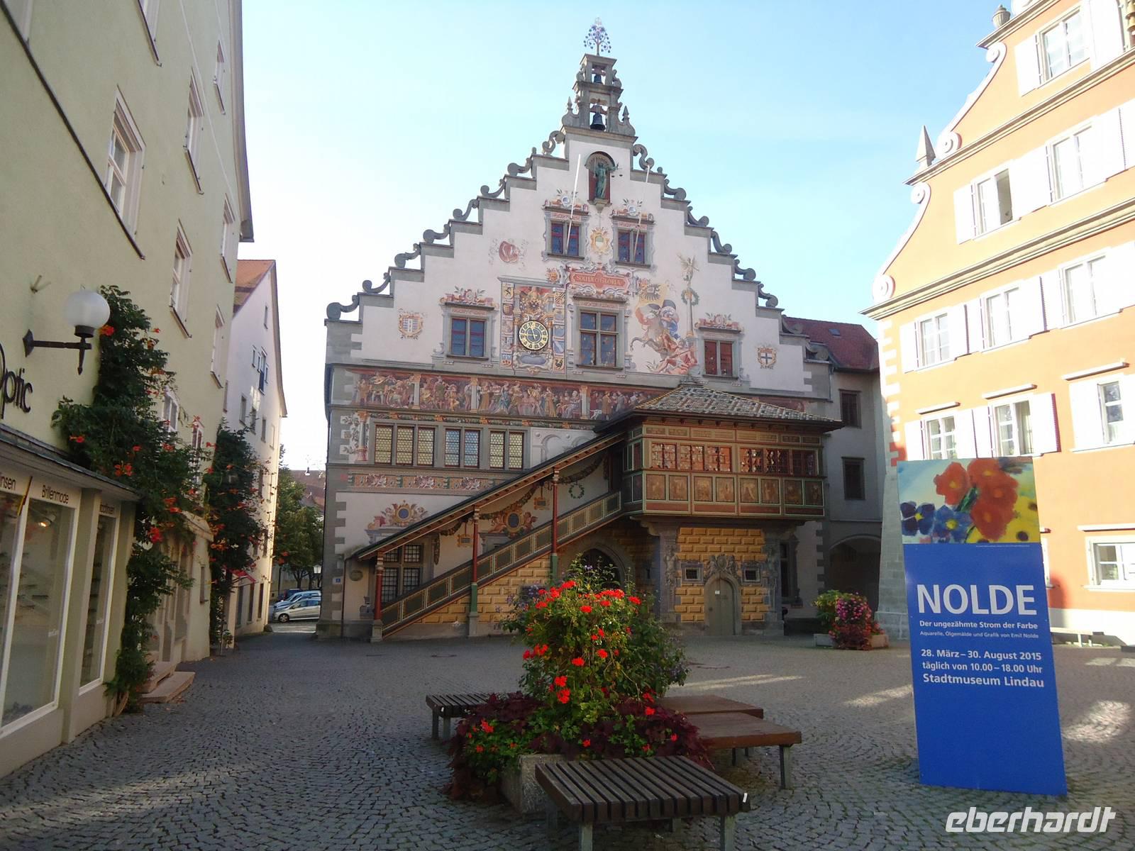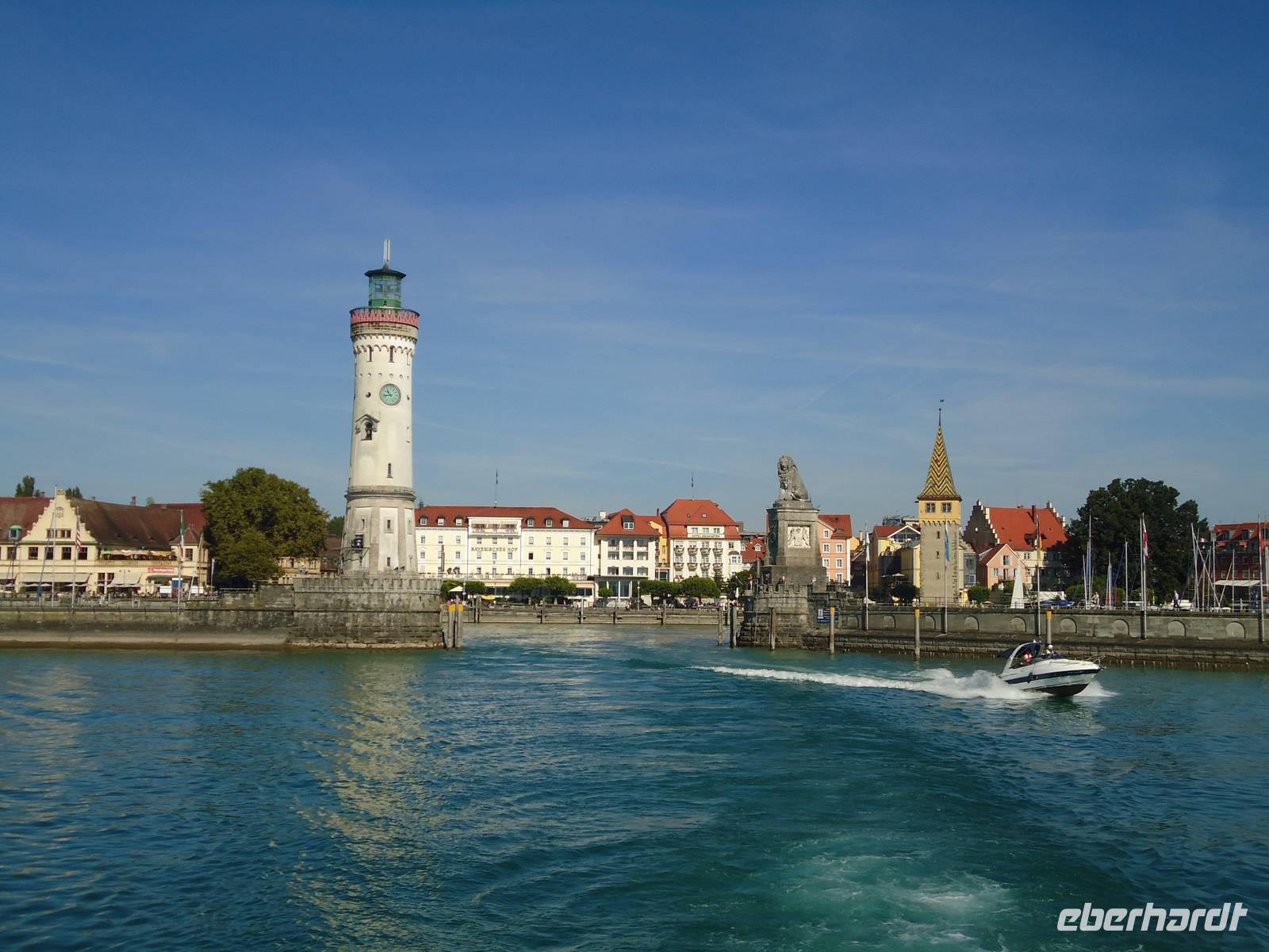 Die Insel Lindau im Obersee gelegen, wird unser erstes Etappenziel sein. Bei strahlendem Sonnenschein bummeln wir durch die engen Gassen der Stadt, schlenderen über die Maximilianstraße und bestaunen das wunderschöne Rathaus von vorn und von hinten. Am Hafen beäugen wir die Wahrzeichen der Stadt, den bayerischen Löwen und den Neuen Leuchtturm.