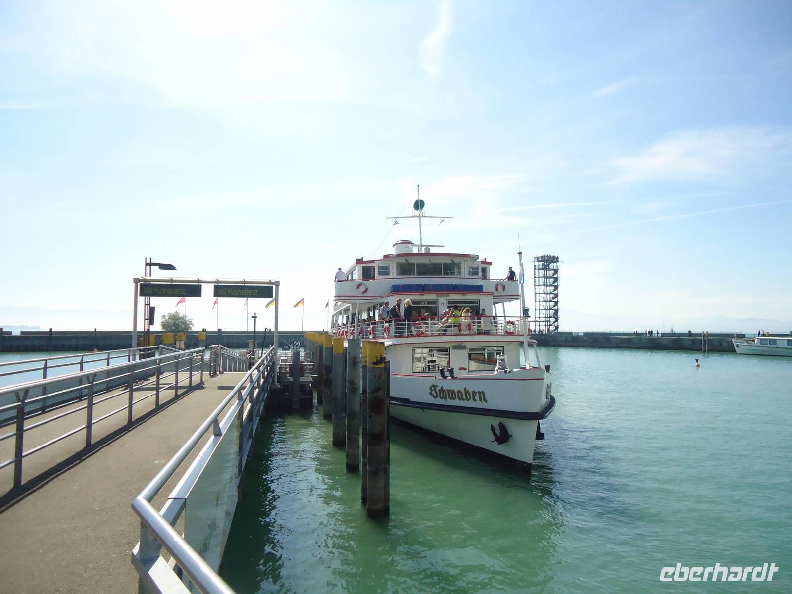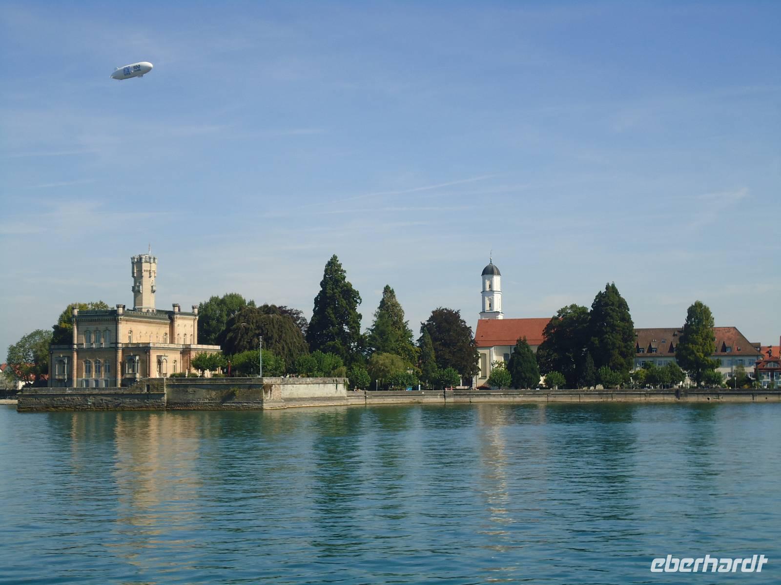 Dann nehmen wir das Schiff, welches uns nach Friedrichshafen bringen soll. Wir genießen die Fahrt auf dem See in vollen Zügen. Vorbei an Wasserburg, wo schon „der liebe Augustin seine Seele baumeln ließ" (sein Schöpfer, Horst Wolfram Geißler, liegt hier begraben ) und wo der Schriftsteller Martin Walser aufwuchs, weiter vorbei an Langenargen mit dem Schloß Montfort, einem Märchenschloß im maurischen Stil, erreichen wir Friedrichshafen, die Stadt, wo einst „die Zigarren das Fliegen lernten".