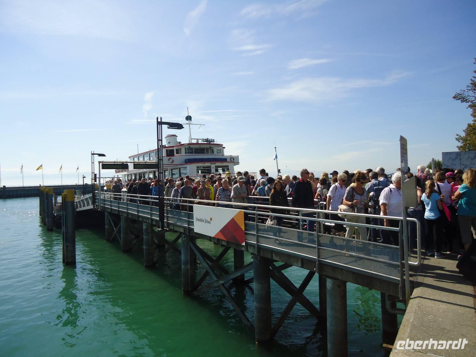 In Meersburg angekommen, posieren wir unterhalb der Burg (der ältesten Wohnburg Deutschlands) erst einmal für das Gruppenfoto. Anschließend bummeln wir entlang der Seepromenade, Richtung Hafen. Erste Eindrücke aufnehmend besteigen wir kurze Zeit später das Schiff, welches uns auf die Insel bringen wird