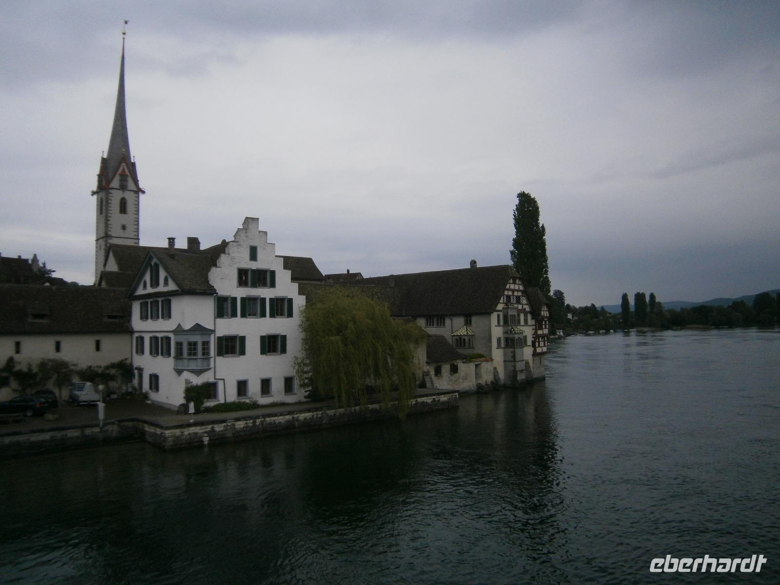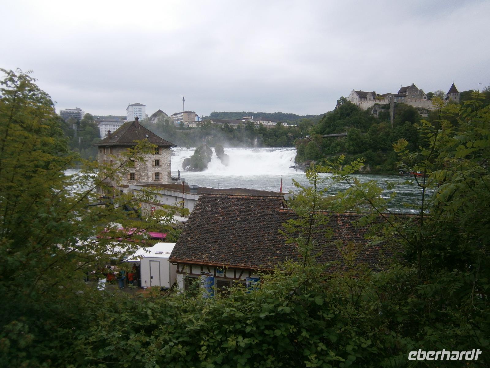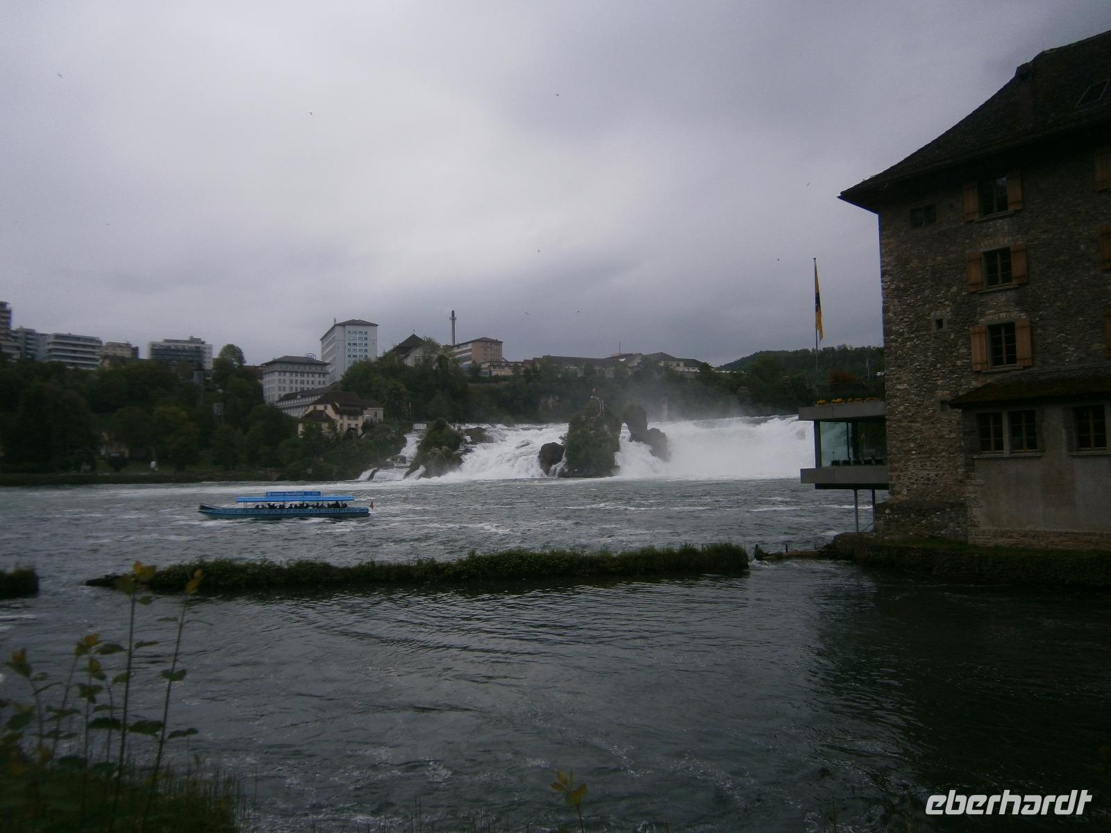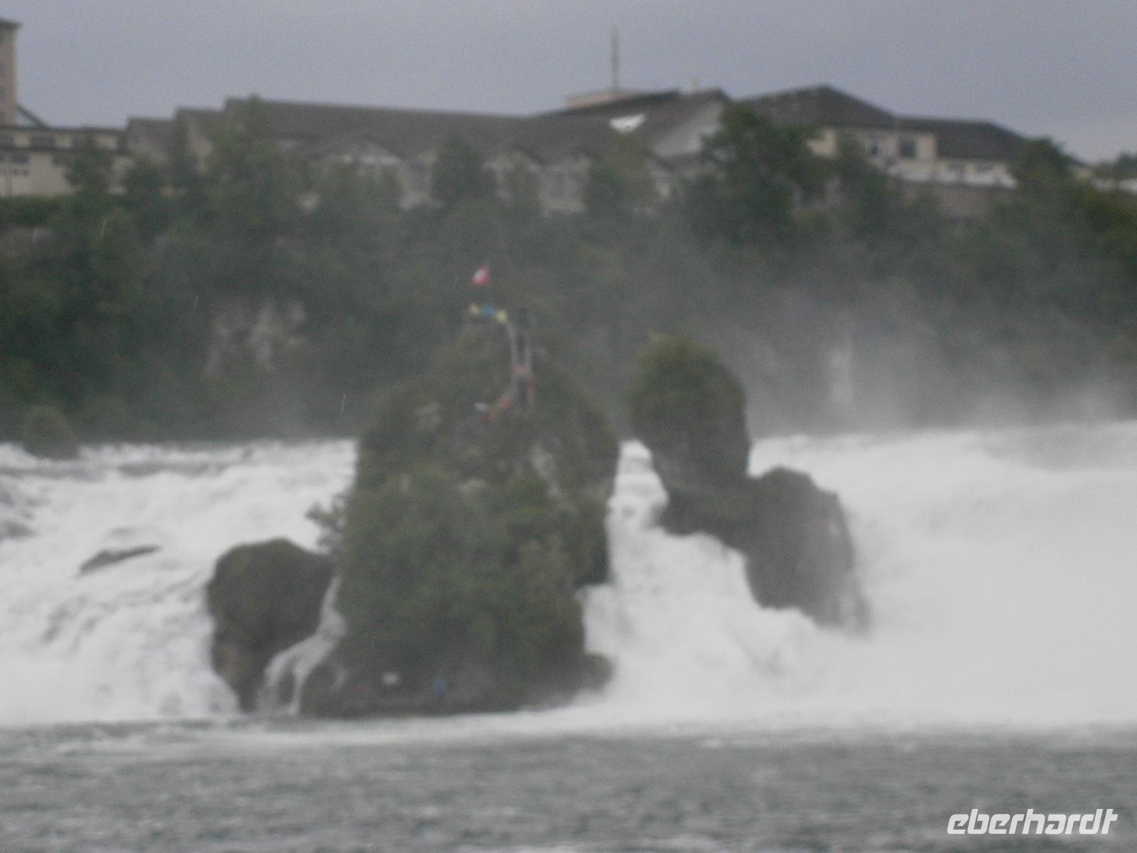 Am dritten Tag unserer Reise besuchten wir ebenfalls die Südseite des Bodensees, die hauptsächlich auf Schweizer Territorium liegt. Unser erstes Ziel war der Rheinfall bei der Stadt Schaffhausen. Hier stürzen die Wassermassen des Rheins, einige km nach dem Austritt aus dem Untersee, 23 m in die Tiefe. Dieses beeindruckende Spektakel konnten wir von Land aus, bei leichten Regen genießen. Durch die vorherigen Niederschläge im Gebiet des Bodensees wirkte der Wasserfall noch gigantischer, als üblich.