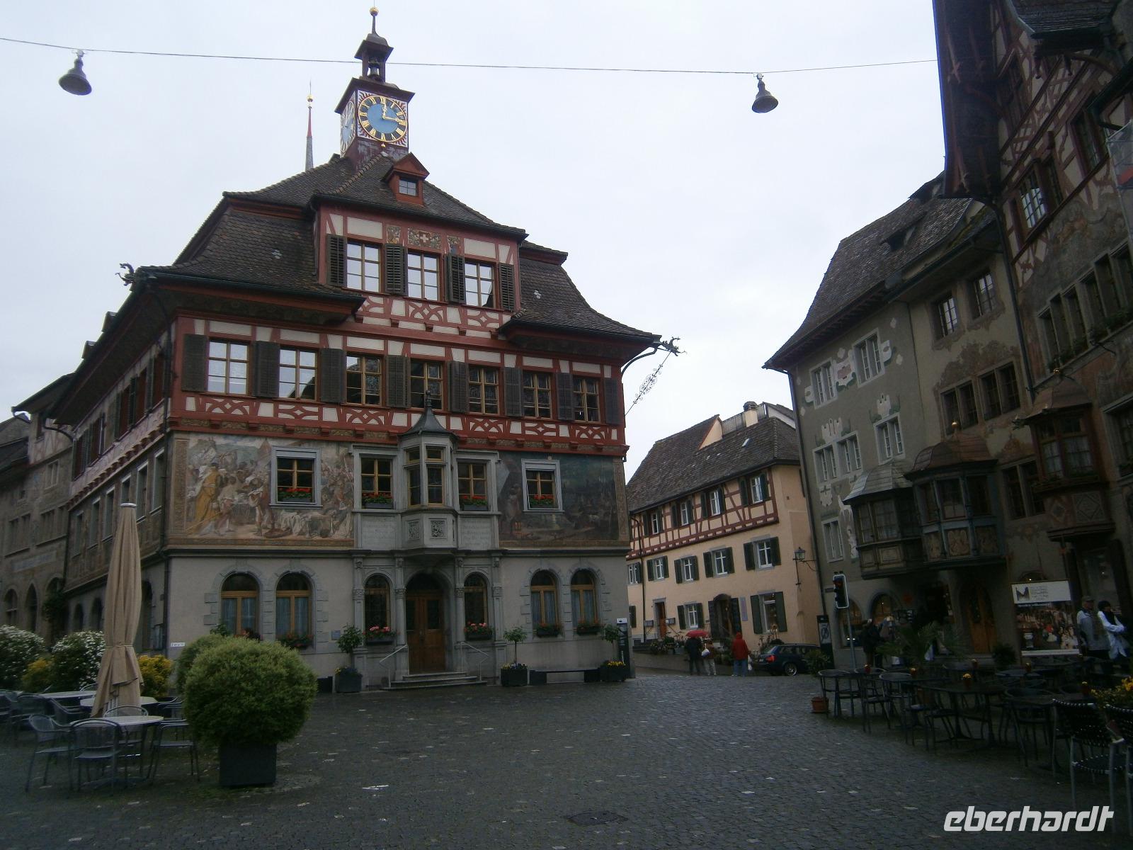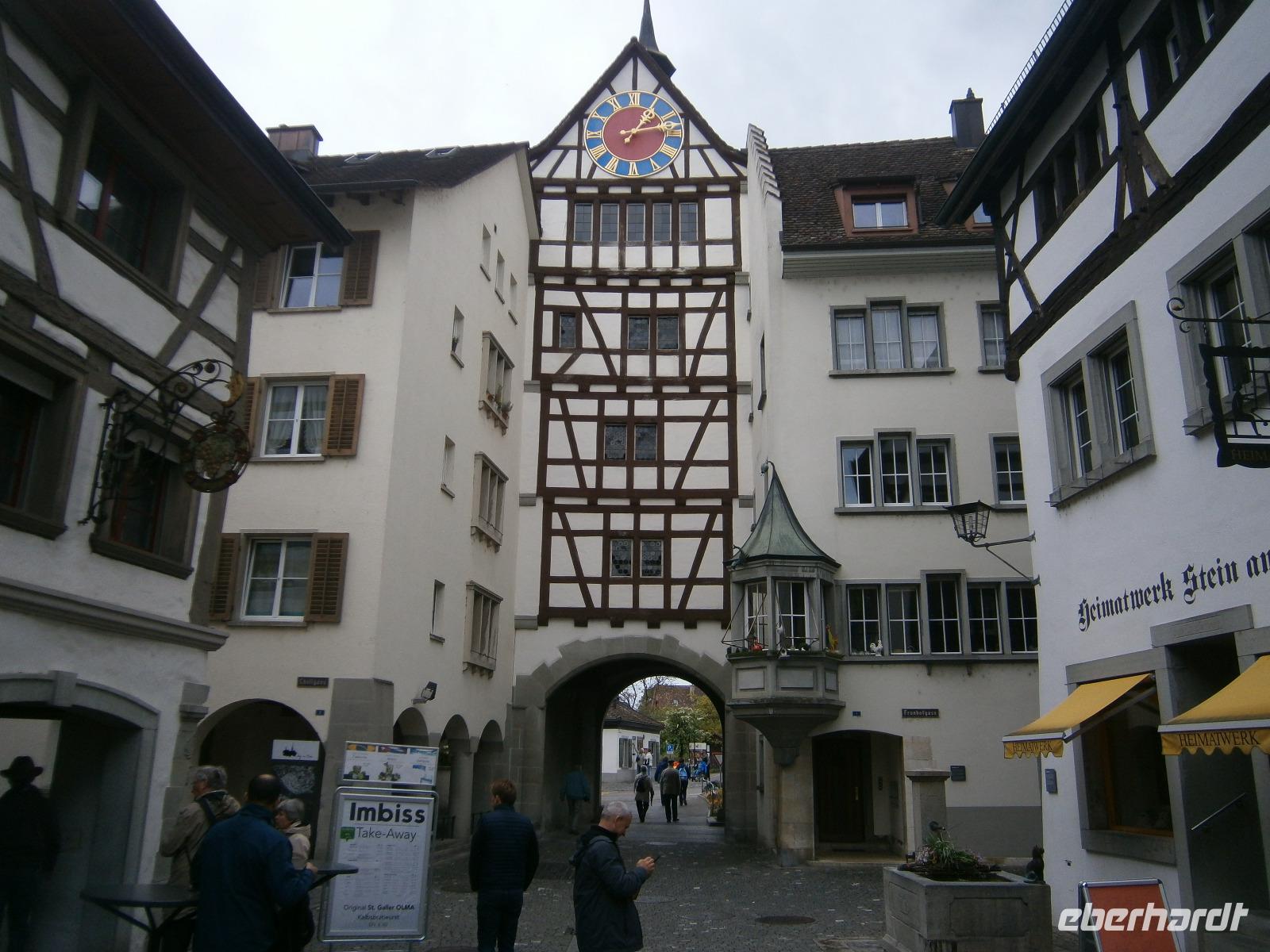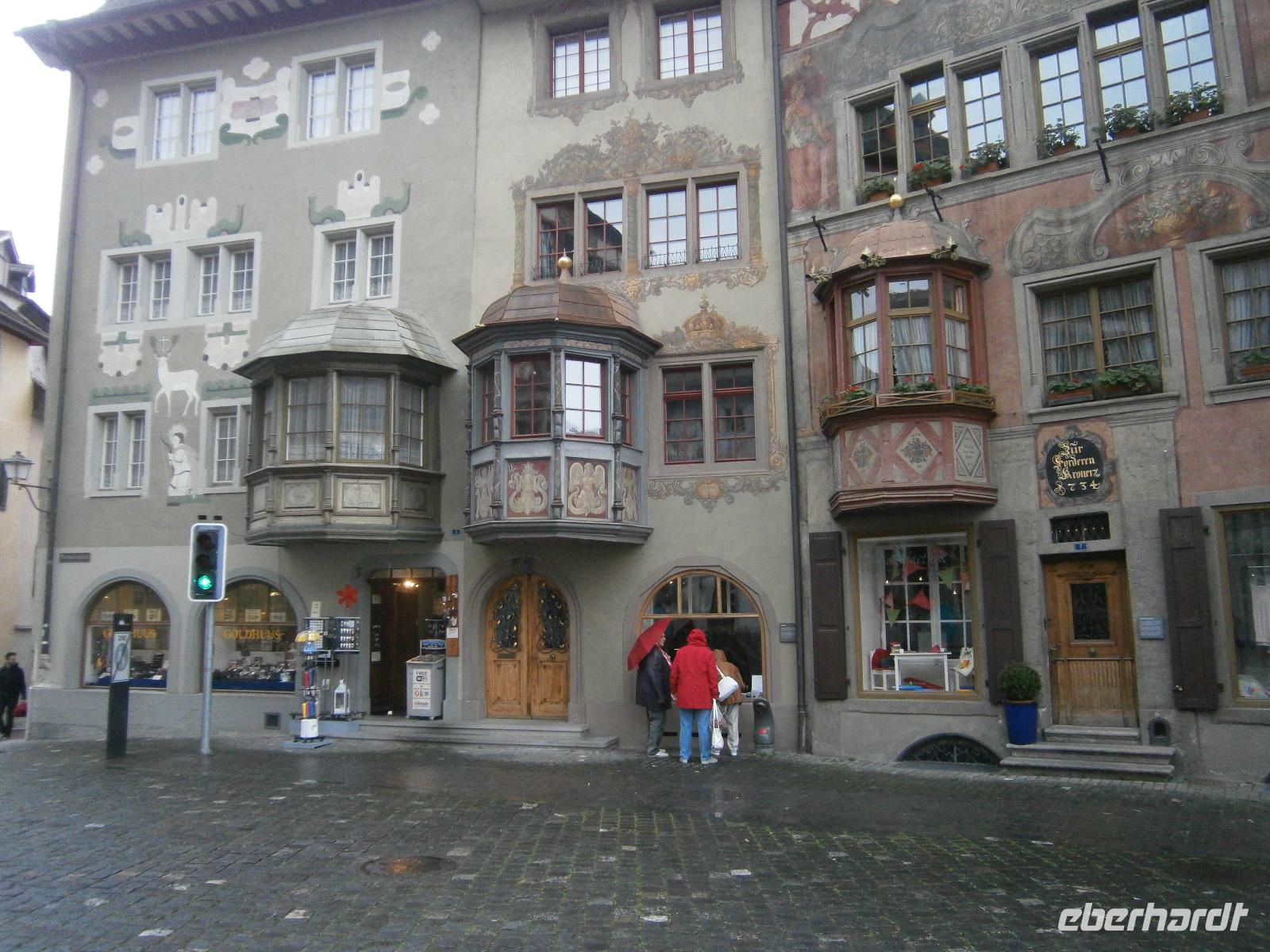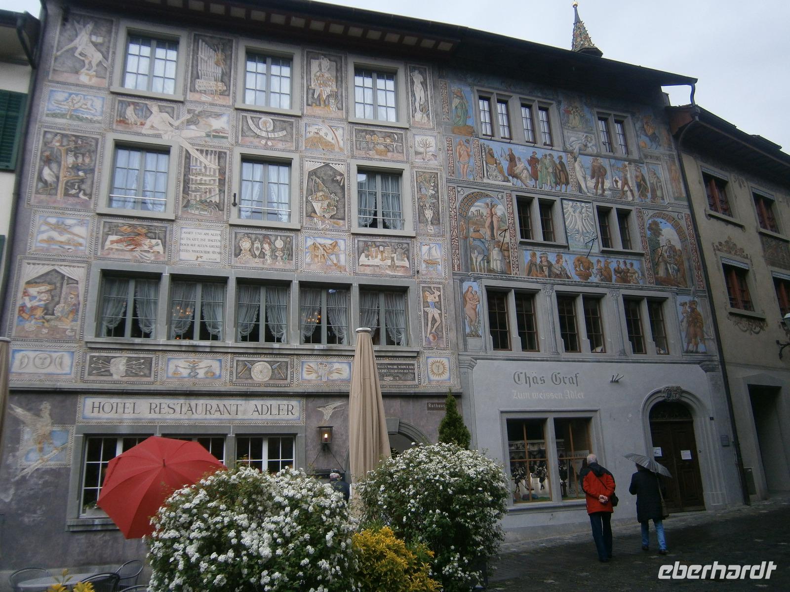 Anschließend fuhren wir nach Stein am Rhein, dem viel besuchten „Rothenburg des Hochrheins". Hier am km 1 des Rheinlaufs, erzählen Häuser Geschichten. An den Fassaden findet man Darstellungen u.a. von David und Goliath, Diogenes mit dem Faß sowie Allegorien von Klugheit und Liebe, Krieg und Frieden. Im Zentrum, zwischen den beiden Stadttoren, kann man schön bummeln oder eine der zahlreichen Restaurants oder Cafe's aufsuchen. Das „Lindwurmmuseum" und das Klostermuseum „St. Georg" laden zum Besuch ein. Auch J.W.Goethe besuchte viermal diesen malerischen Ort.