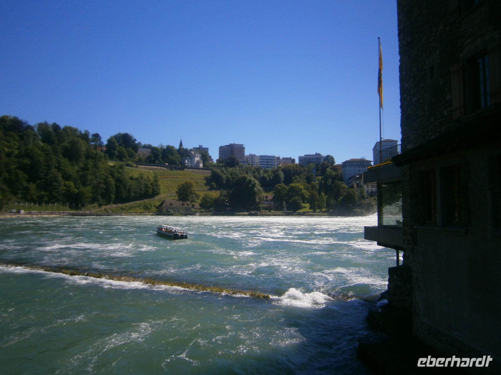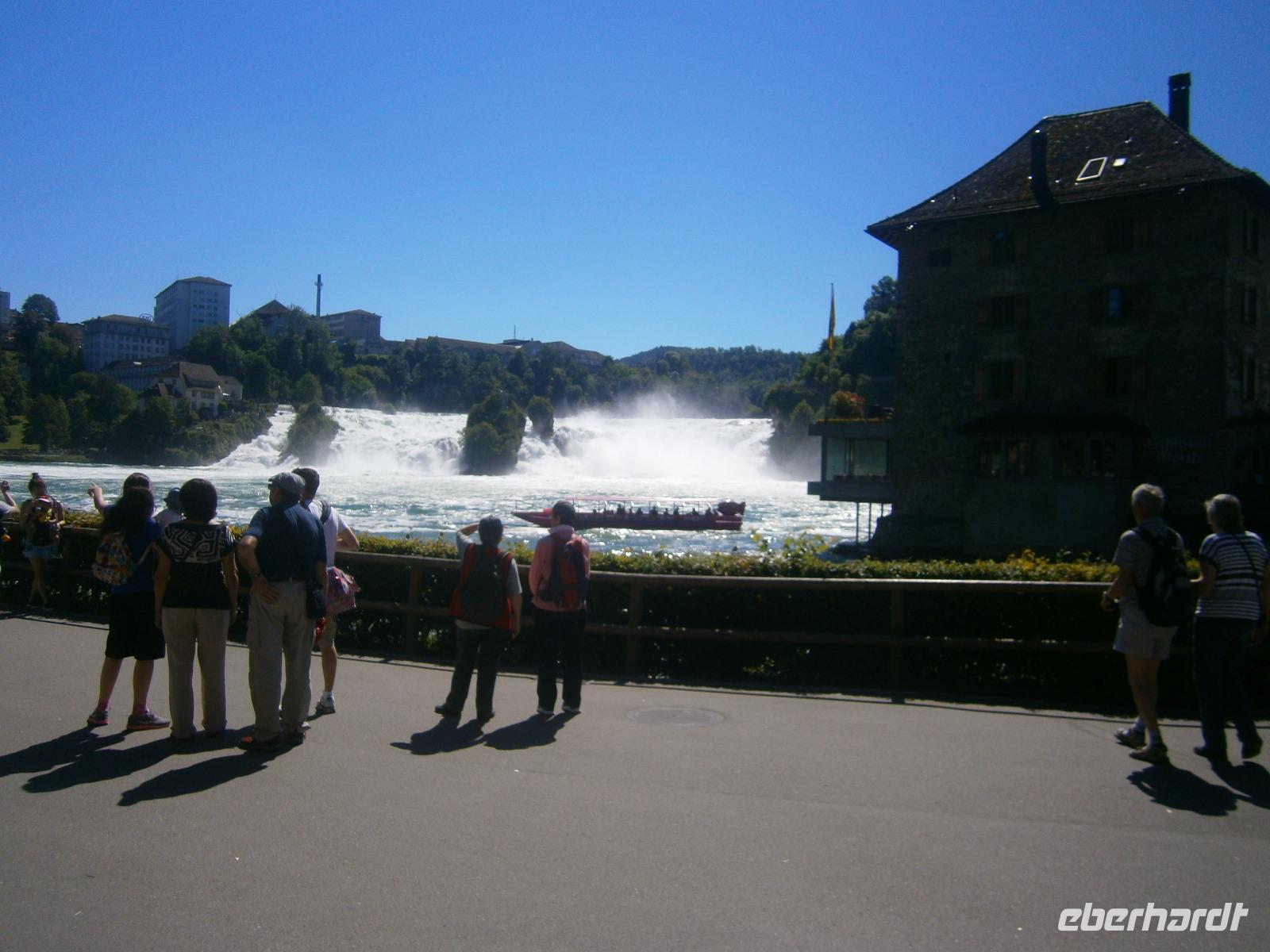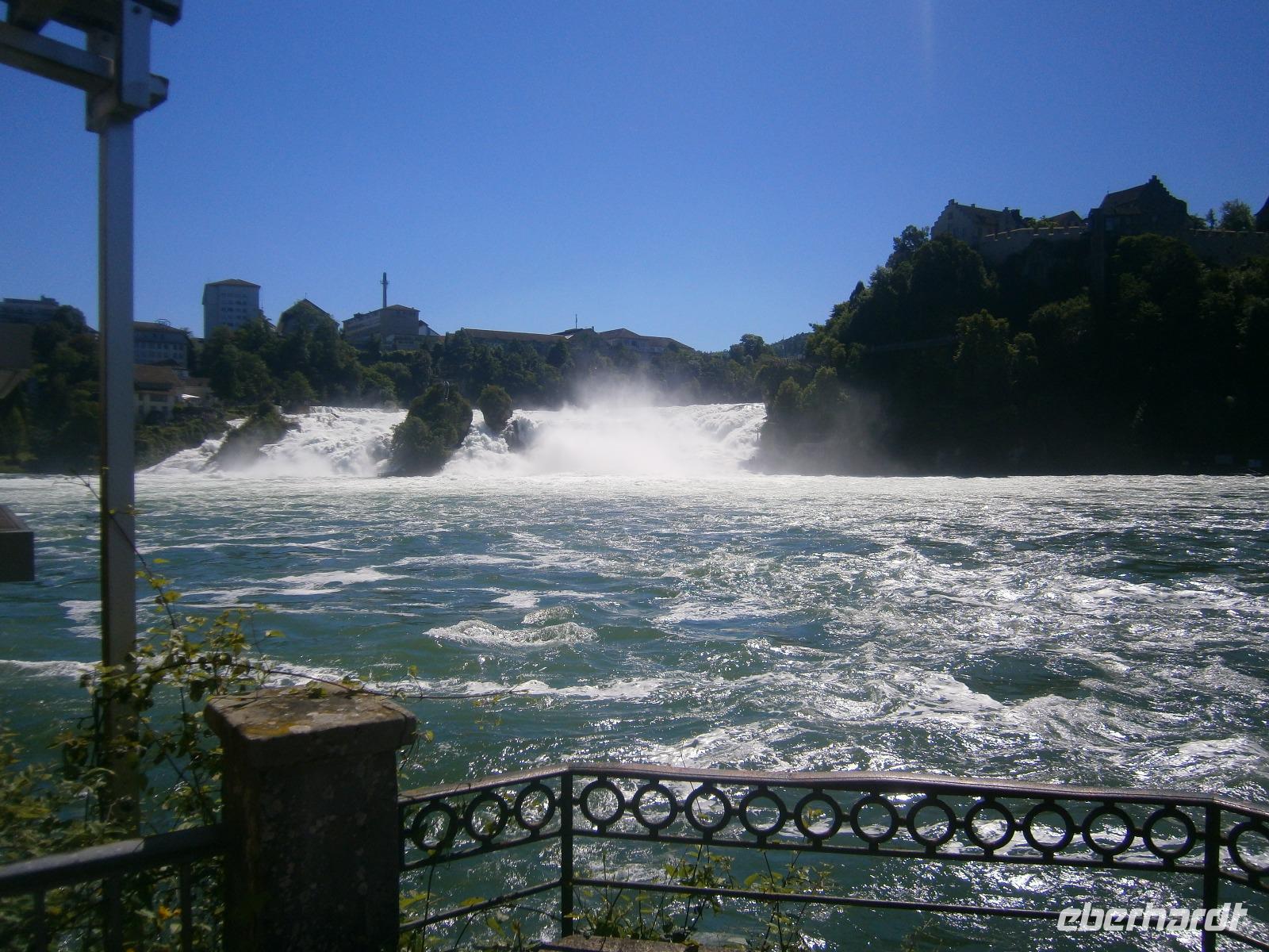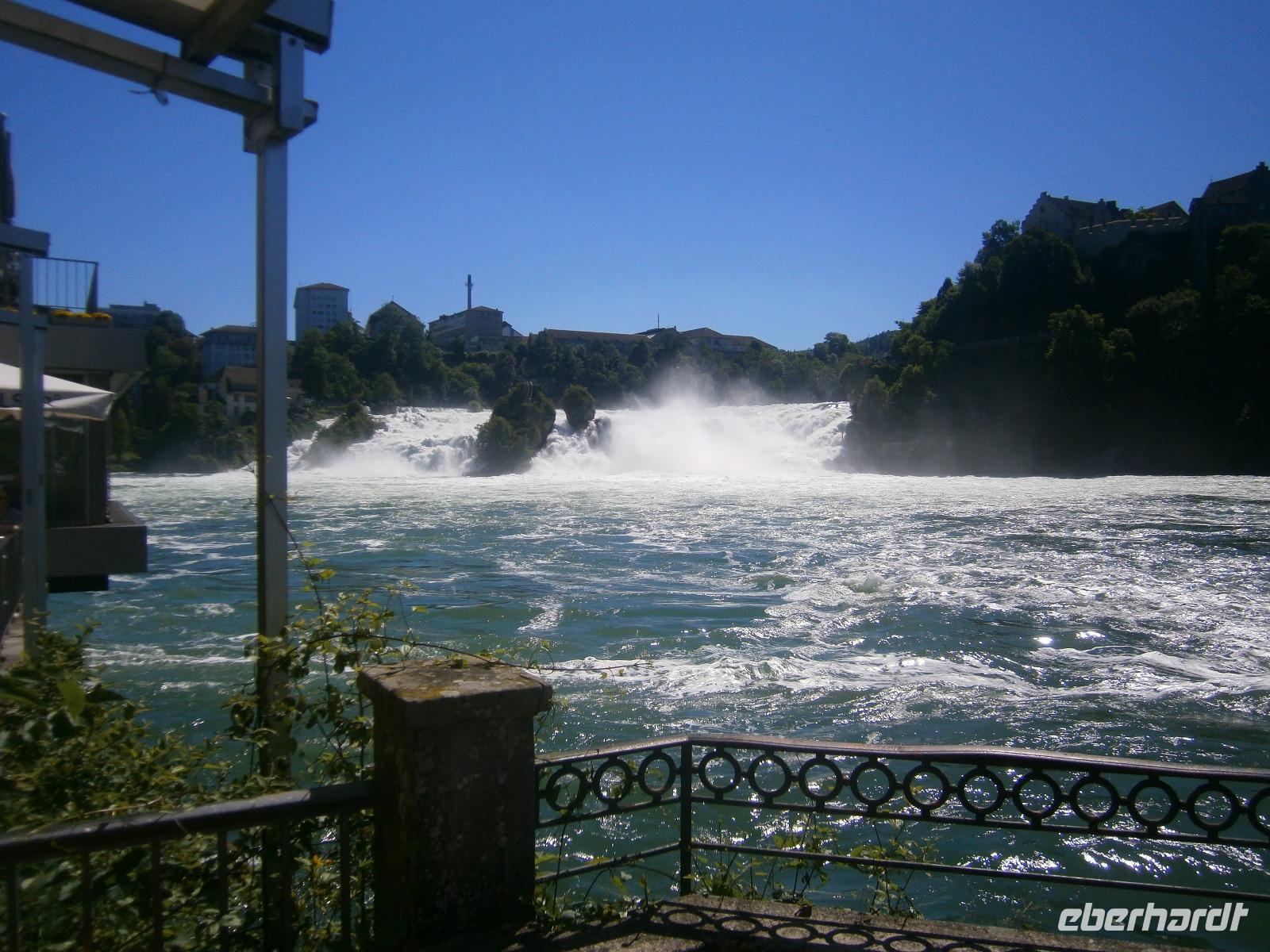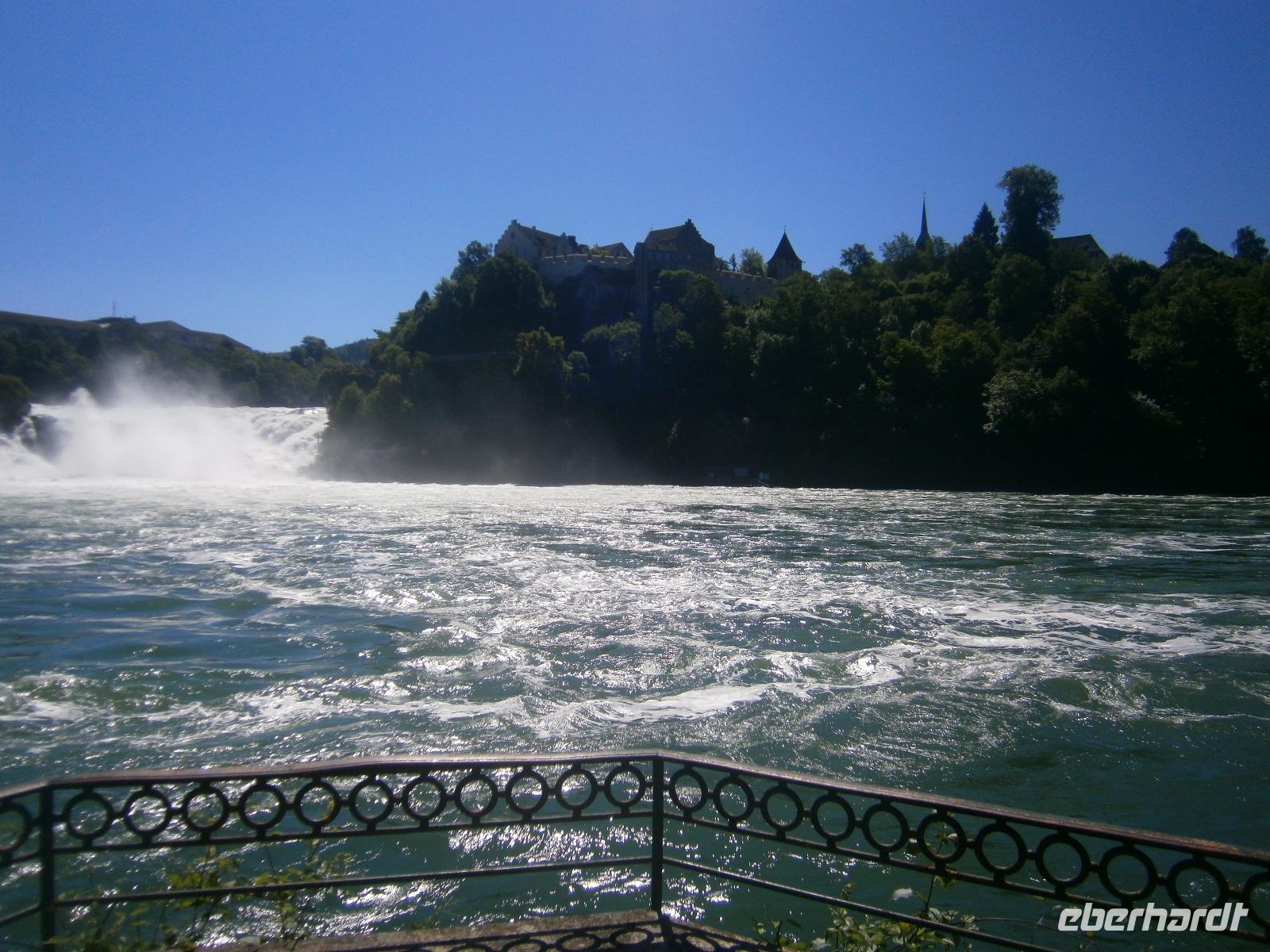 Am dritten Tag unserer Reise besuchten wir ebenfalls die Südseite des Bodensees, die hauptsächlich auf Schweizer Territorium liegt. Unser erstes Ziel war der Rheinfall bei der Stadt Schaffhausen. Hier stürzen die Wassermassen des Rheins, einige km nach dem Austritt aus dem Untersee, 23 m in die Tiefe. Dieses beeindruckende Spektakel konnten wir von Land aus, bei bestem Hochsommerwetter genießen. Durch die vorherigen Niederschläge im Gebiet des Bodensees wirkte der Wasserfall noch gigantischer, als üblich.