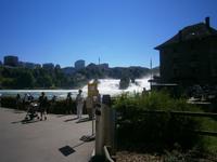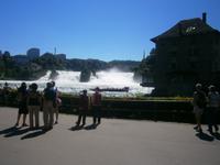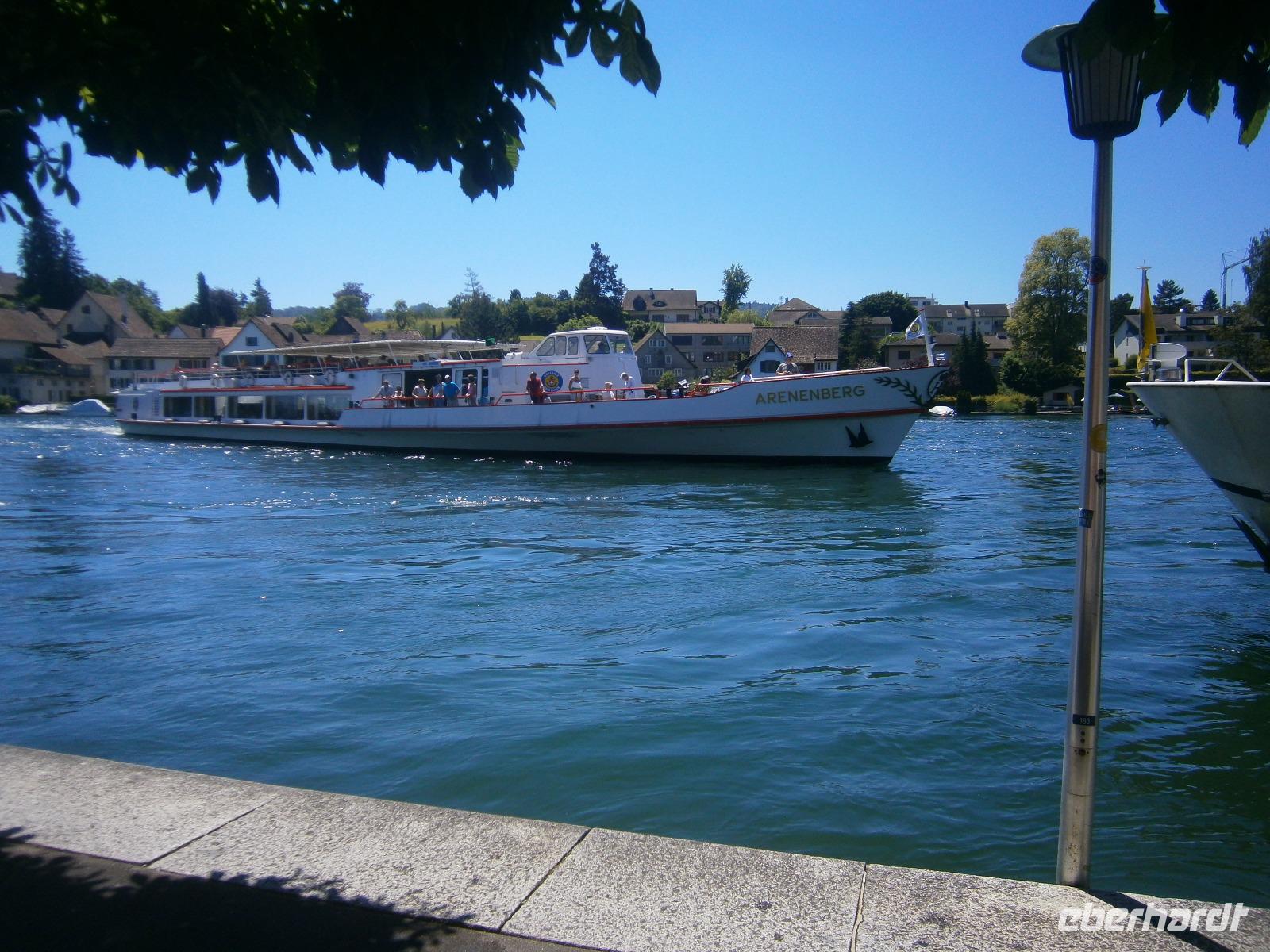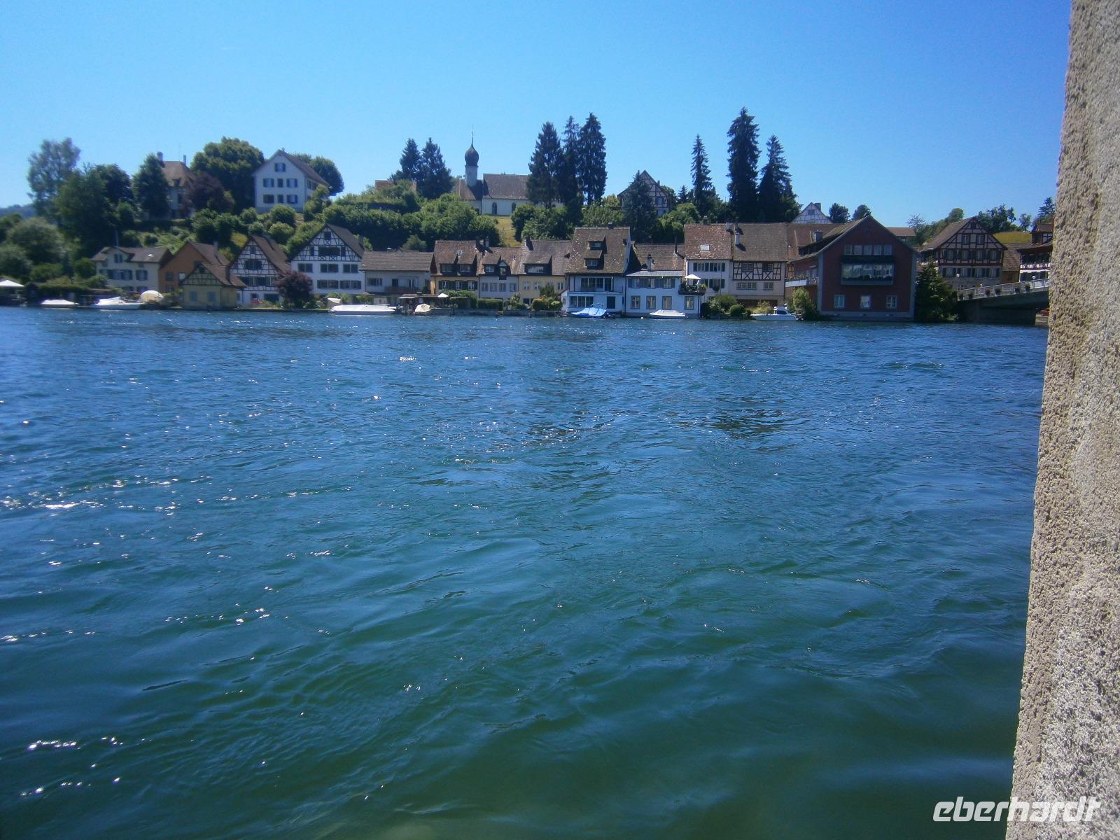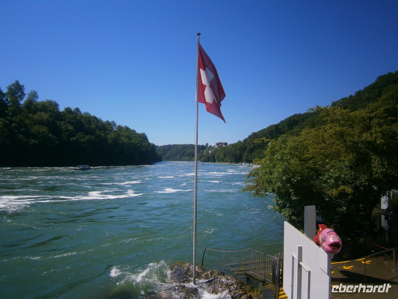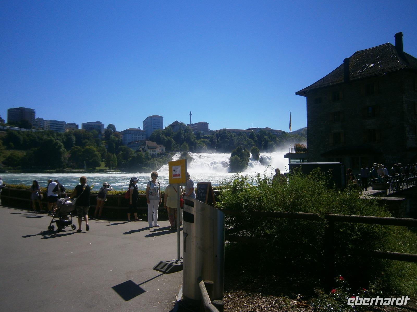 Am dritten Tag unserer Reise besuchten wir ebenfalls die Südseite des Bodensees, die hauptsächlich auf Schweizer Territorium liegt. Unser erstes Ziel war der Rheinfall bei der Stadt Schaffhausen. Hier stürzen die Wassermassen des Rheins, einige km nach dem Austritt aus dem Untersee, 23 m in die Tiefe. Dieses beeindruckende Spektakel konnten wir von Land aus, bei bestem Hochsommerwetter genießen. Durch die vorherigen Niederschläge im Gebiet des Bodensees wirkte der Wasserfall noch gigantischer, als üblich.
