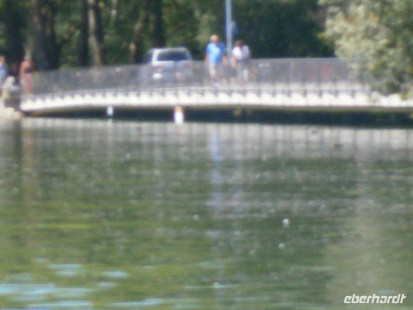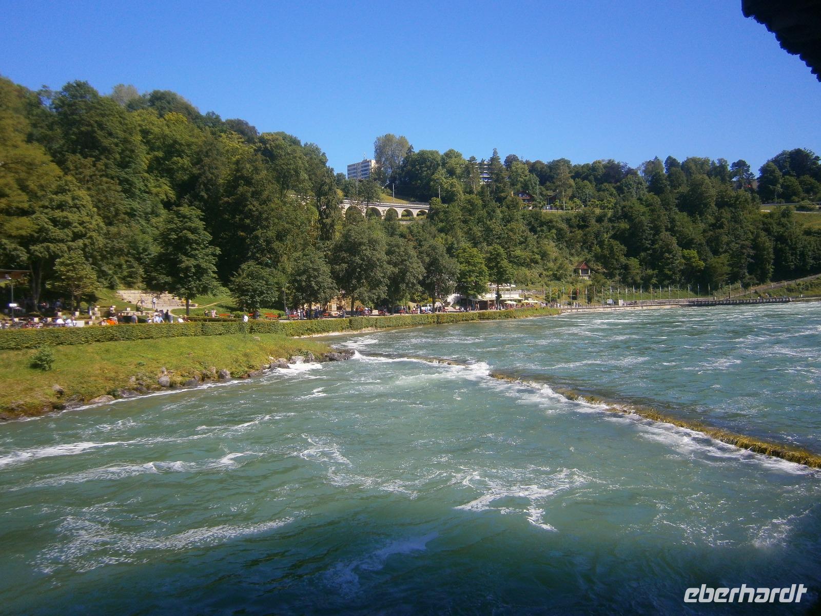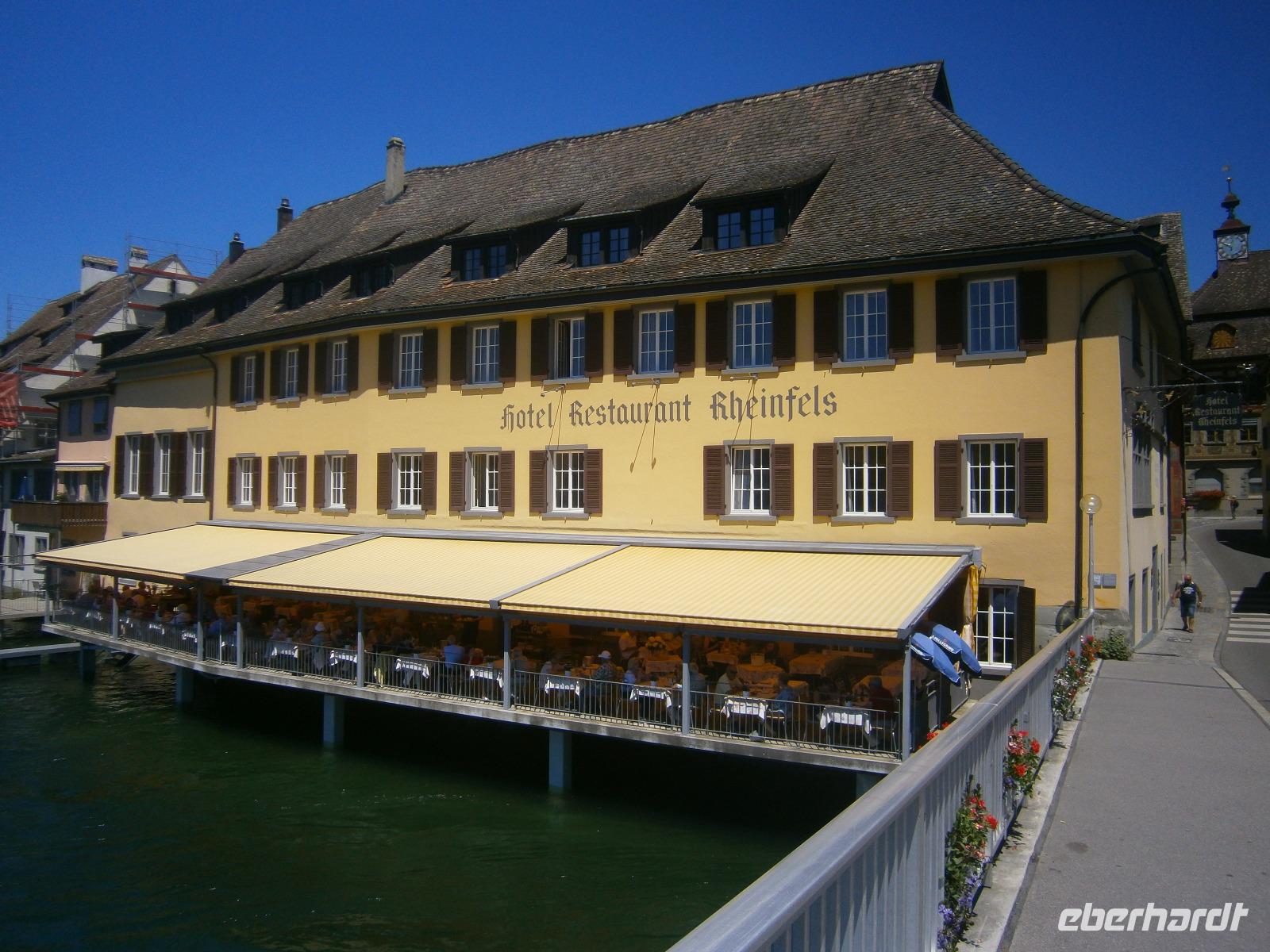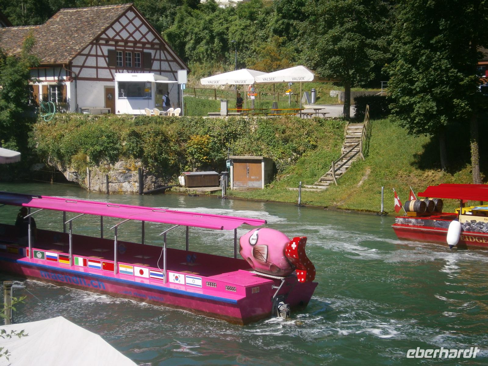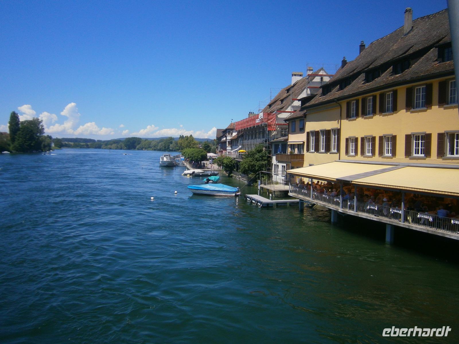 Am dritten Tag unserer Reise besuchten wir ebenfalls die Südseite des Bodensees, die hauptsächlich auf Schweizer Territorium liegt. Unser erstes Ziel war der Rheinfall bei der Stadt Schaffhausen. Hier stürzen die Wassermassen des Rheins, einige km nach dem Austritt aus dem Untersee, 23 m in die Tiefe. Dieses beeindruckende Spektakel konnten wir von Land aus, bei bestem Hochsommerwetter genießen. Durch die vorherigen Niederschläge im Gebiet des Bodensees wirkte der Wasserfall noch gigantischer, als üblich.