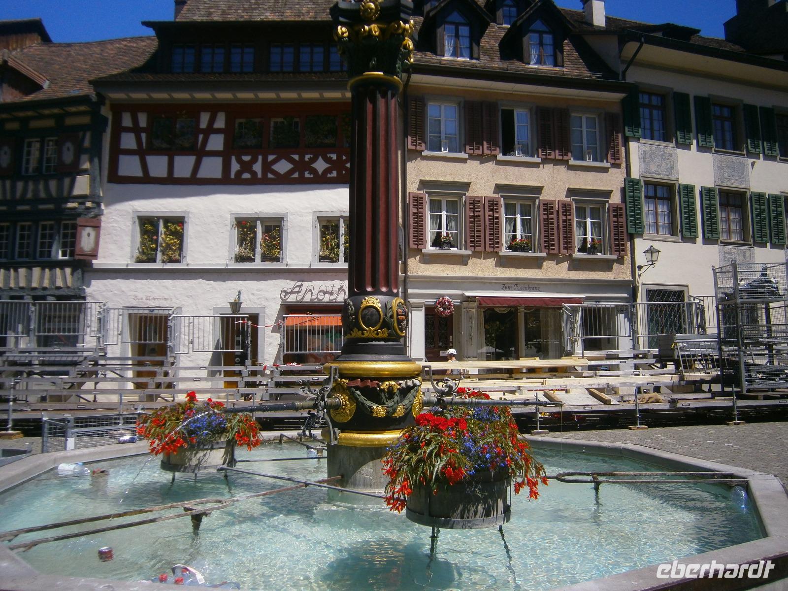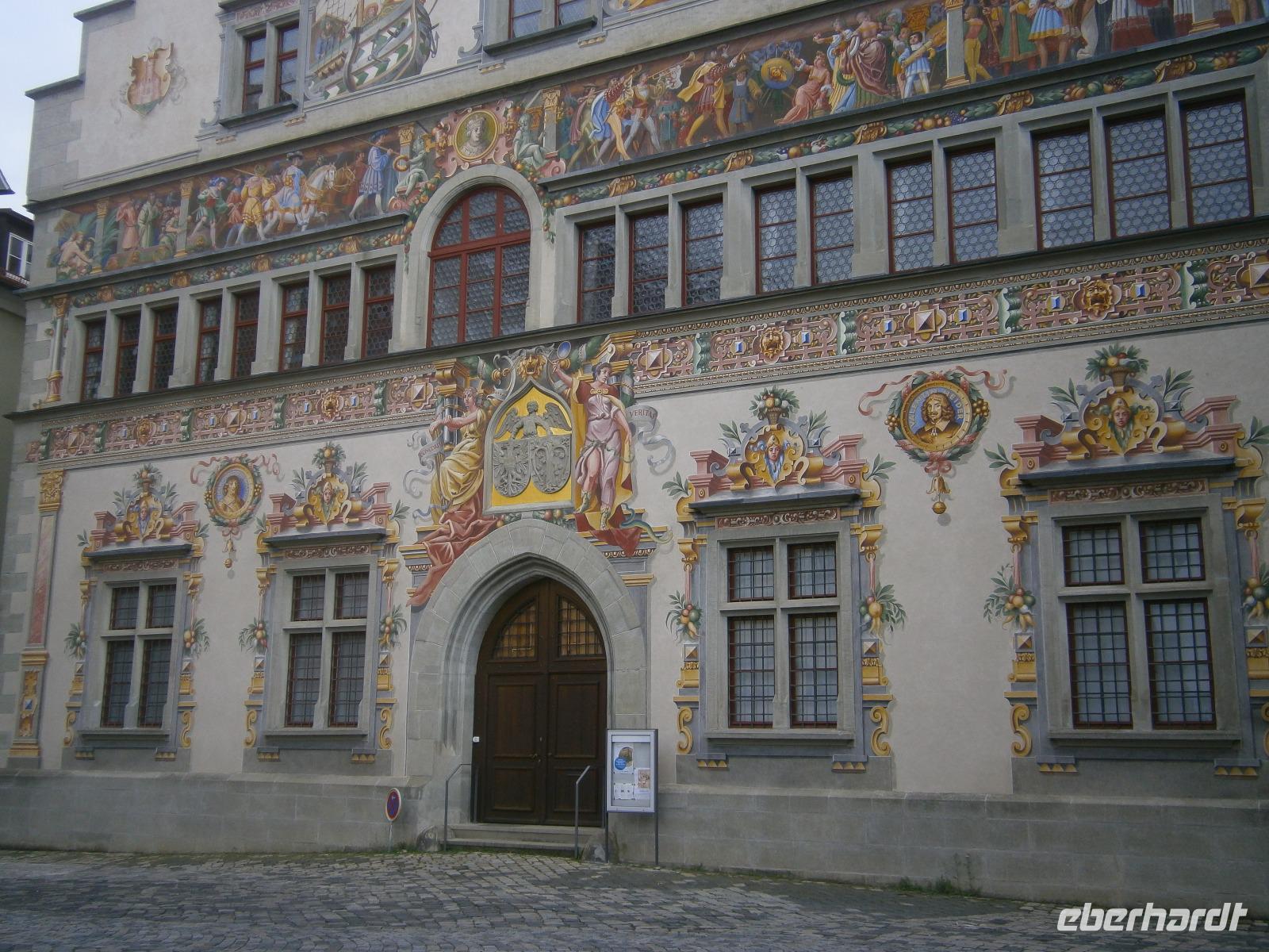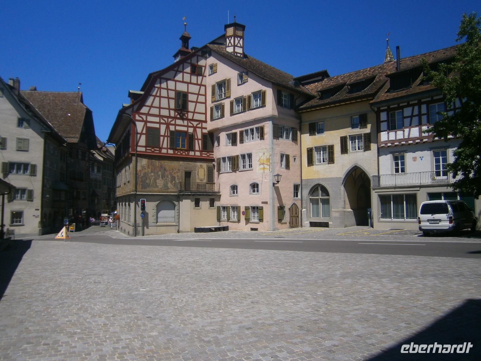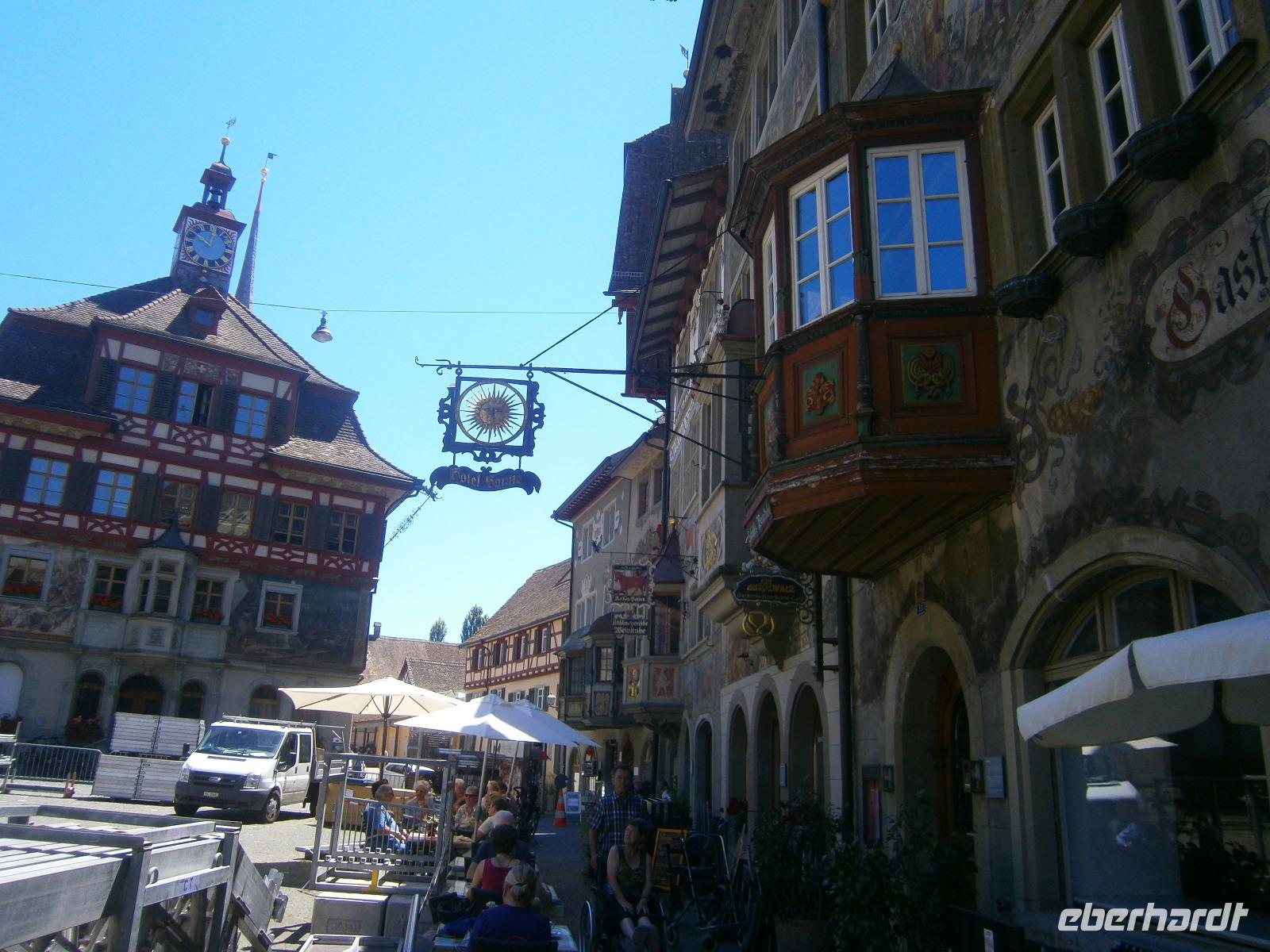 Leider war die Sicht zum Besuchszeitpunkt eingeschränkt, da unmittelbar am Rathausplatz gewerkelt wurde. Vom 09.Juli bis 13. August dieses Jahres finden hier die Freilichtspiele statt. Dort wird dann „Lebendiges Mittelalter" in Stein am Rhein gezeigt. Gegenwärtig werden die Zuschauerplätze und Bühne aufgebaut.