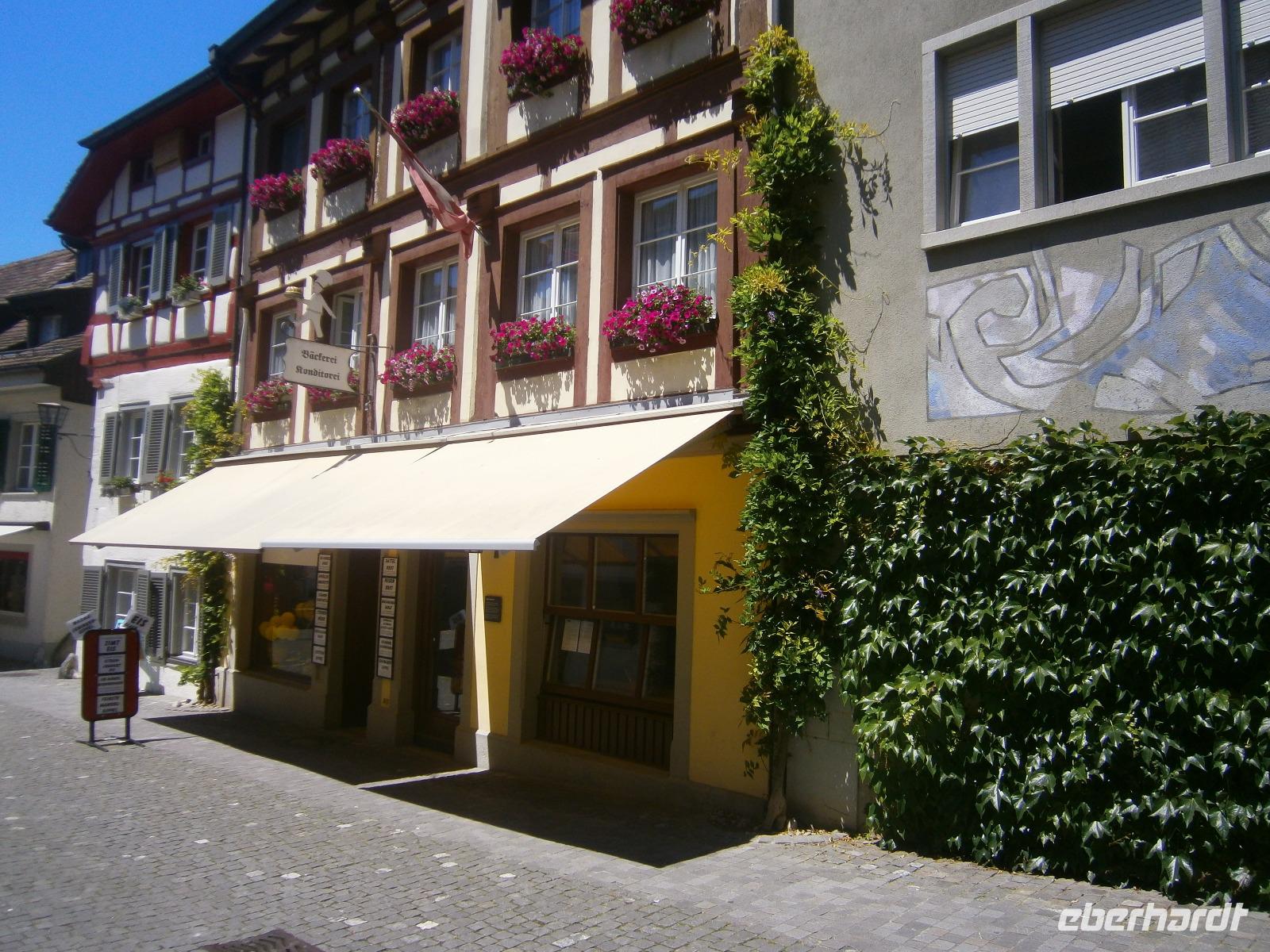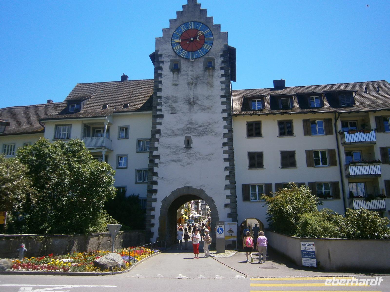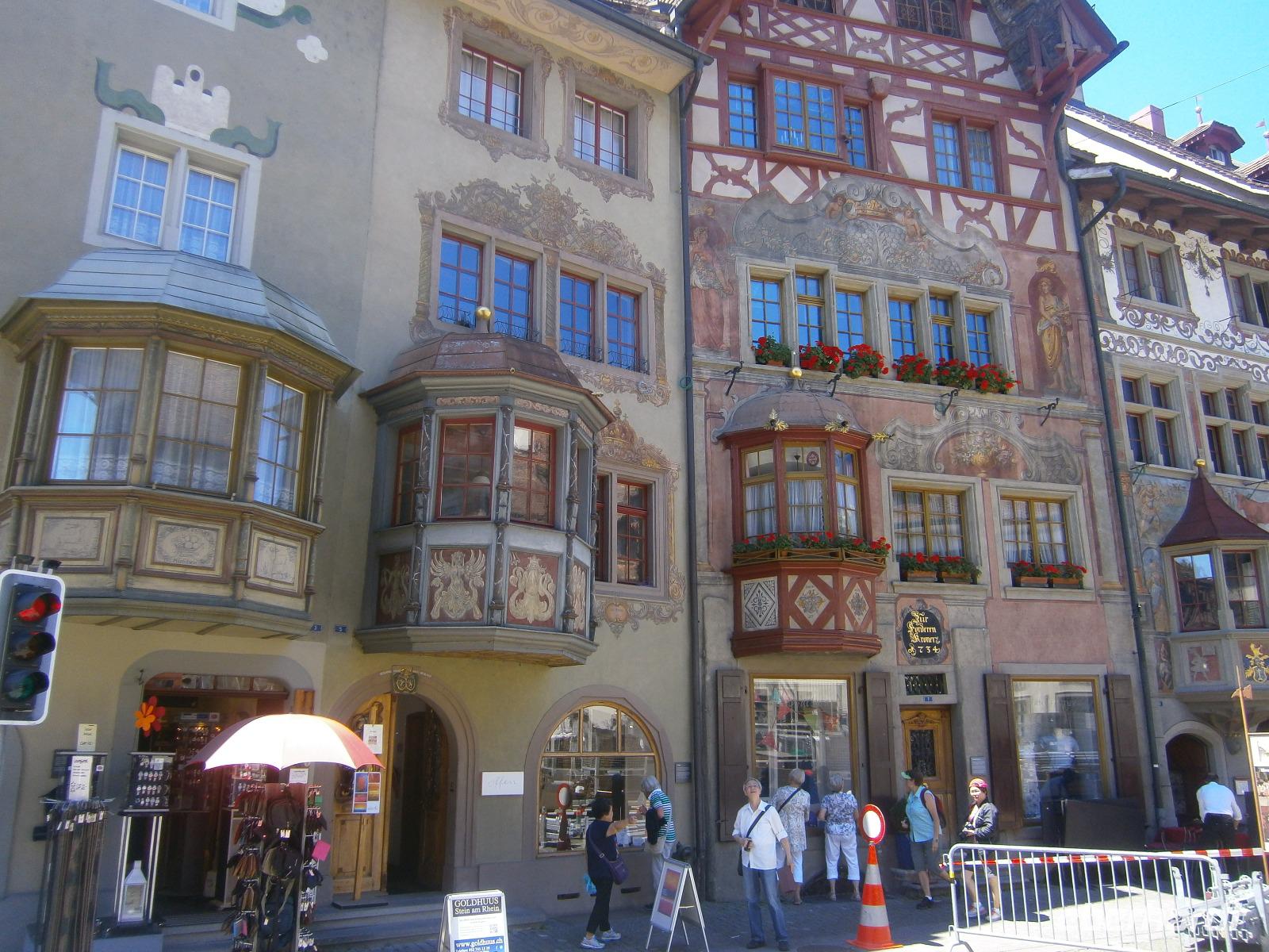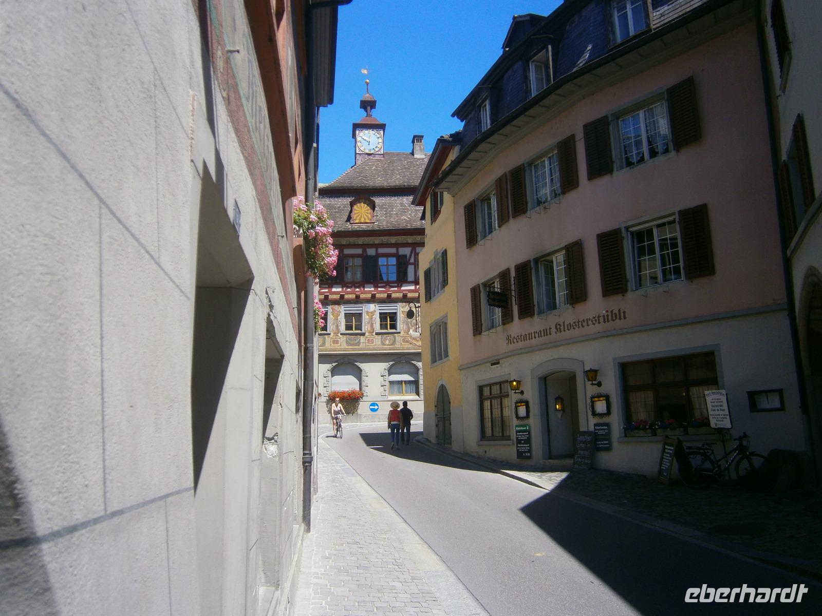 Anschließend fuhren wir nach Stein am Rhein, dem viel besuchten „Rothenburg des Hochrheins". Hier am km 1 des Rheinlaufs, erzählen Häuser Geschichten. An den Fassaden findet man Darstellungen u.a. von David und Goliath, Diogenes mit dem Faß sowie Allegorien von Klugheit und Liebe, Krieg und Frieden. Im Zentrum, zwischen den beiden Stadttoren, kann man schön bummeln oder eine der zahlreichen Restaurants oder Cafe's aufsuchen. Das „Lindwurmmuseum" und das Klostermuseum „St. Georg" laden zum Besuch ein. Auch J.W.Goethe besuchte viermal diesen malerischen Ort.