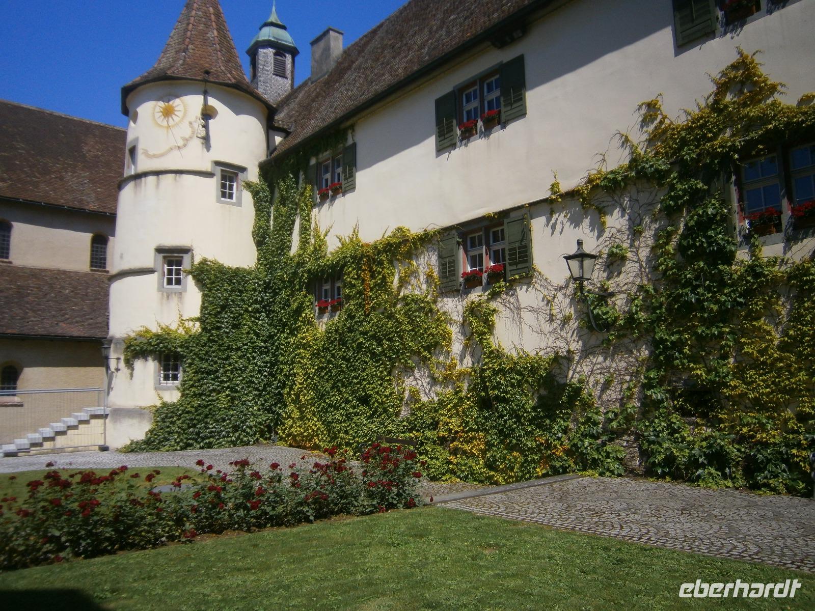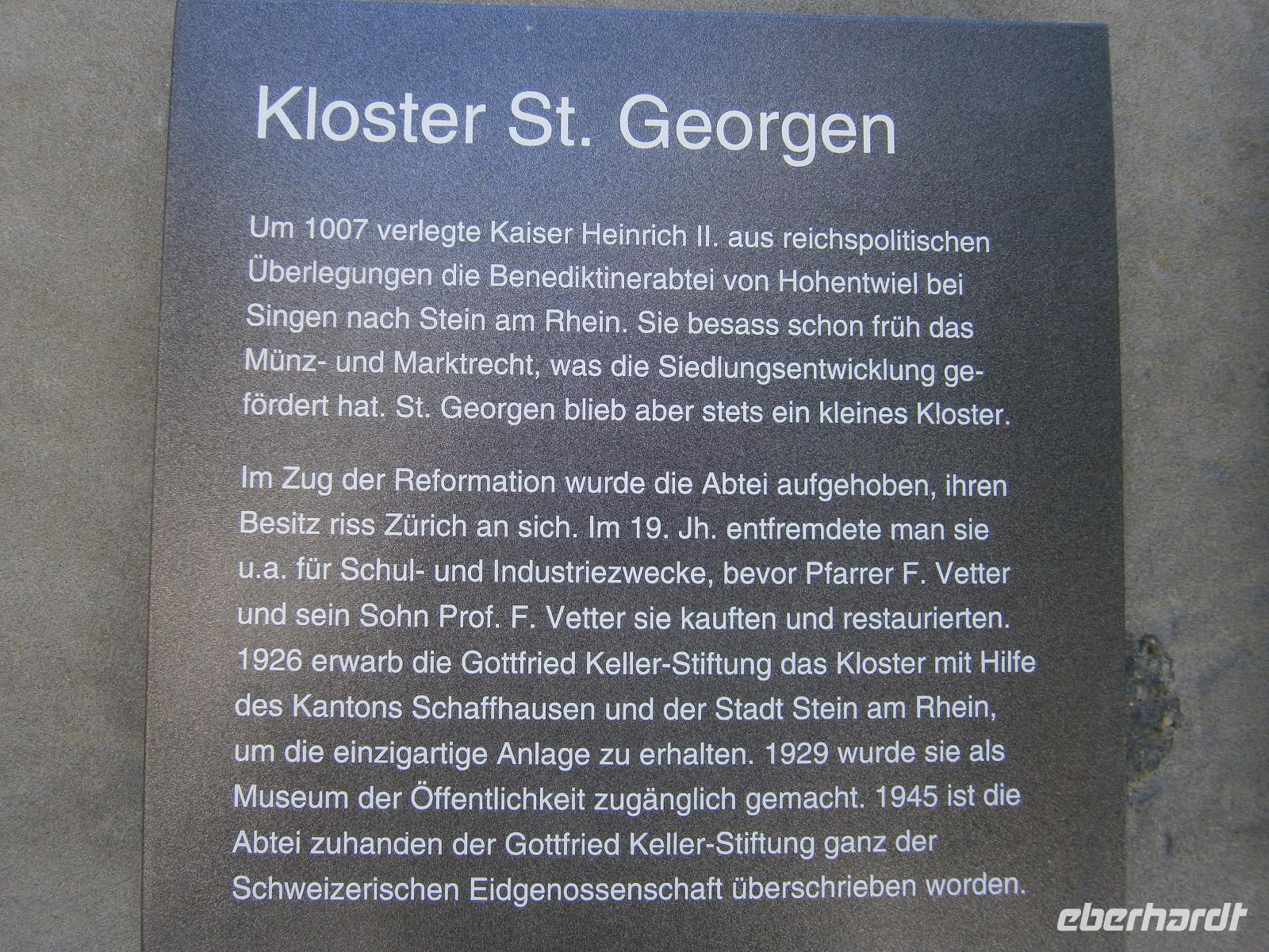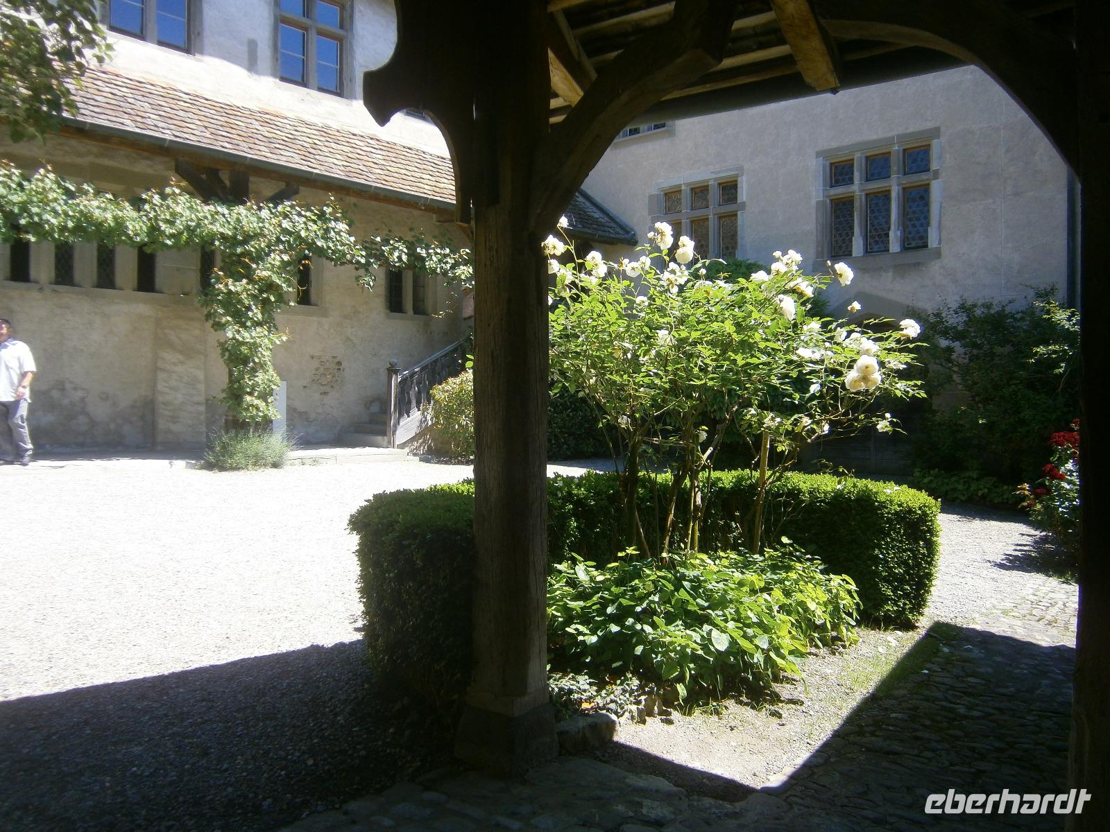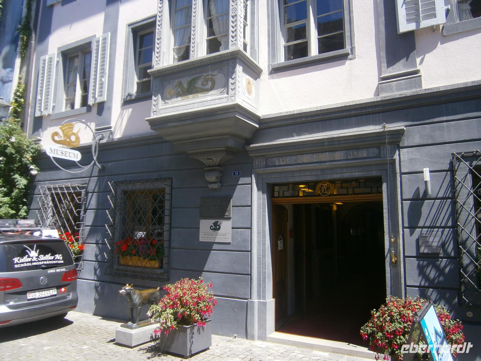 Anschließend fuhren wir nach Stein am Rhein, dem viel besuchten „Rothenburg des Hochrheins". Hier am km 1 des Rheinlaufs, erzählen Häuser Geschichten. An den Fassaden findet man Darstellungen u.a. von David und Goliath, Diogenes mit dem Faß sowie Allegorien von Klugheit und Liebe, Krieg und Frieden. Im Zentrum, zwischen den beiden Stadttoren, kann man schön bummeln oder eine der zahlreichen Restaurants oder Cafe's aufsuchen. Das „Lindwurmmuseum" und das Klostermuseum „St. Georg" laden zum Besuch ein. Auch J.W.Goethe besuchte viermal diesen malerischen Ort.