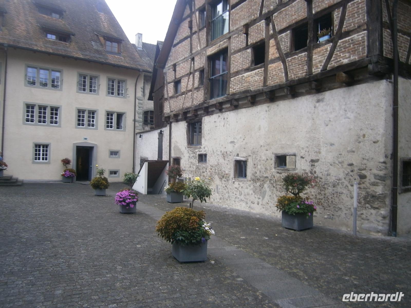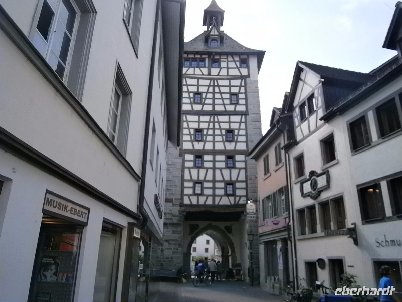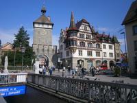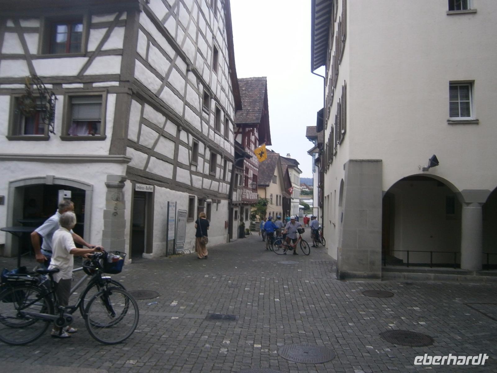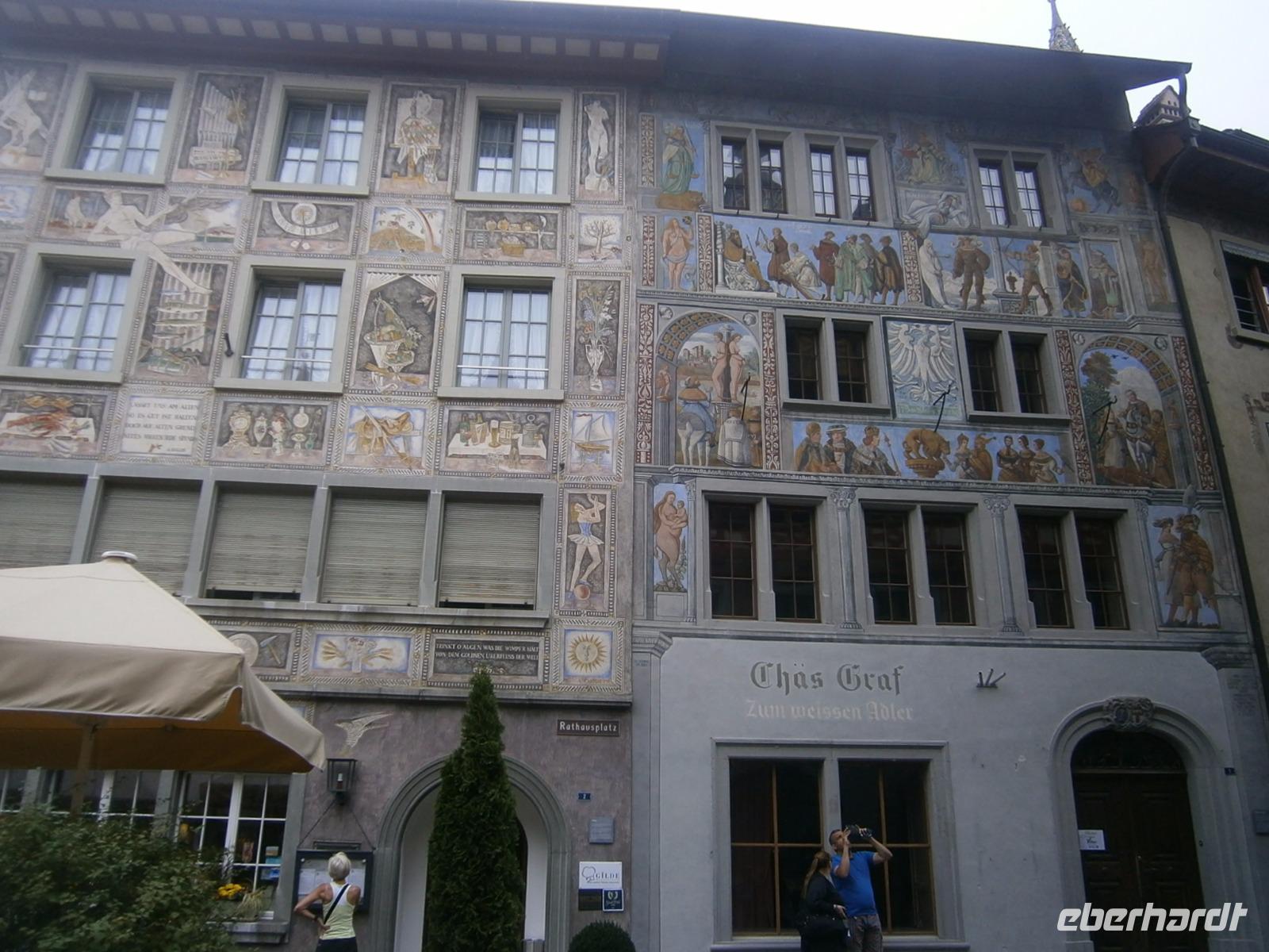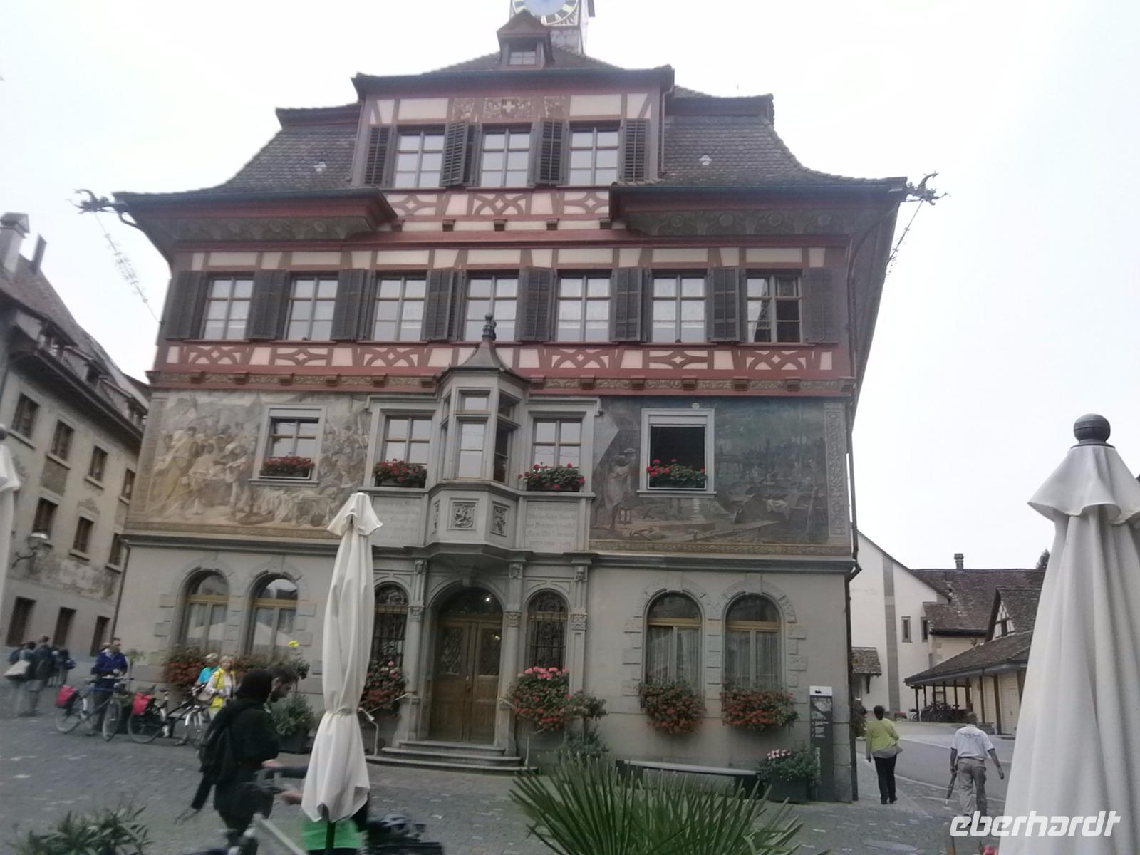Anschließend fuhren wir nach Stein am Rhein, dem viel besuchten „Rothenburg des Hochrheins". Hier am km 1 des Rheinlaufs, erzählen Häuser Geschichten. An den Fassaden findet man Darstellungen u.a. von David und Goliath, Diogenes mit dem Faß sowie Allegorien von Klugheit und Liebe, Krieg und Frieden. Im Zentrum, zwischen den beiden Stadttoren, kann man schön bummeln oder eine der zahlreichen Restaurants oder Cafe's aufsuchen. Das „Lindwurmmuseum" und das Klostermuseum „St. Georg" laden zum Besuch ein. Auch J.W.Goethe besuchte viermal diesen malerischen Ort.