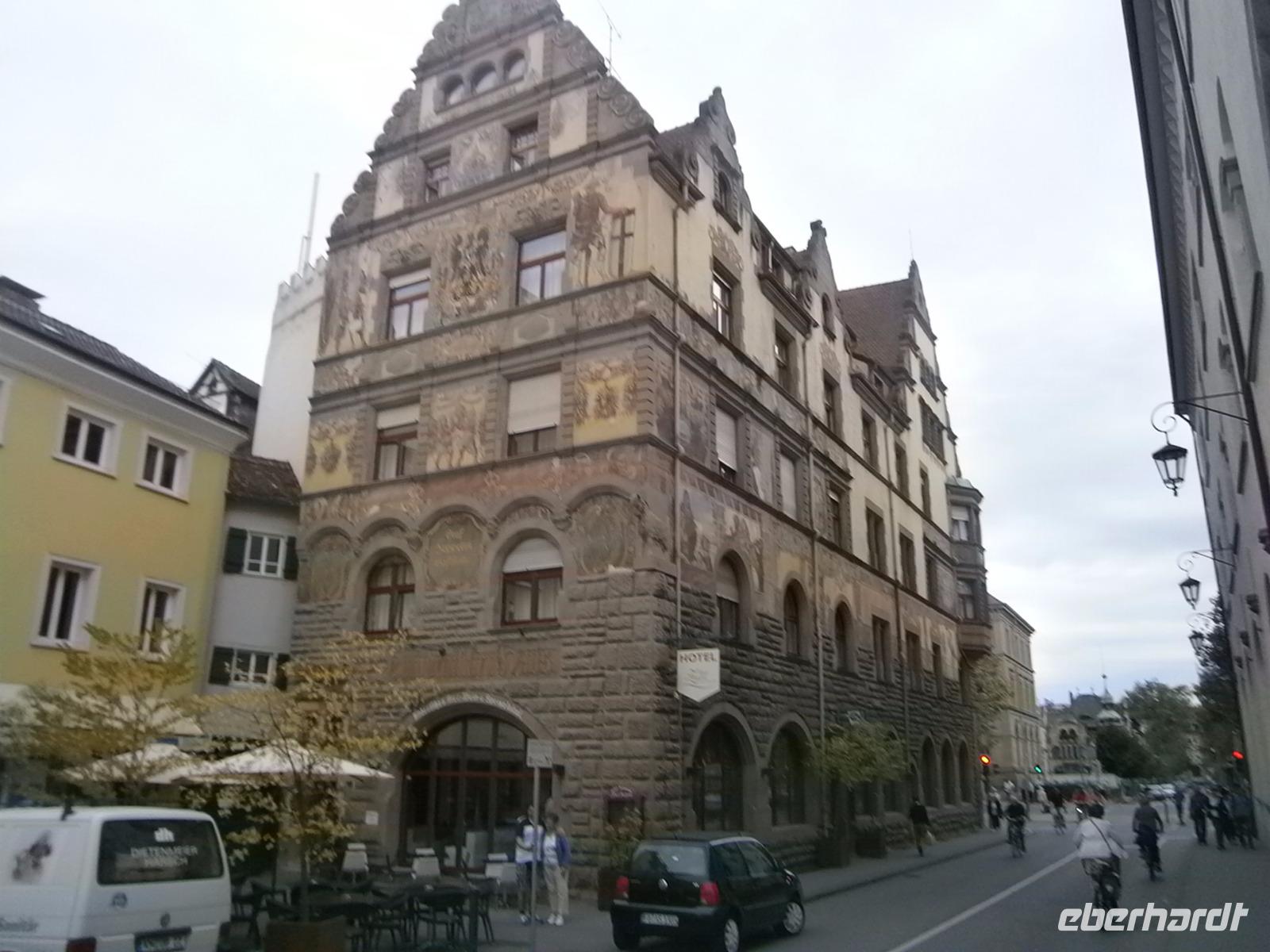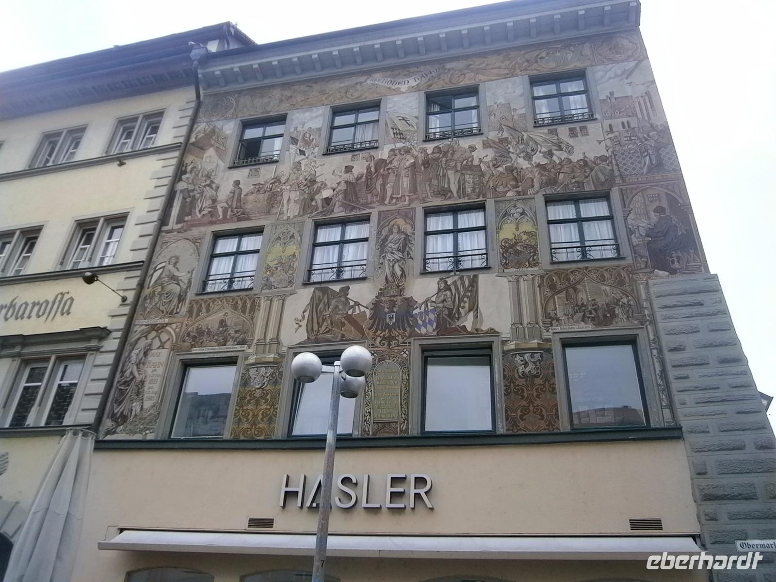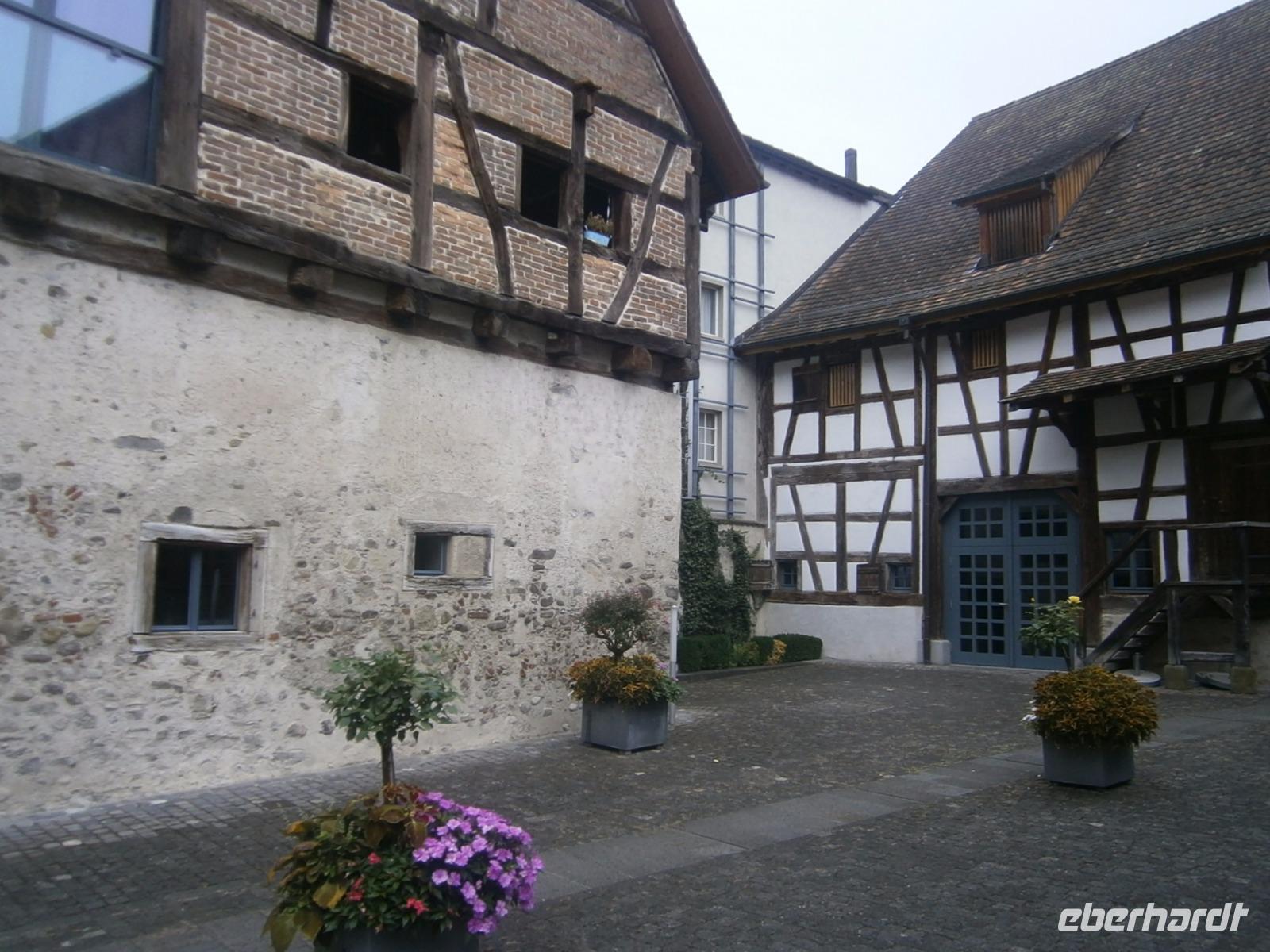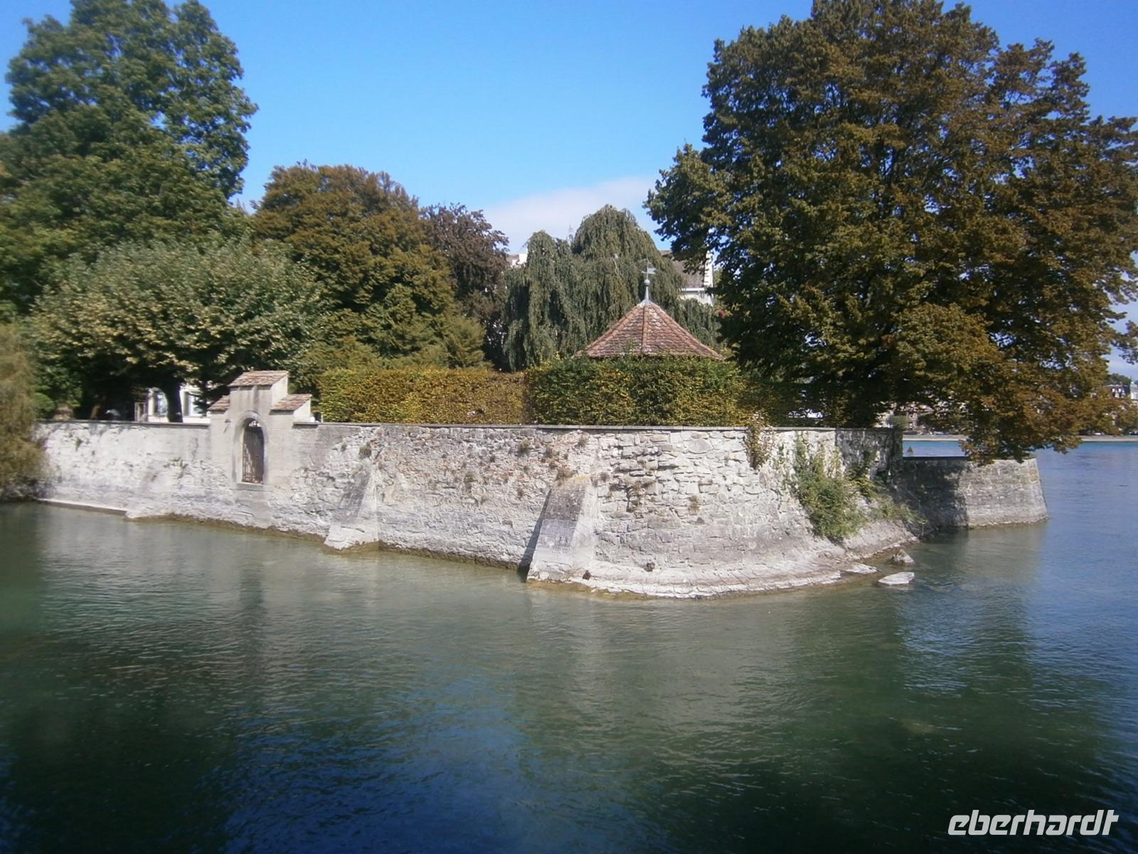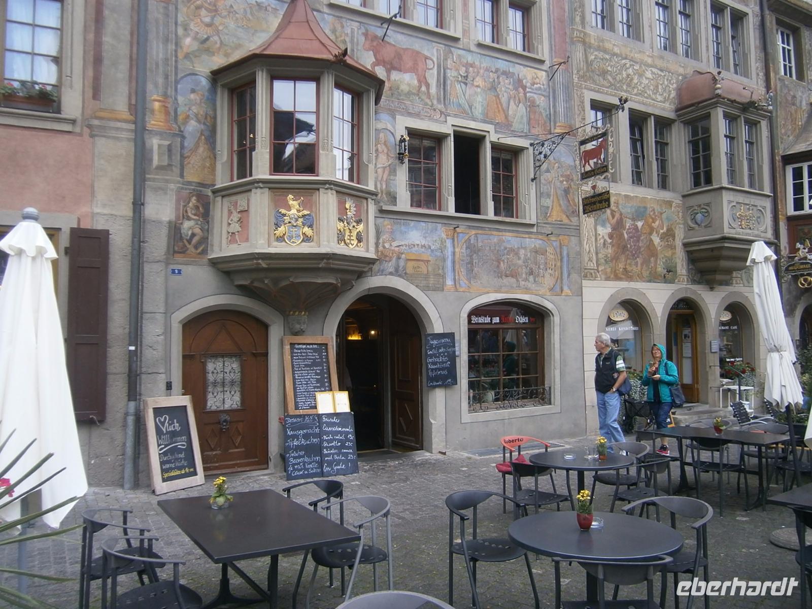Anschließend fuhren wir nach Stein am Rhein, dem viel besuchten „Rothenburg des Hochrheins". Hier am km 1 des Rheinlaufs, erzählen Häuser Geschichten. An den Fassaden findet man Darstellungen u.a. von David und Goliath, Diogenes mit dem Faß sowie Allegorien von Klugheit und Liebe, Krieg und Frieden. Im Zentrum, zwischen den beiden Stadttoren, kann man schön bummeln oder eine der zahlreichen Restaurants oder Cafe's aufsuchen. Das „Lindwurmmuseum" und das Klostermuseum „St. Georg" laden zum Besuch ein. Auch J.W.Goethe besuchte viermal diesen malerischen Ort.