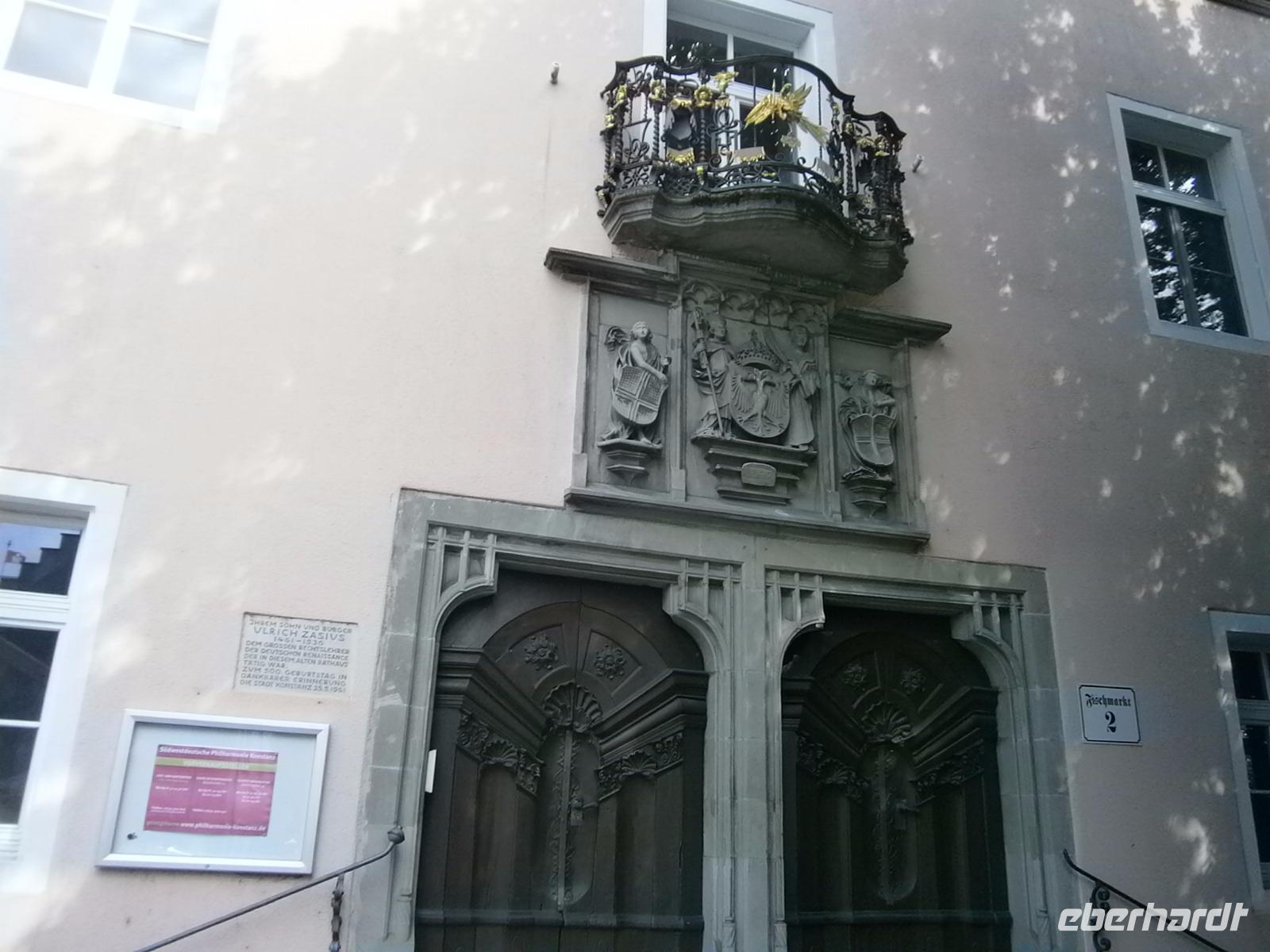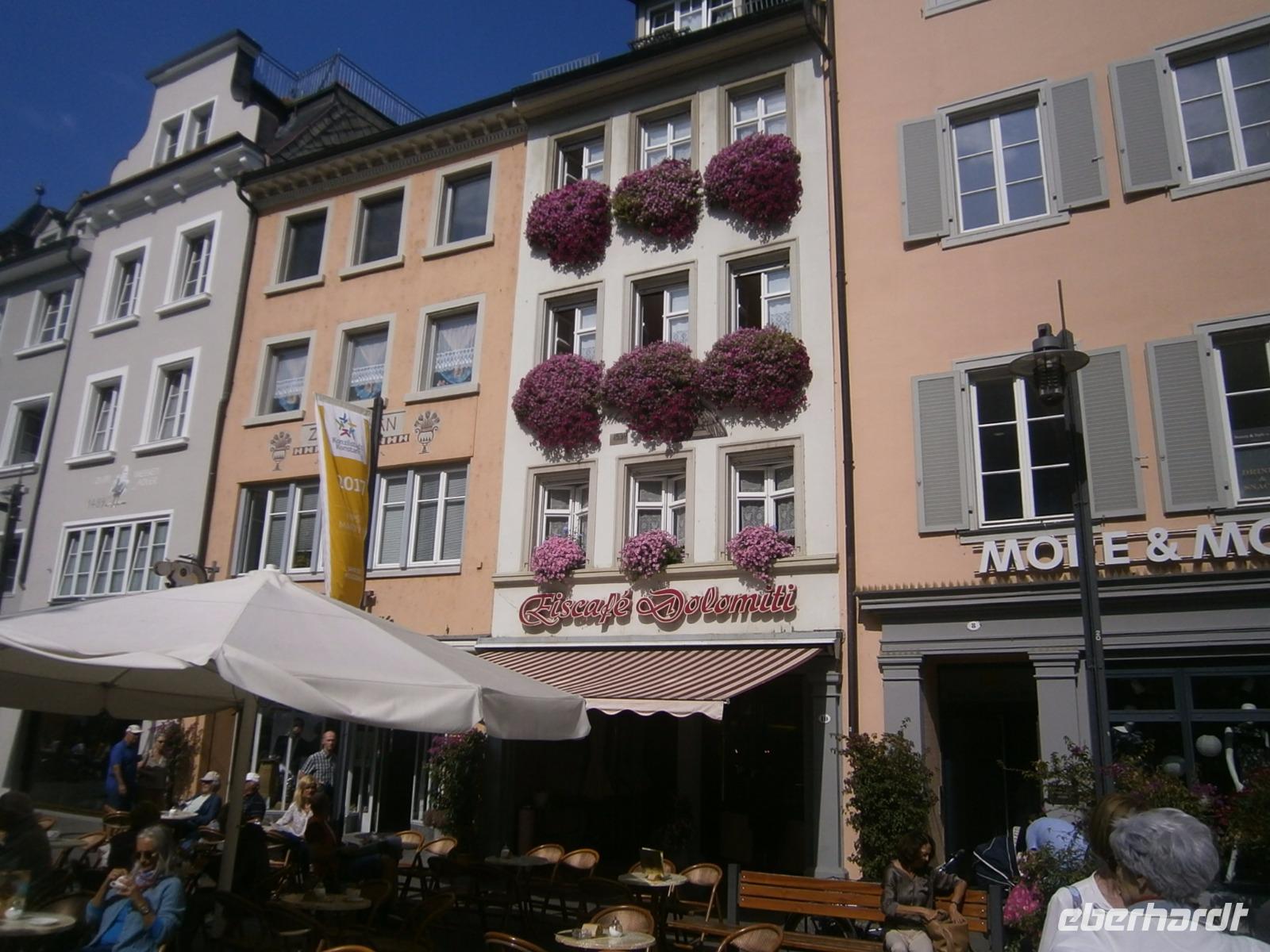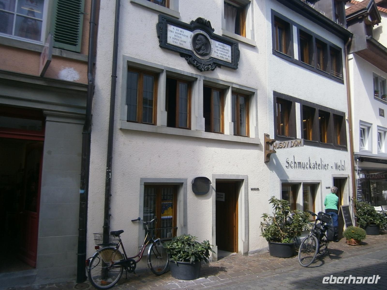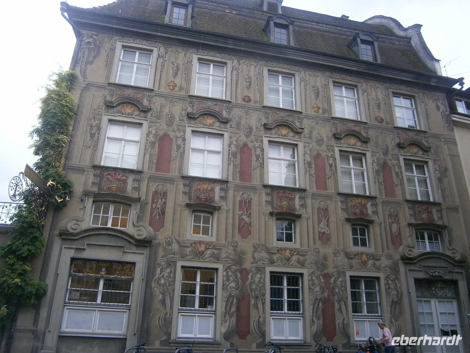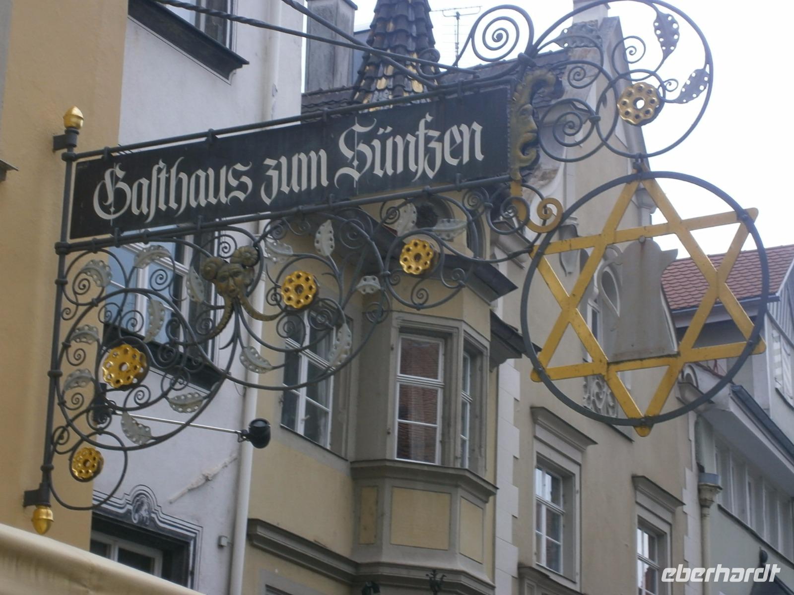 Anschließend fuhren wir nach Stein am Rhein, dem viel besuchten „Rothenburg des Hochrheins". Hier am km 1 des Rheinlaufs, erzählen Häuser Geschichten. An den Fassaden findet man Darstellungen u.a. von David und Goliath, Diogenes mit dem Faß sowie Allegorien von Klugheit und Liebe, Krieg und Frieden. Im Zentrum, zwischen den beiden Stadttoren, kann man schön bummeln oder eine der zahlreichen Restaurants oder Cafe's aufsuchen. Das „Lindwurmmuseum" und das Klostermuseum „St. Georg" laden zum Besuch ein. Auch J.W.Goethe besuchte viermal diesen malerischen Ort.