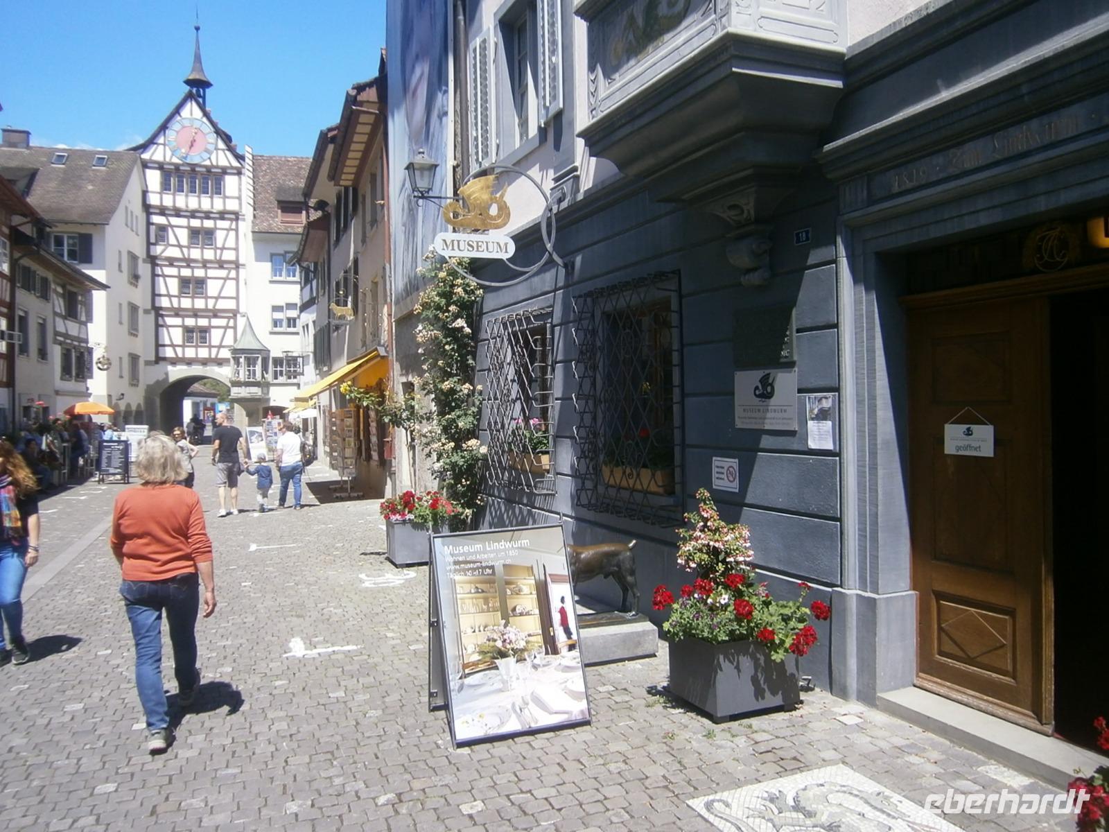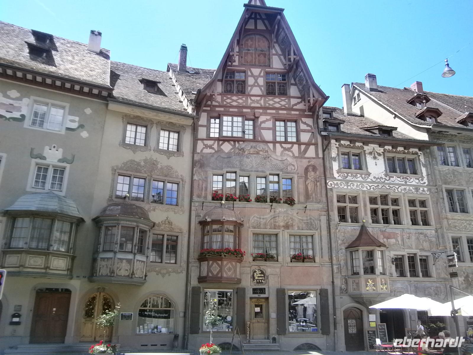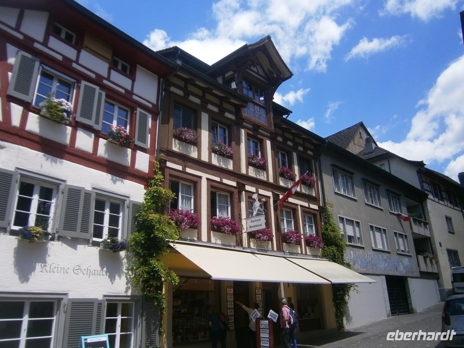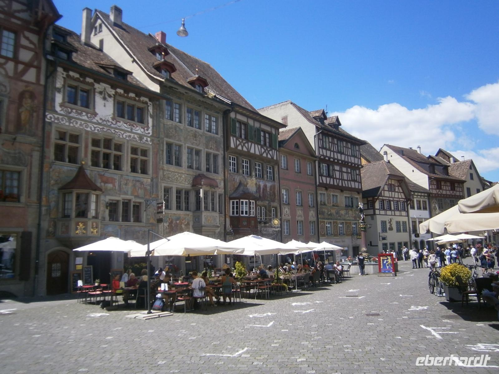 Anschließend fuhren wir nach Stein am Rhein, dem viel besuchten „Rothenburg des Hochrheins". Hier am km 1 des Rheinlaufs, erzählen Häuser Geschichten. An den Fassaden findet man Darstellungen u.a. von David und Goliath, Diogenes mit dem Faß sowie Allegorien von Klugheit und Liebe, Krieg und Frieden. Im Zentrum, zwischen den beiden Stadttoren, kann man schön bummeln oder eine der zahlreichen Restaurants oder Cafe's aufsuchen. Das „Lindwurmmuseum" und das Klostermuseum „St. Georg" laden zum Besuch ein. Auch J.W.Goethe besuchte viermal diesen malerischen Ort.