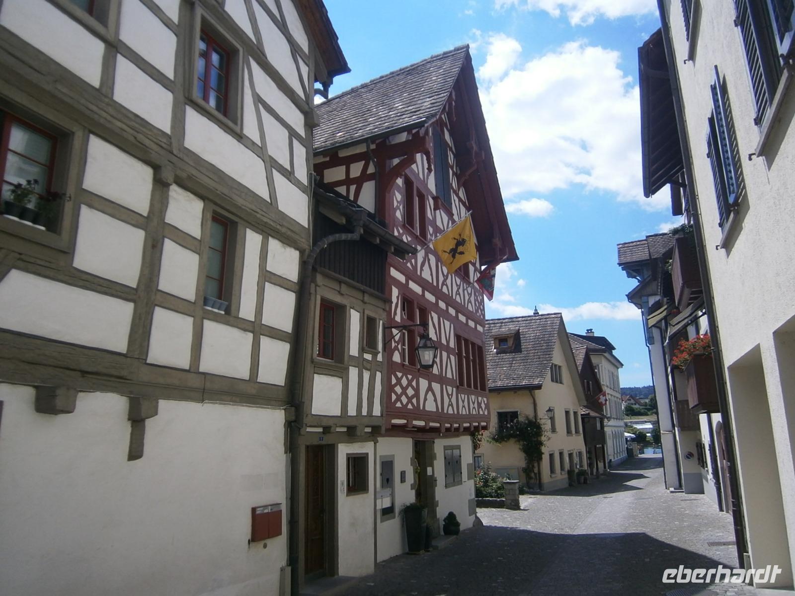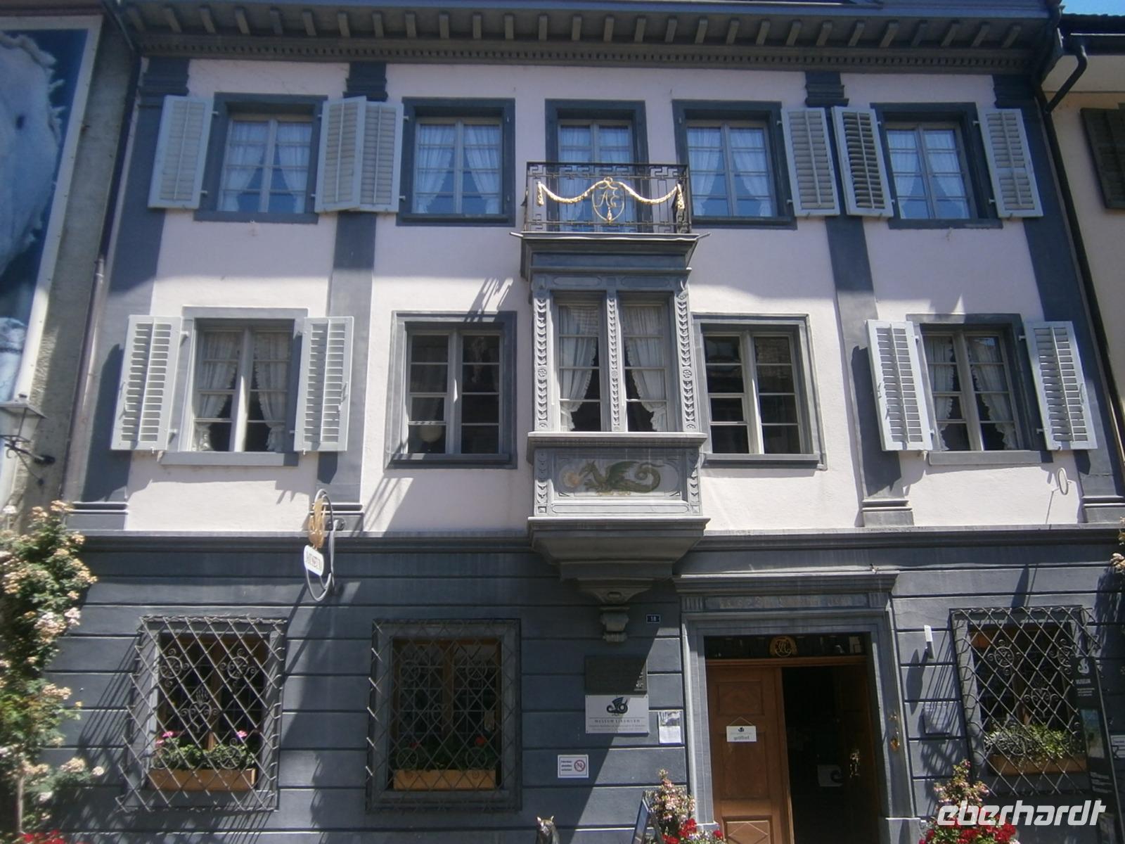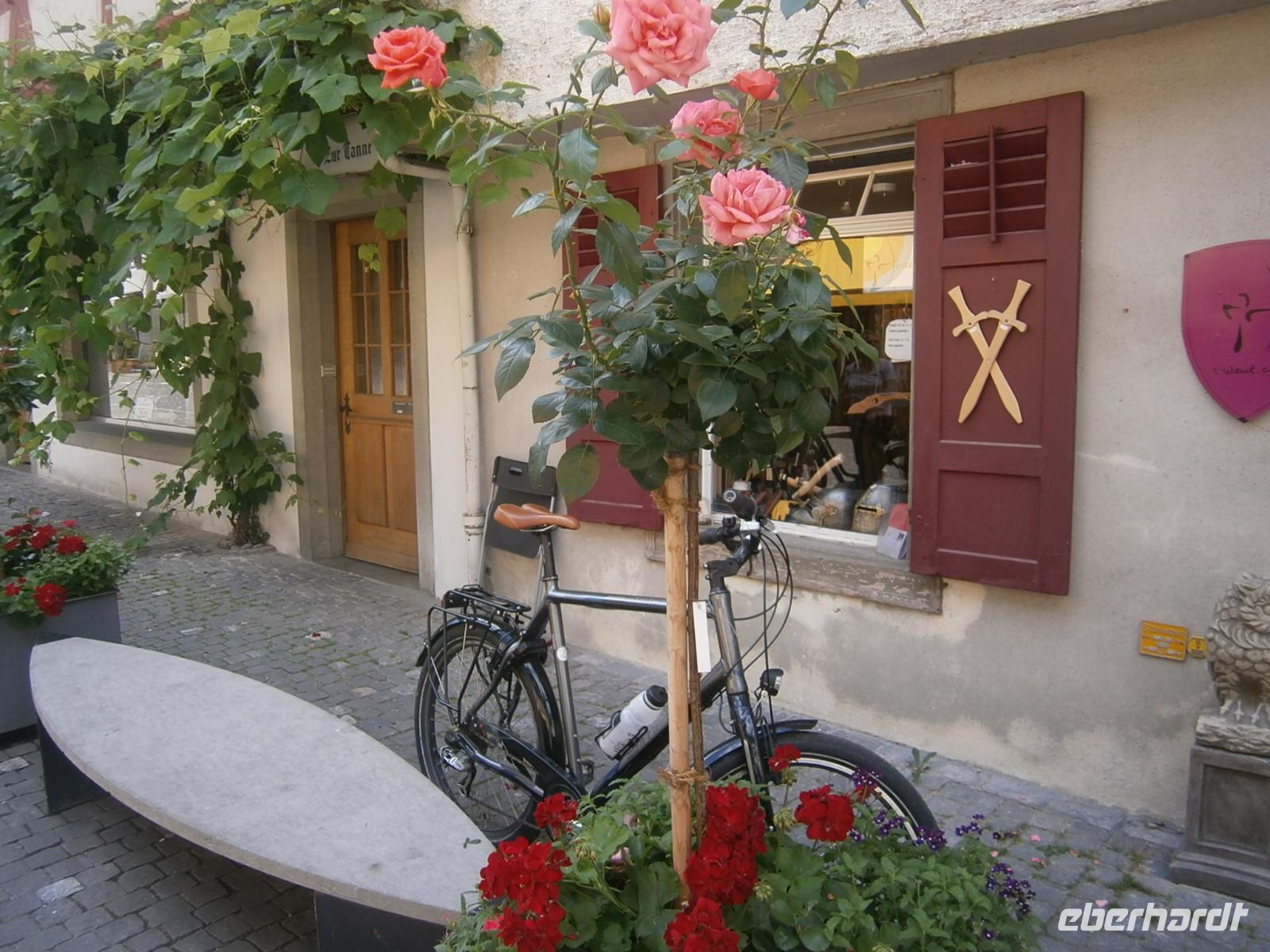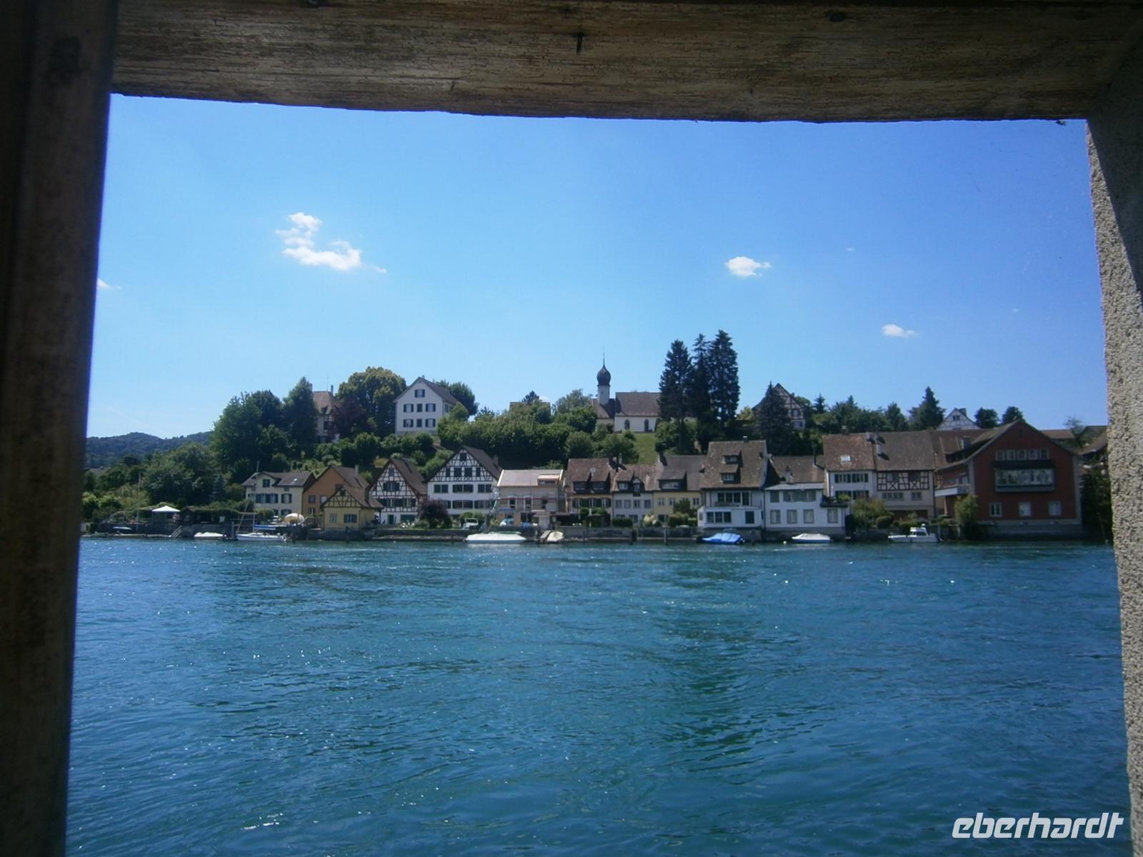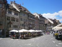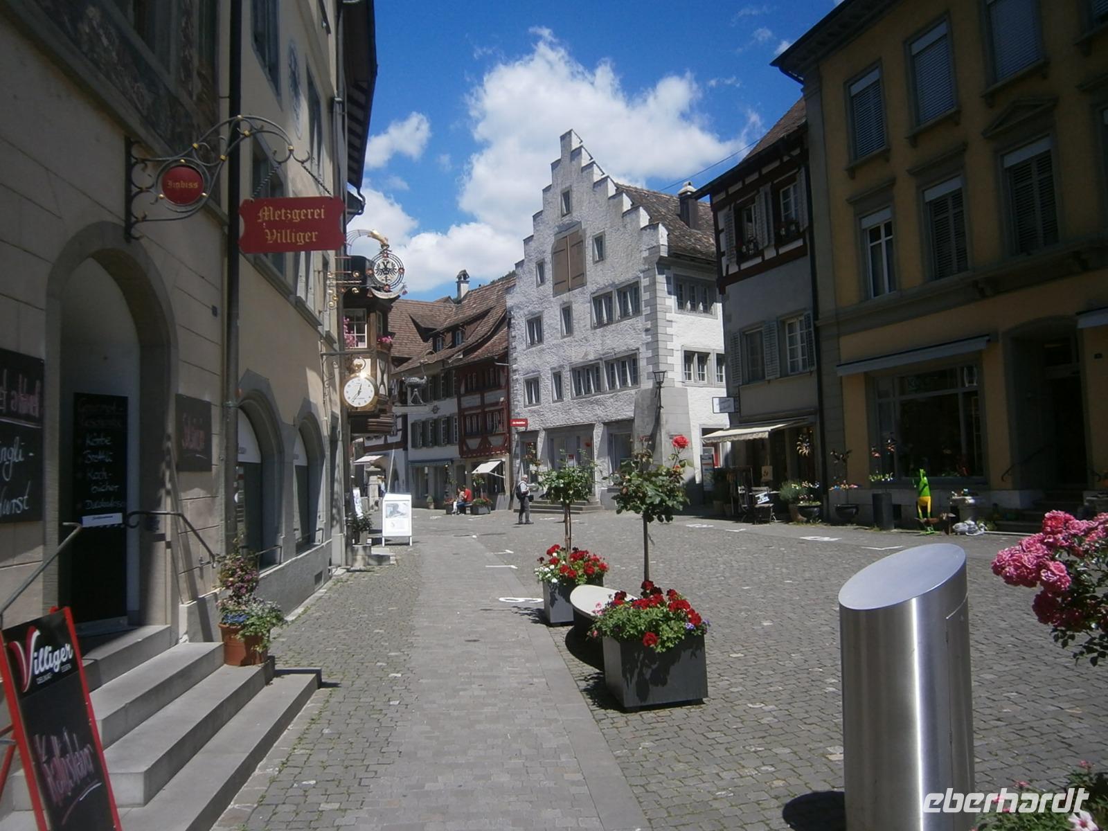 Anschließend fuhren wir nach Stein am Rhein, dem viel besuchten „Rothenburg des Hochrheins". Hier am km 1 des Rheinlaufs, erzählen Häuser Geschichten. An den Fassaden findet man Darstellungen u.a. von David und Goliath, Diogenes mit dem Faß sowie Allegorien von Klugheit und Liebe, Krieg und Frieden. Im Zentrum, zwischen den beiden Stadttoren, kann man schön bummeln oder eine der zahlreichen Restaurants oder Cafe's aufsuchen. Das „Lindwurmmuseum" und das Klostermuseum „St. Georg" laden zum Besuch ein. Auch J.W.Goethe besuchte viermal diesen malerischen Ort.