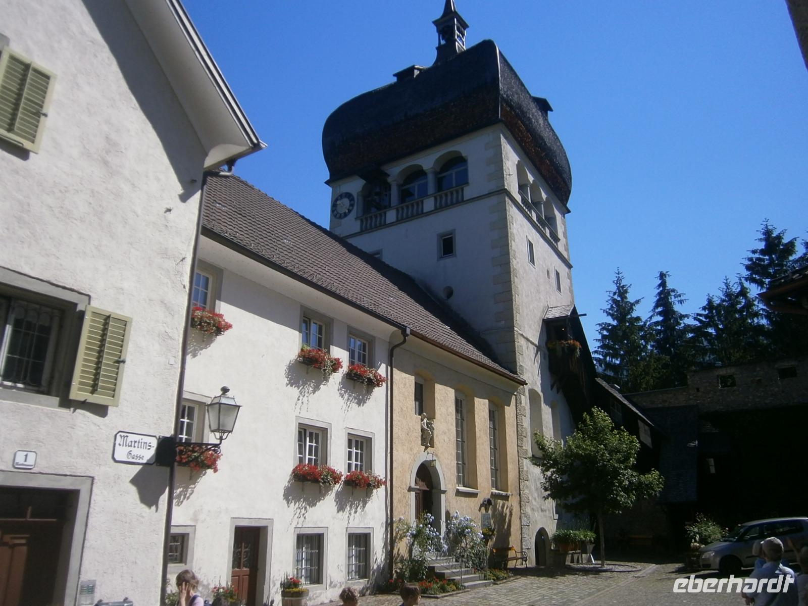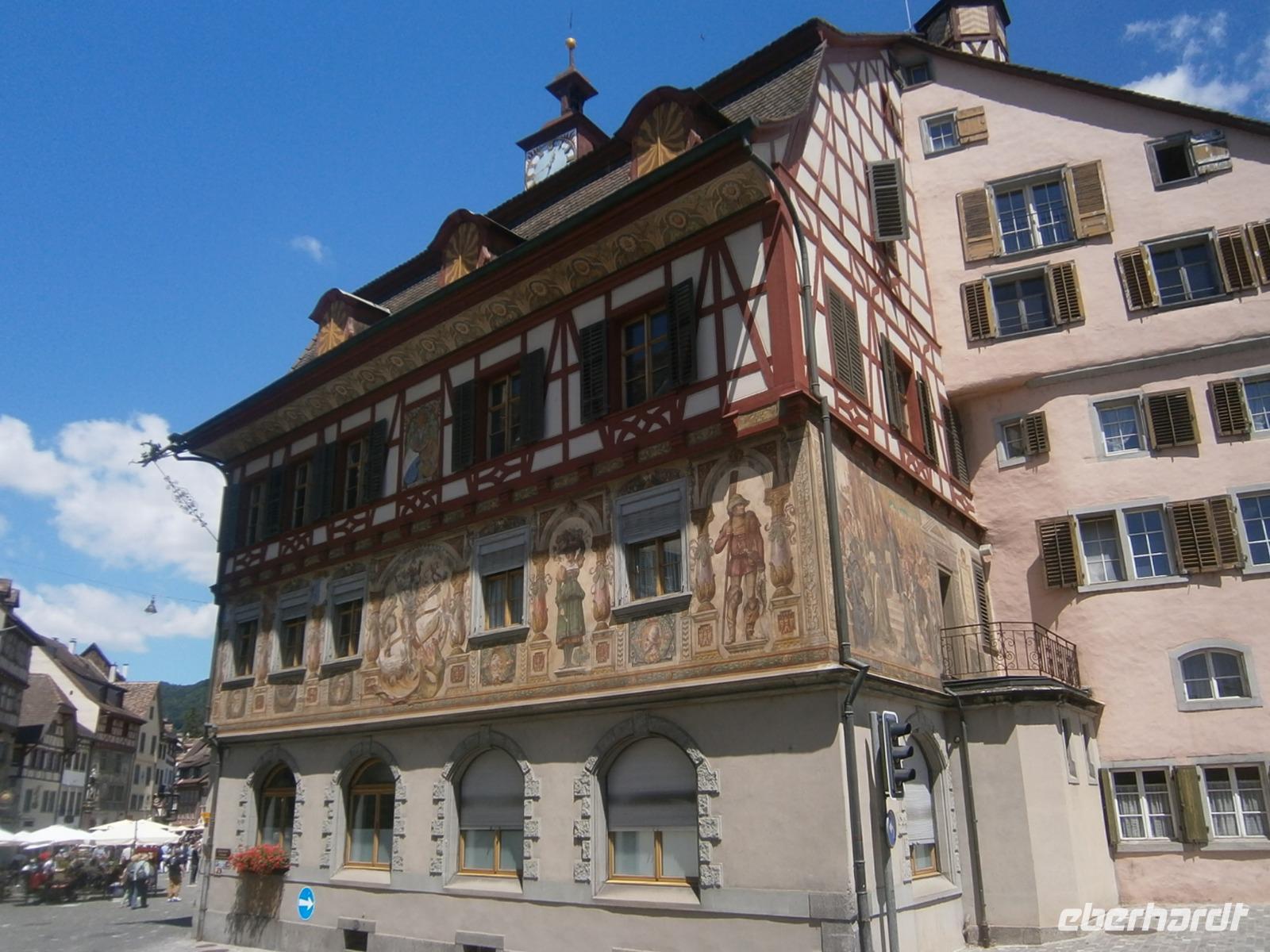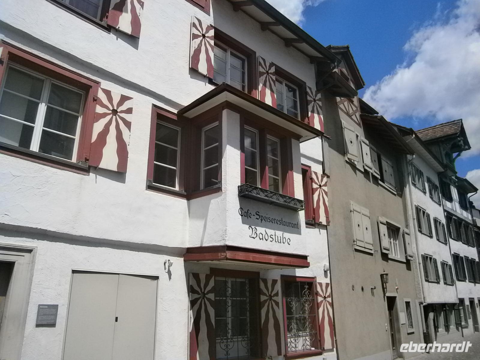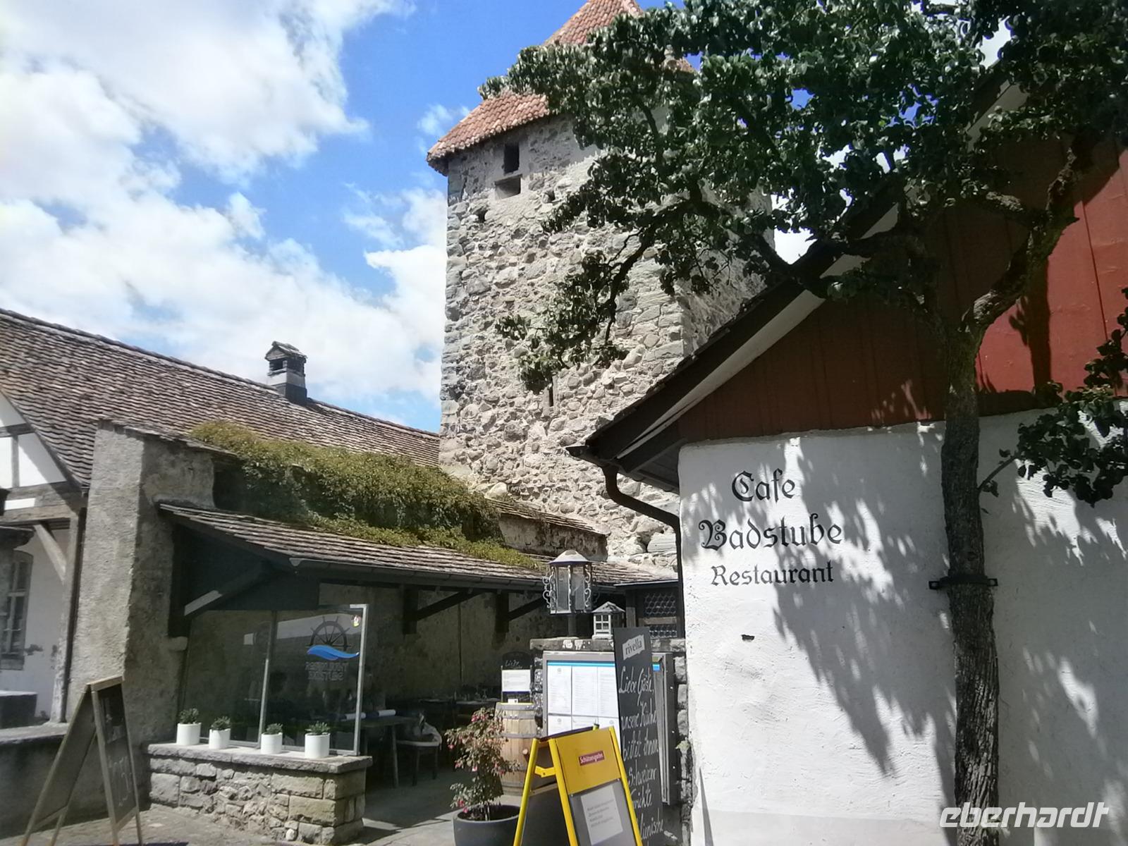 Anschließend fuhren wir nach Stein am Rhein, dem viel besuchten „Rothenburg des Hochrheins". Hier am km 1 des Rheinlaufs, erzählen Häuser Geschichten. An den Fassaden findet man Darstellungen u.a. von David und Goliath, Diogenes mit dem Faß sowie Allegorien von Klugheit und Liebe, Krieg und Frieden. Im Zentrum, zwischen den beiden Stadttoren, kann man schön bummeln oder eine der zahlreichen Restaurants oder Cafe's aufsuchen. Das „Lindwurmmuseum" und das Klostermuseum „St. Georg" laden zum Besuch ein. Auch J.W.Goethe besuchte viermal diesen malerischen Ort.