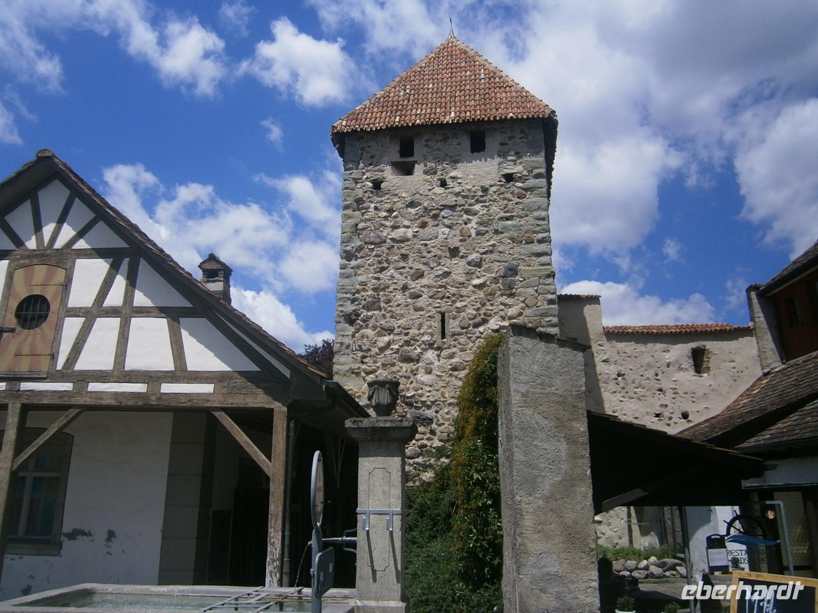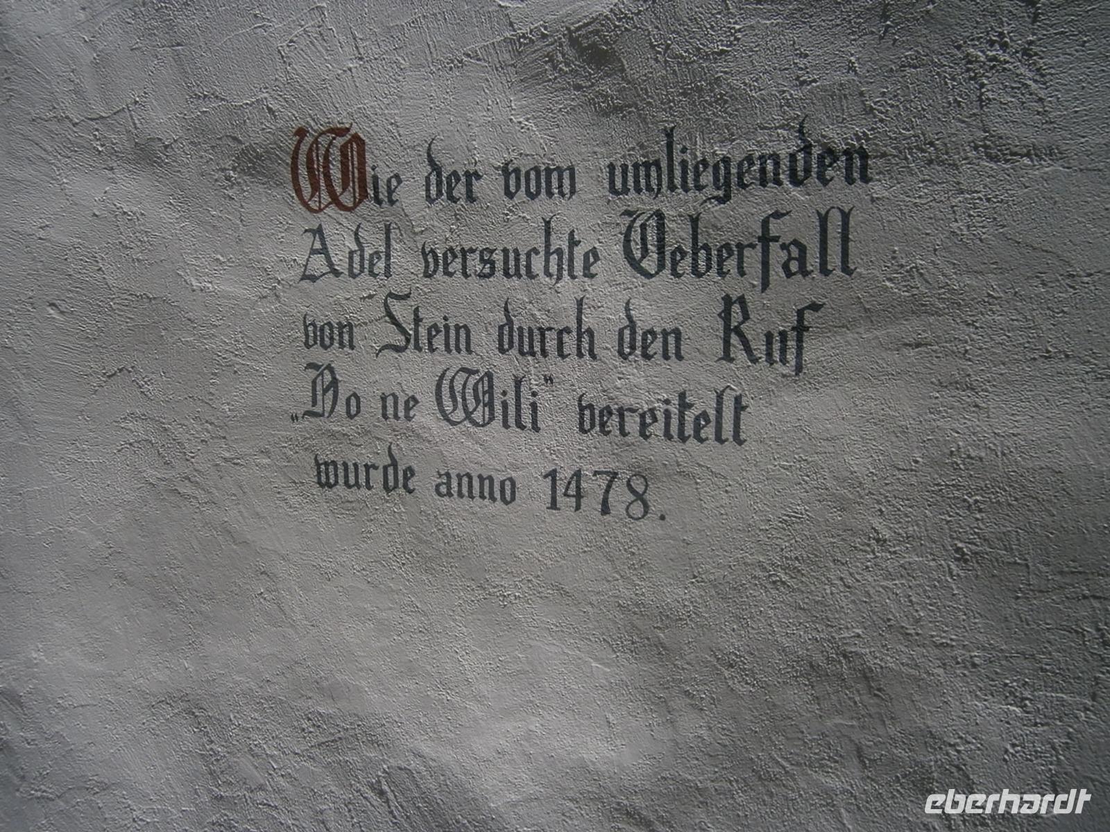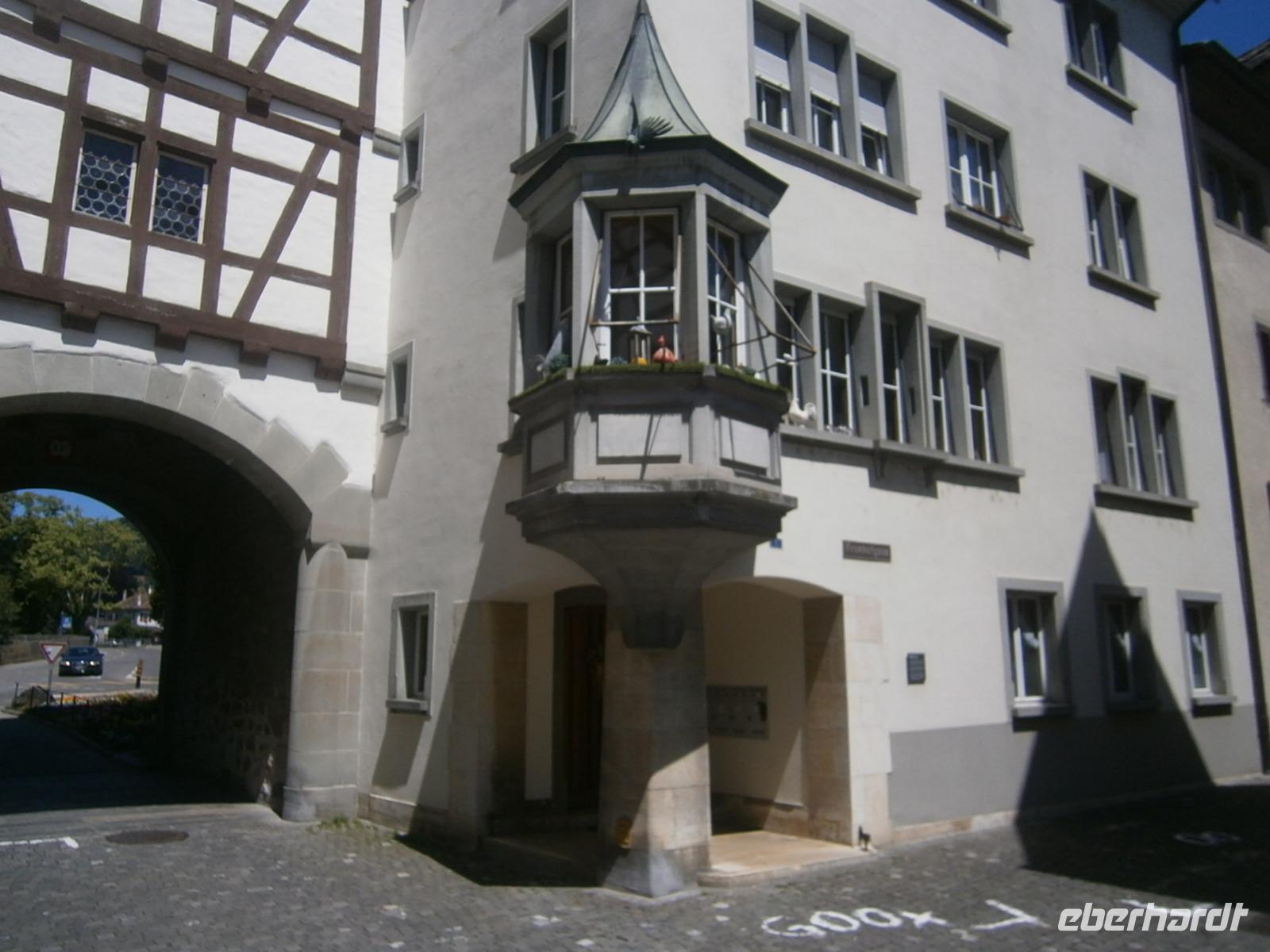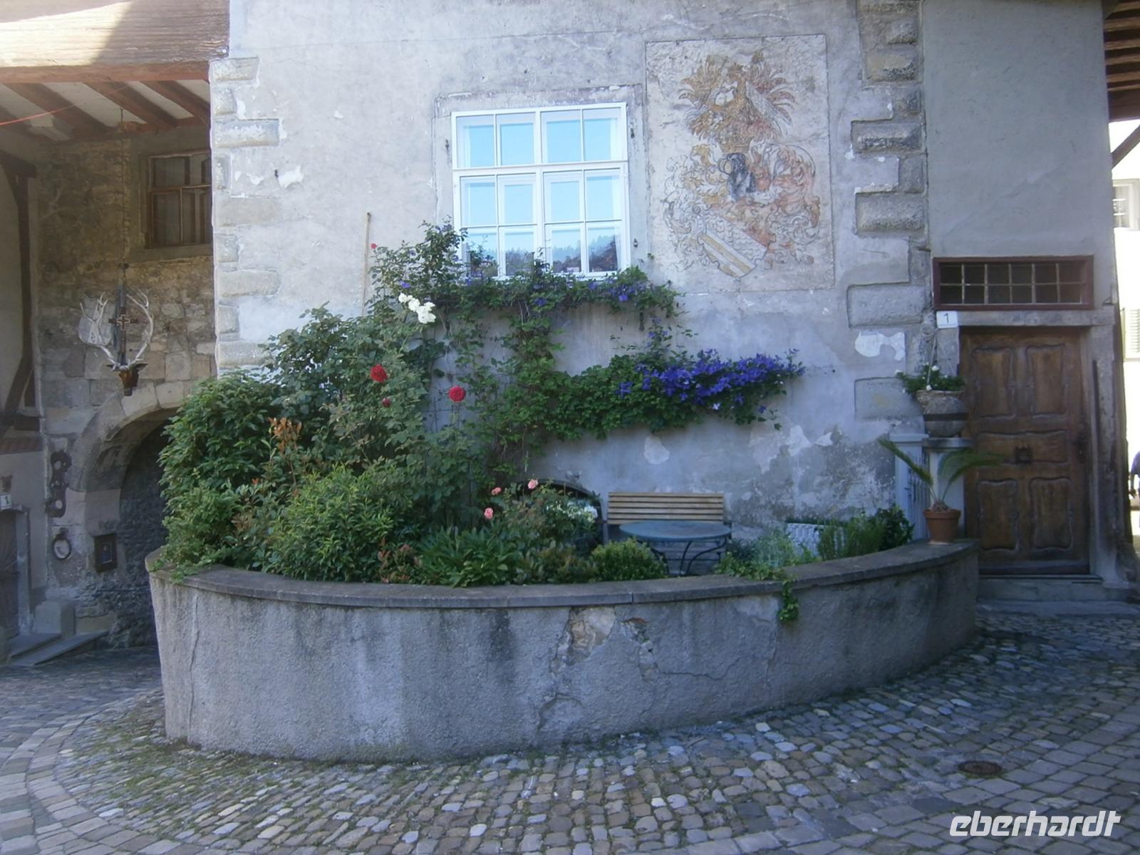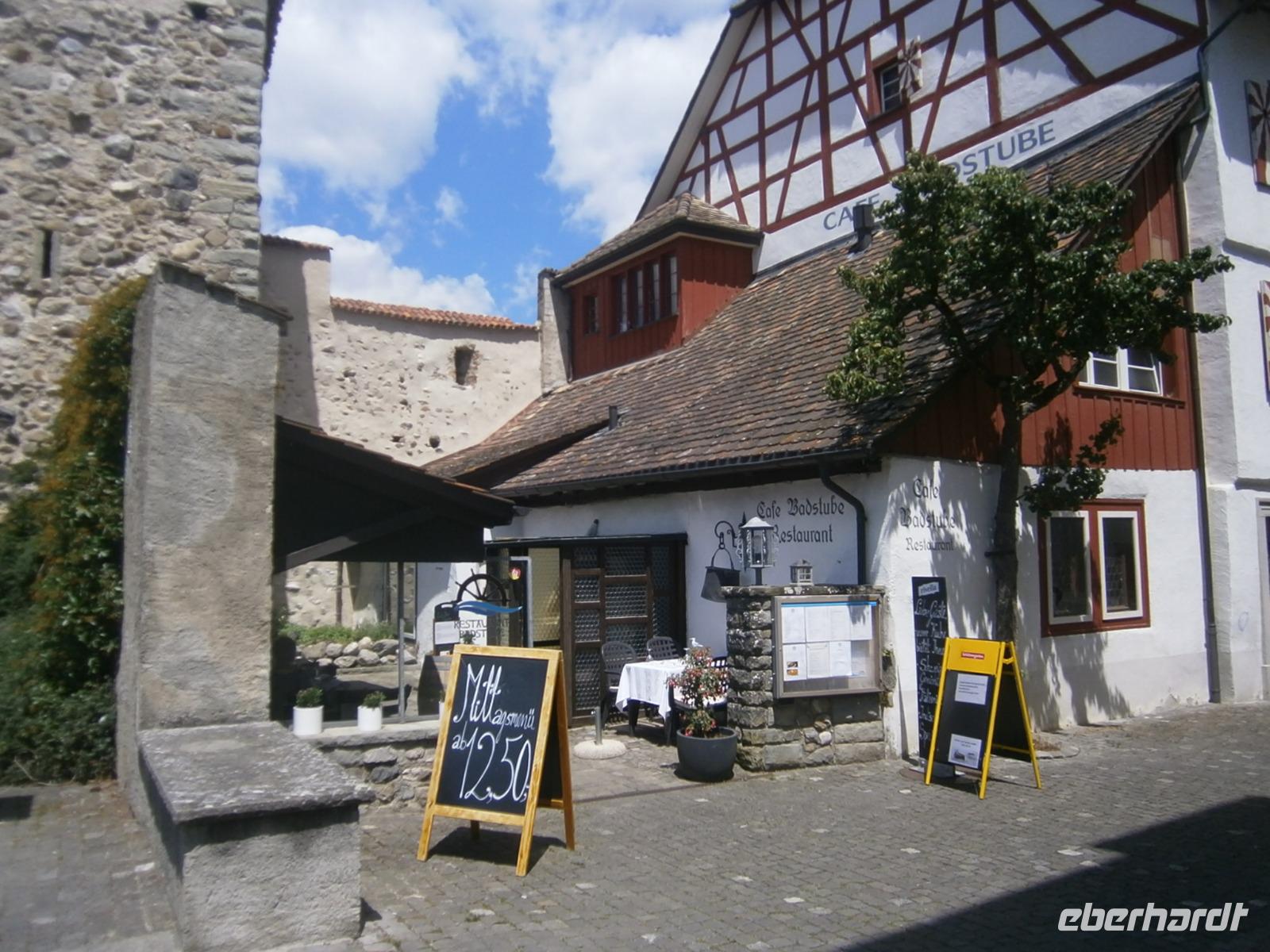 Anschließend fuhren wir nach Stein am Rhein, dem viel besuchten „Rothenburg des Hochrheins". Hier am km 1 des Rheinlaufs, erzählen Häuser Geschichten. An den Fassaden findet man Darstellungen u.a. von David und Goliath, Diogenes mit dem Faß sowie Allegorien von Klugheit und Liebe, Krieg und Frieden. Im Zentrum, zwischen den beiden Stadttoren, kann man schön bummeln oder eine der zahlreichen Restaurants oder Cafe's aufsuchen. Das „Lindwurmmuseum" und das Klostermuseum „St. Georg" laden zum Besuch ein. Auch J.W.Goethe besuchte viermal diesen malerischen Ort.