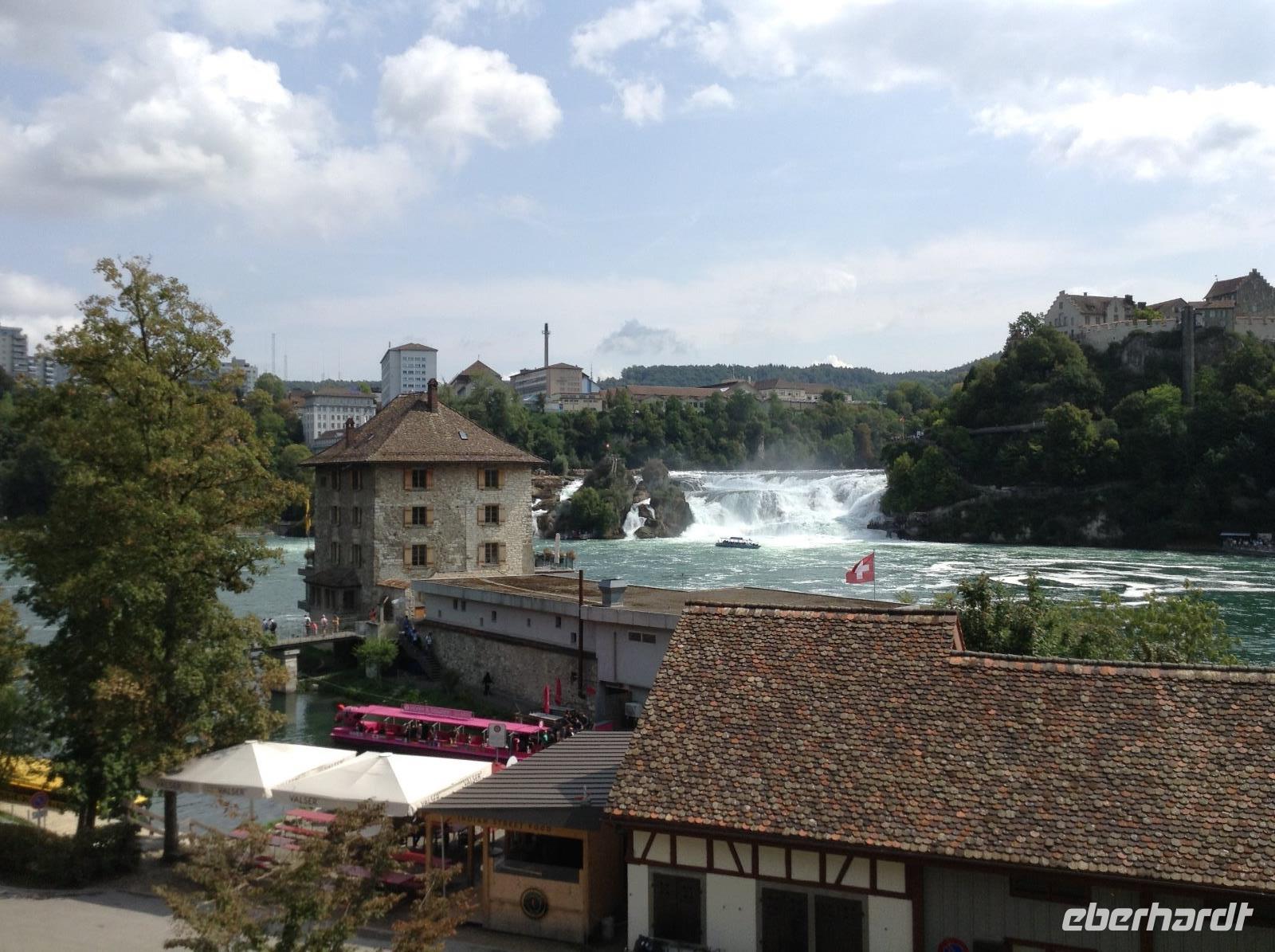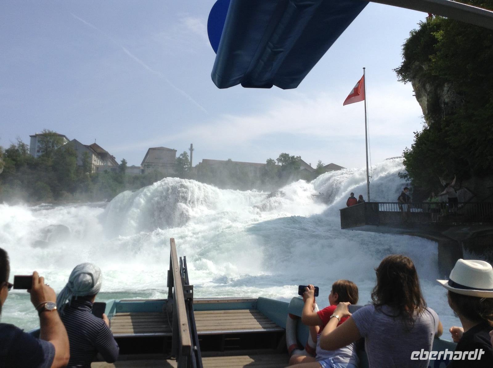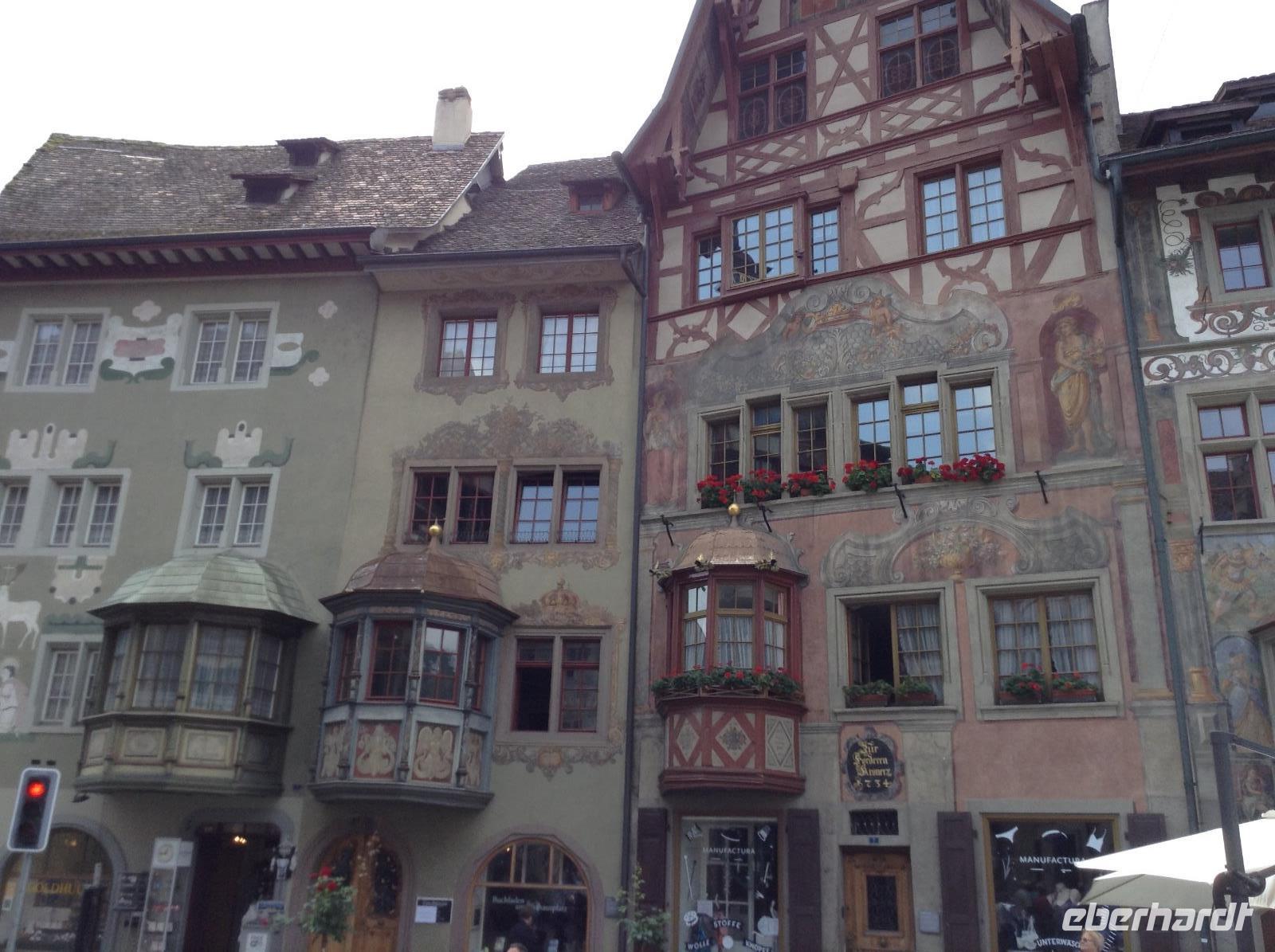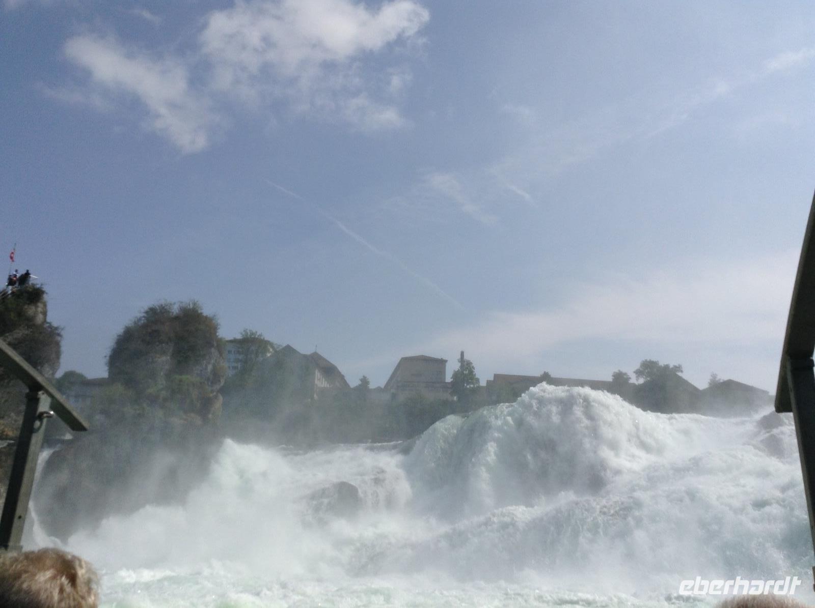 Wieder durch die Schweiz war unsere Anreise, diesmal etwas weiter im Hinterland über Winterthur. Wir erreichten den legendären Wasserfall, das Wetter war etwas durchwachsen, aber doch trocken. Höhepunkt beim Besuch am Wasserfall war die kleine Bootsfahrt, die es als Wow für alle spendiert gab. Wir mußten etwas warten, ehe wir als Gruppe fahren konnten, aber das Erlebnis war es wirklich wert. Ganz dicht erlebten wir, wie sich die Wassermassen des Rhein-Flusses da über 23 Meter in die Tiefe stürzten. Ein tolles Erlebnis. Dan fuhren wir weiter nach Stein am Rhein, dort, wo der Rhein den Bodensee wieder verläßt. Uns erwartete eine wunderschöne alte Stadt, die Häuser mit Lüftelmalerei und altem Fachwerk. Es war Zeit genug zum Genießen, Essen, Bummeln, Anstaunen.