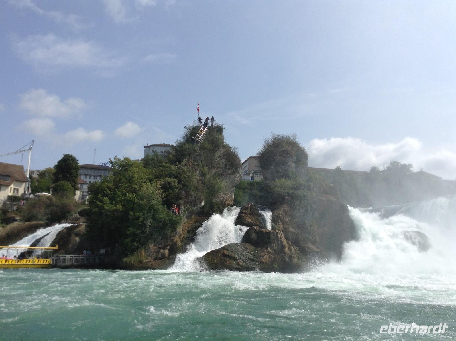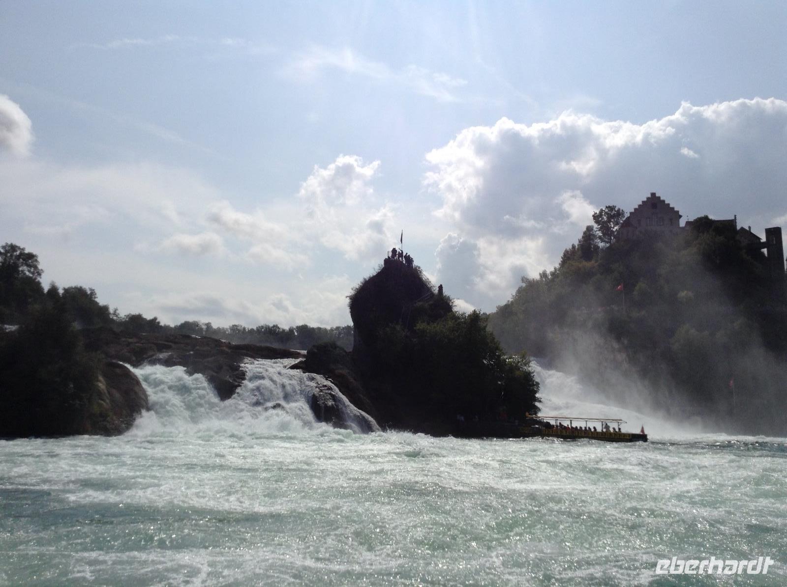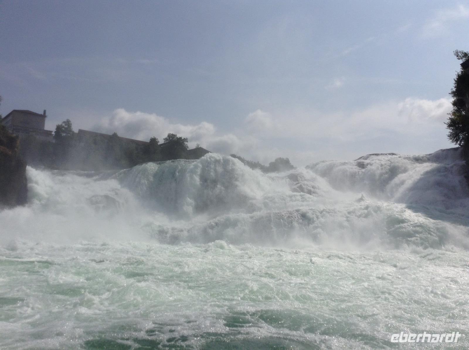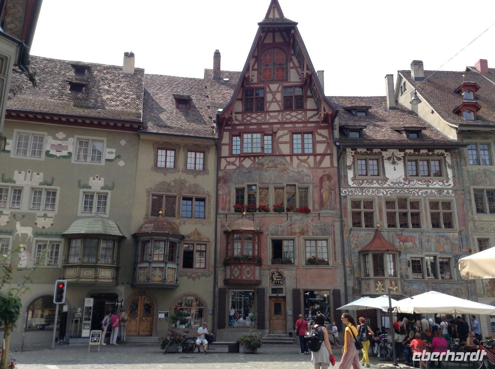 Wieder durch die Schweiz war unsere Anreise, diesmal etwas weiter im Hinterland über Winterthur. Wir erreichten den legendären Wasserfall, das Wetter war etwas durchwachsen, aber doch trocken. Höhepunkt beim Besuch am Wasserfall war die kleine Bootsfahrt, die es als Wow für alle spendiert gab. Wir mußten etwas warten, ehe wir als Gruppe fahren konnten, aber das Erlebnis war es wirklich wert. Ganz dicht erlebten wir, wie sich die Wassermassen des Rhein-Flusses da über 23 Meter in die Tiefe stürzten. Ein tolles Erlebnis. Dan fuhren wir weiter nach Stein am Rhein, dort, wo der Rhein den Bodensee wieder verläßt. Uns erwartete eine wunderschöne alte Stadt, die Häuser mit Lüftelmalerei und altem Fachwerk. Es war Zeit genug zum Genießen, Essen, Bummeln, Anstaunen.