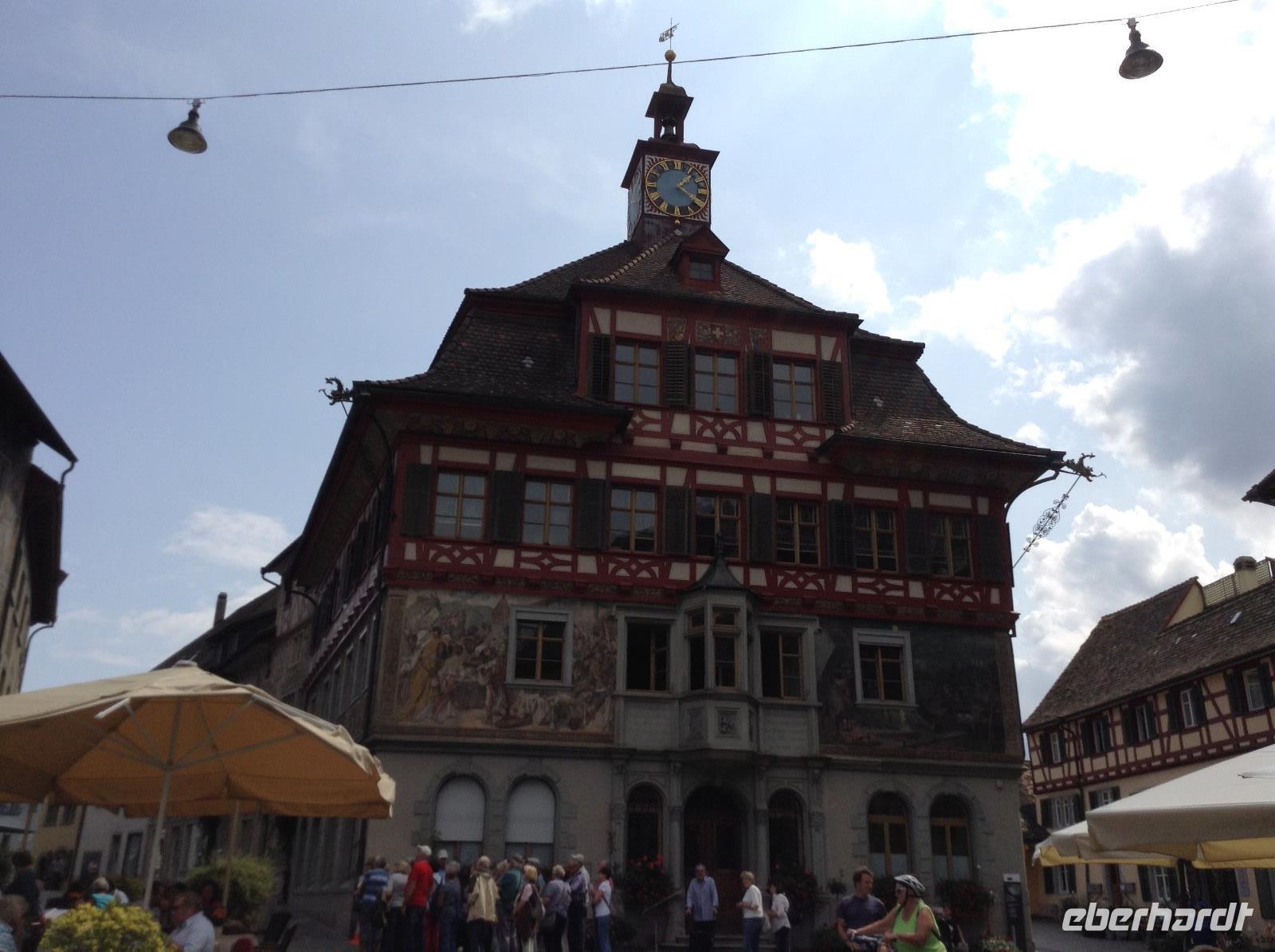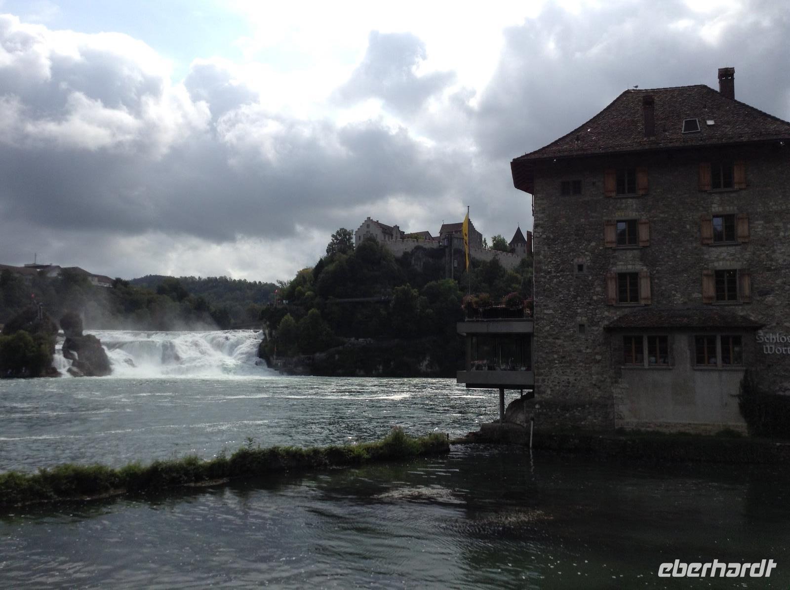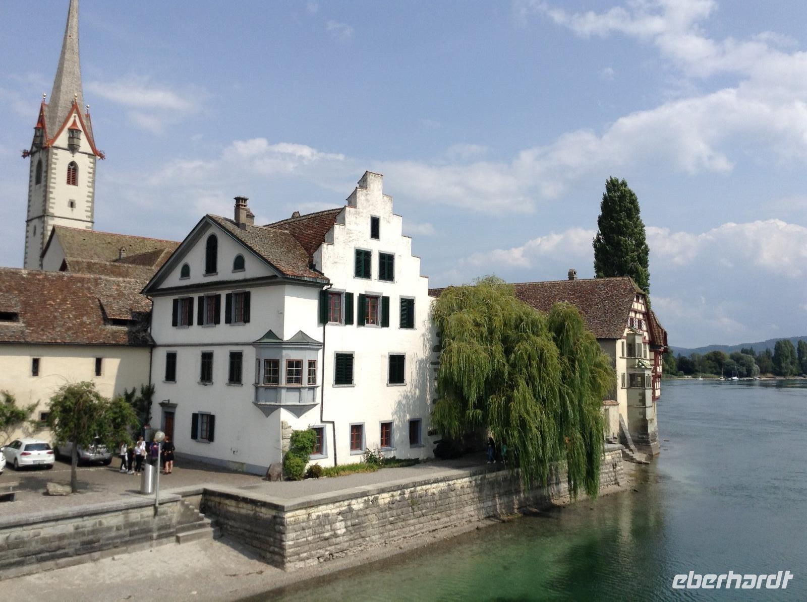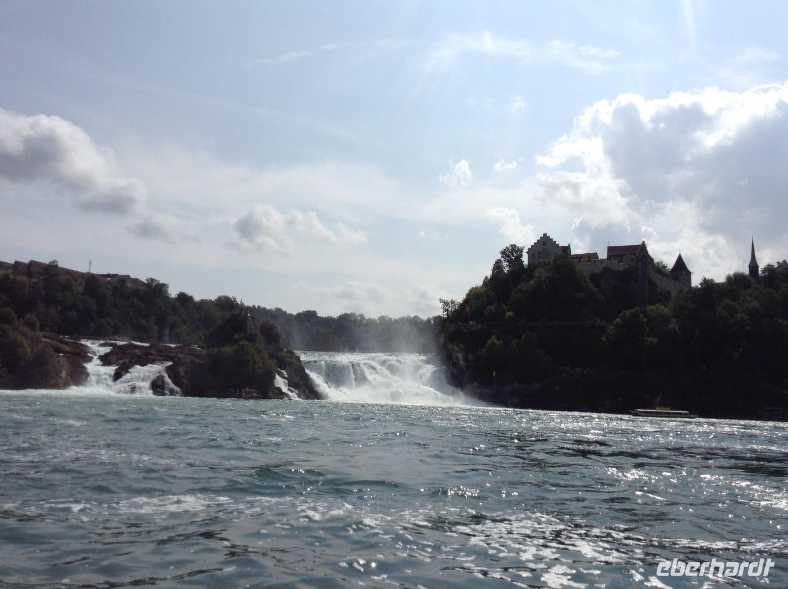 Wieder durch die Schweiz war unsere Anreise, diesmal etwas weiter im Hinterland über Winterthur. Wir erreichten den legendären Wasserfall, das Wetter war etwas durchwachsen, aber doch trocken. Höhepunkt beim Besuch am Wasserfall war die kleine Bootsfahrt, die es als Wow für alle spendiert gab. Wir mußten etwas warten, ehe wir als Gruppe fahren konnten, aber das Erlebnis war es wirklich wert. Ganz dicht erlebten wir, wie sich die Wassermassen des Rhein-Flusses da über 23 Meter in die Tiefe stürzten. Ein tolles Erlebnis. Dan fuhren wir weiter nach Stein am Rhein, dort, wo der Rhein den Bodensee wieder verläßt. Uns erwartete eine wunderschöne alte Stadt, die Häuser mit Lüftelmalerei und altem Fachwerk. Es war Zeit genug zum Genießen, Essen, Bummeln, Anstaunen.