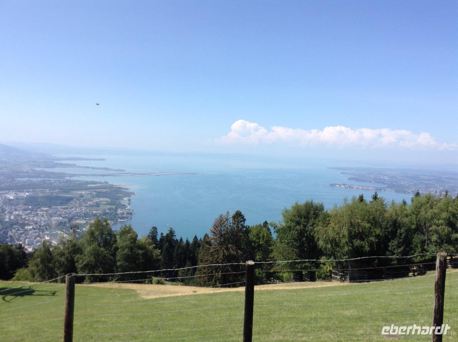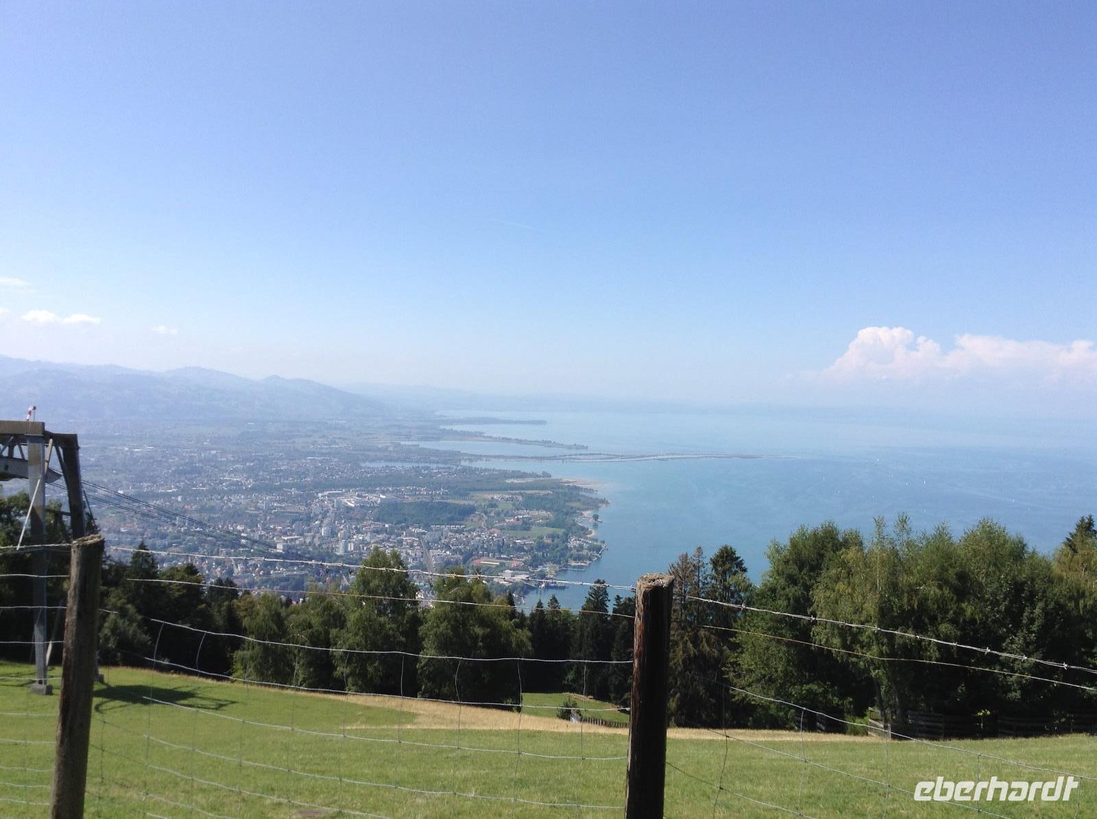 Oben angekommen, lohnte sich die Aussicht allemal, auch wenn an diesem Tag die Aussicht nicht ganz klar war. Die Bregenzer Berge, Vorarlberg, das Appenzeller Land und natürlich der See, alles lag vor uns und wir genossen eine fantastische Aussicht. Wer Lust hatte, konnte ein wenig zu Fuß erkunden, oder gar hinunter wandern..., oder man ließ sich zu Kaffee und Kuchen auf der wunderbaren Terrasse des Gipfelrestaurants nieder. Jeder wie und was er wollte. Am späten Nachmittag holte unser Bus alle Reisegäste wieder aus der Stadt ab.