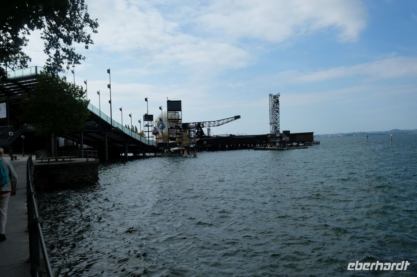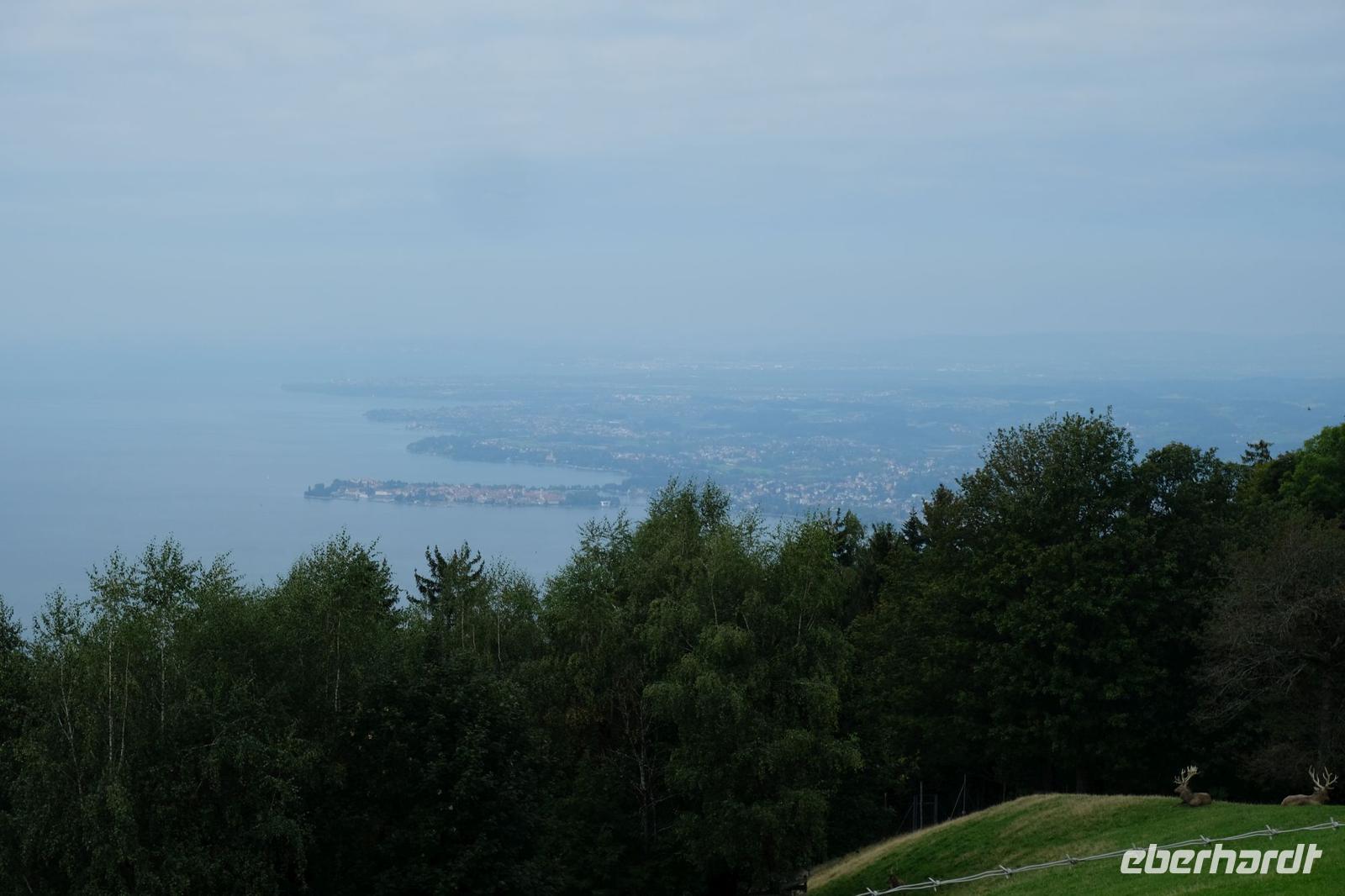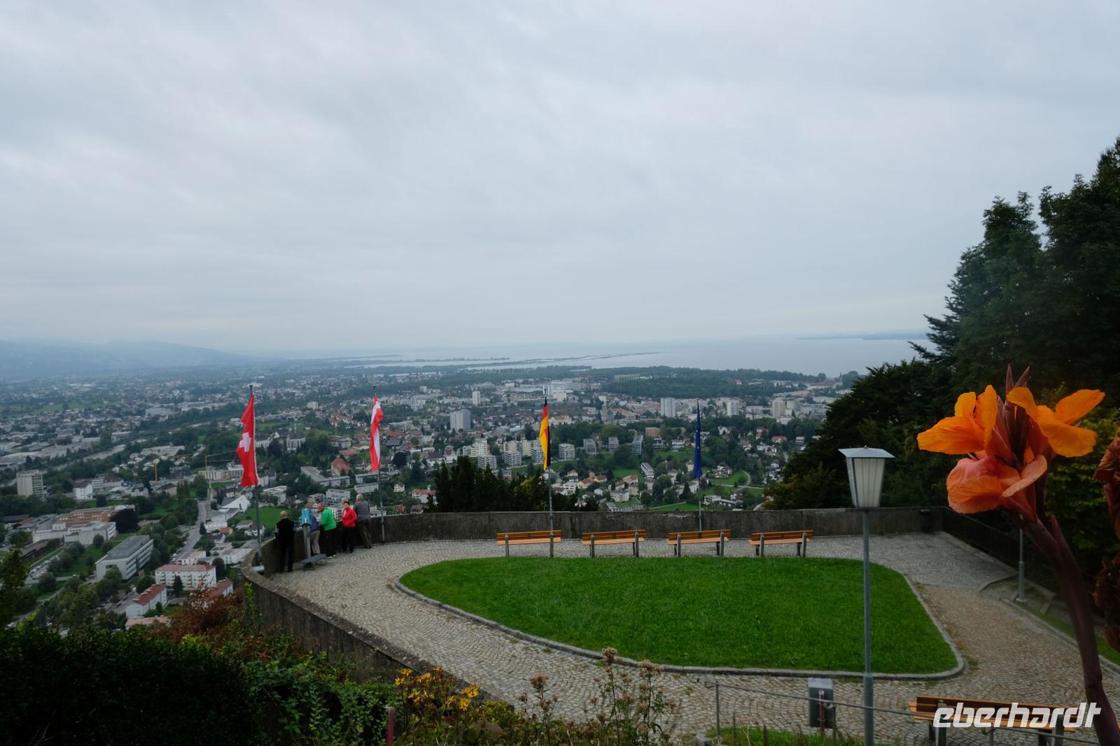 Oben angekommen, lohnte sich die Aussicht allemal, auch wenn an diesem Tag die Aussicht trotz Sonnenschein etwas trüb war. Die Bregenzer Berge, Vorarlberg, das Appenzeller Land und natürlich der See, alles lag vor uns und wir genossen eine fantastische Aussicht. Wer Lust hatte, konnte den Berg zu Fuß erkunden, oder man ließ sich zu Kaffee und Kuchen auf der wunderbaren Terrasse des Gipfelrestaurants nieder. Jeder nach seinen eigenen Wünschen. Am Nachmittag fuhr unser Fahrer Frank einige Reisegäste wieder ins Hotel, mit den Übrigen bin ich durch die Stadt (Seebühne) gelaufen.