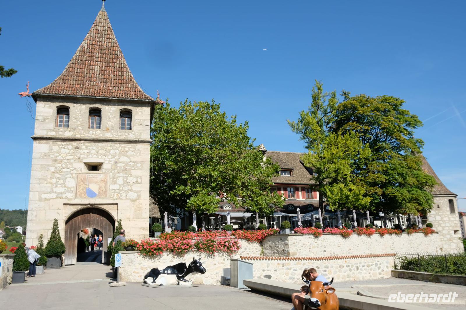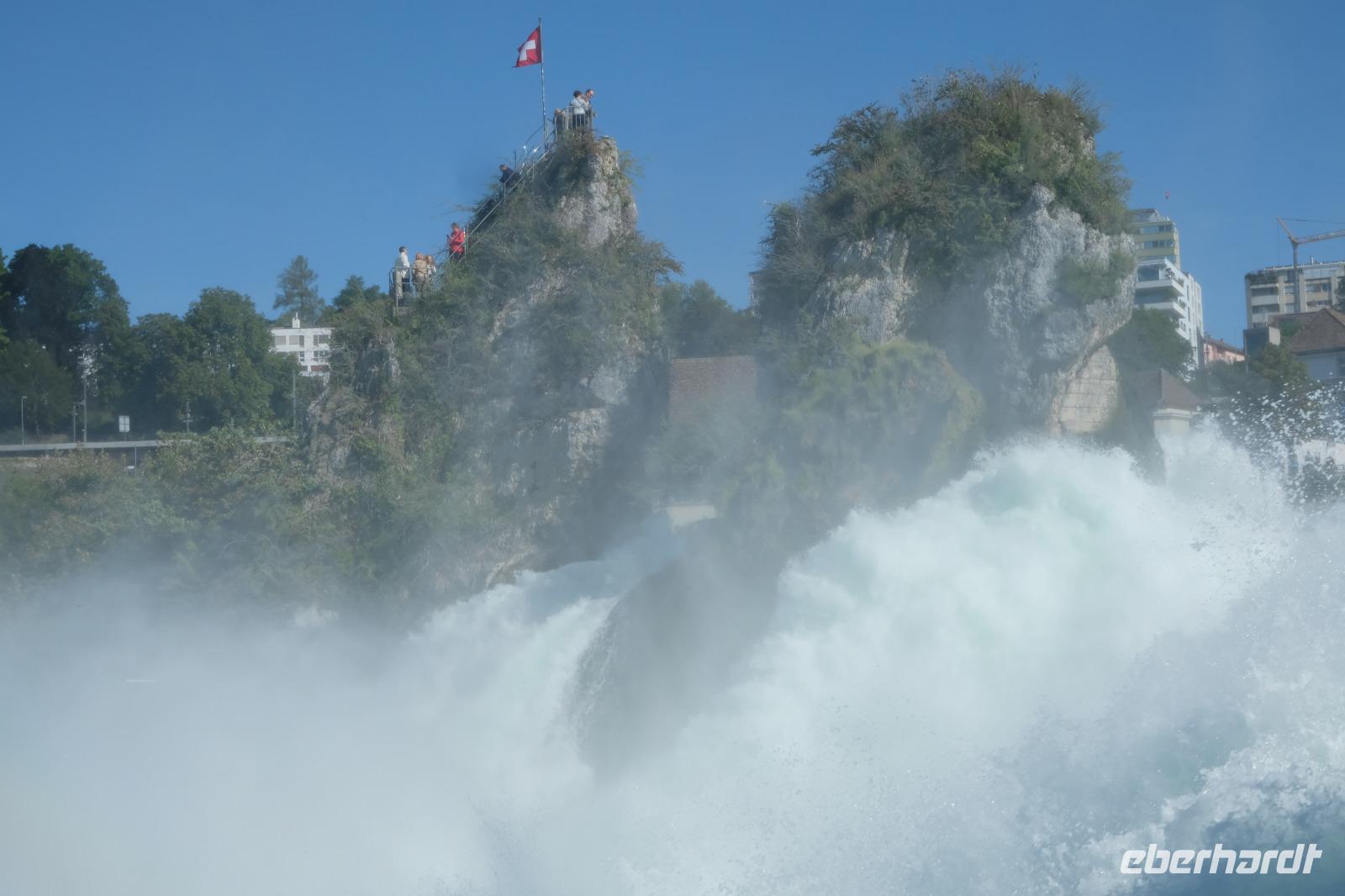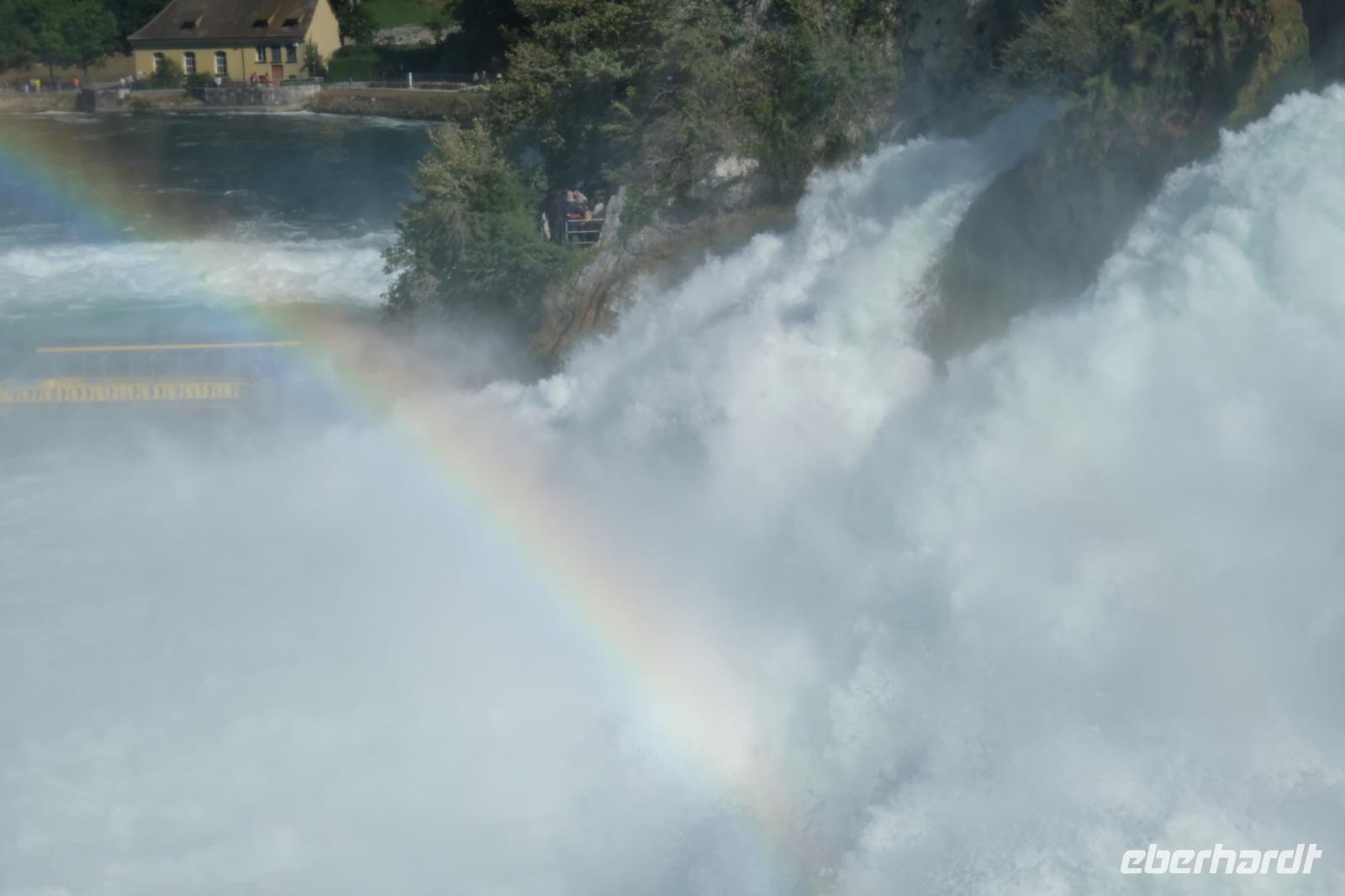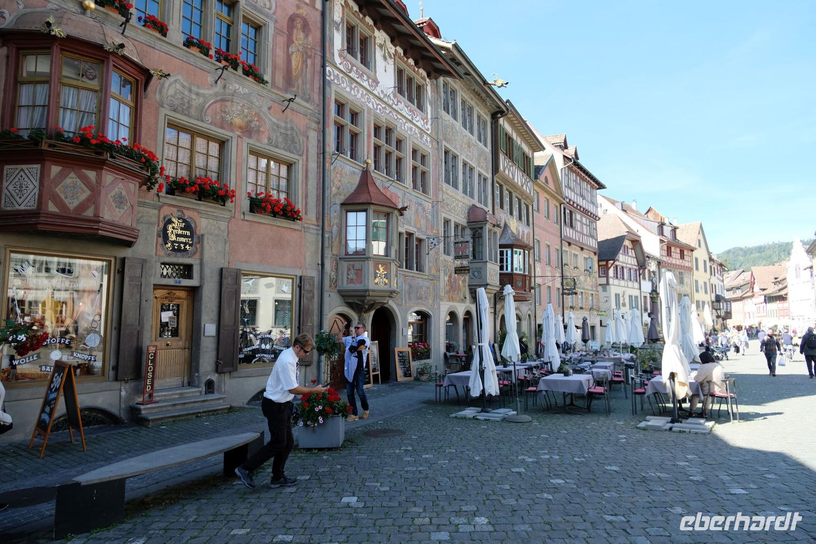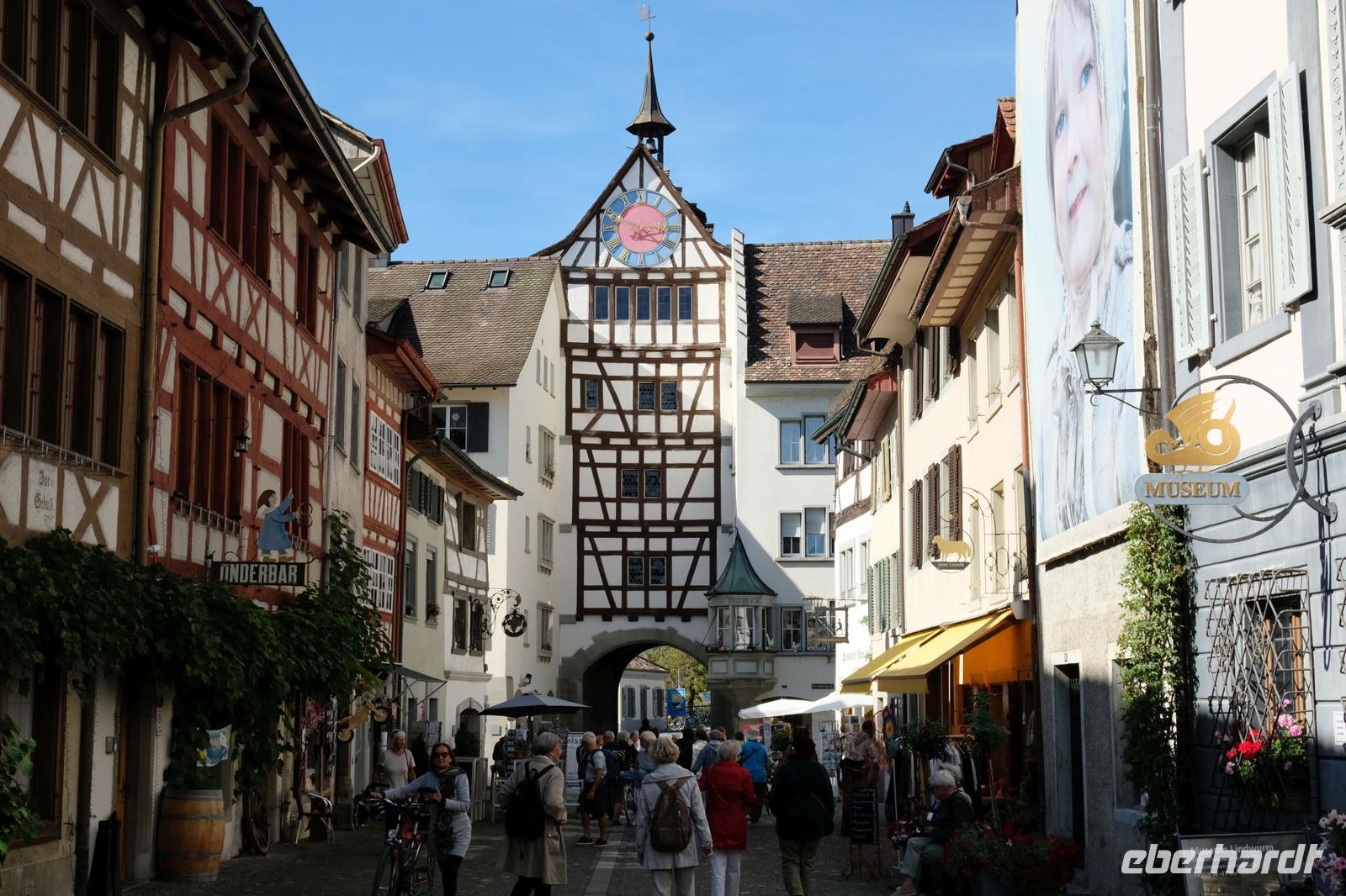 Heute fuhr unser Fahrer Frank eine andere Streck durch die Schweiz, um schneller am Wasserfall zu sein. Wir erreichten bei Schloß Laufen den legendären Rheinfall, und dazu schien auch noch die Sonne. Die Wassermassen stürzen an dieser Stelle über 23 Meter in die Tiefe, es waren imposante Bilder. Dann fuhren wir weiter nach Stein am Rhein, dort, wo der Rhein den Bodensee wieder verlässt und in Richtung Nordsee fliest. Uns erwartete eine wunderschöne alte Stadt mit einem gut erhaltenem Altstadtkern und viel Lüftlmalerei an alten Fachwerkhäusern. Das lud unmittelbar zum Verweilen und einer guten Tasse Kaffee ein. Am Nachmittag fuhren wir aufgrund von Baustellen wieder über die Autobahn zurück nach Bregenz.